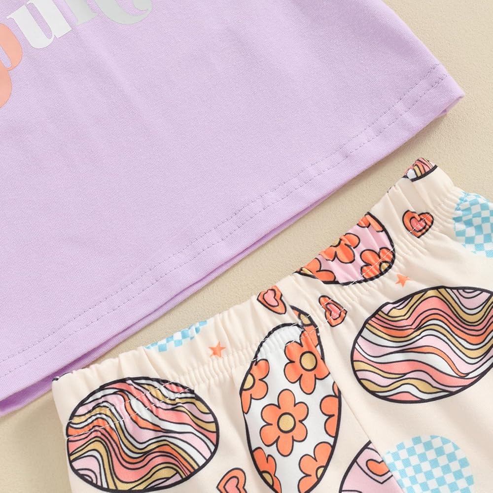 • المواد: ملابس عيد الفصح للفتيات الصغيرات، مزيج من القطن، طقم قميص وسروال قصير الأكمام ناعم ومسامي للفتيات الصغيرات، ملمس رقيق وصديق للبشرة، ولا يسبب ضررًا لجلد الطفل.