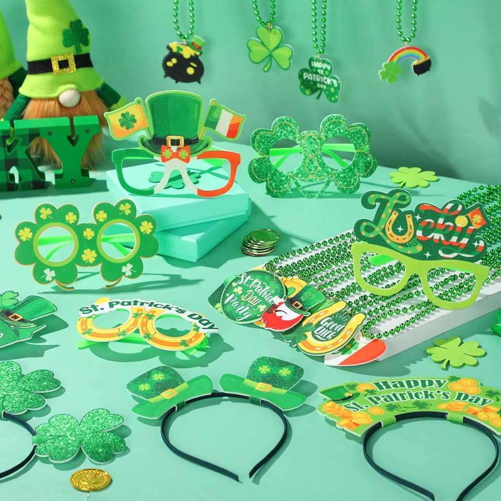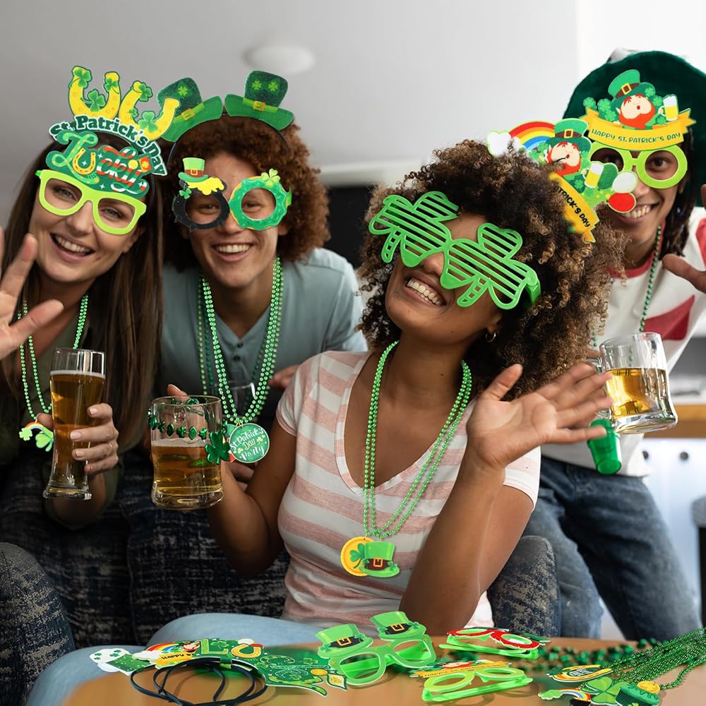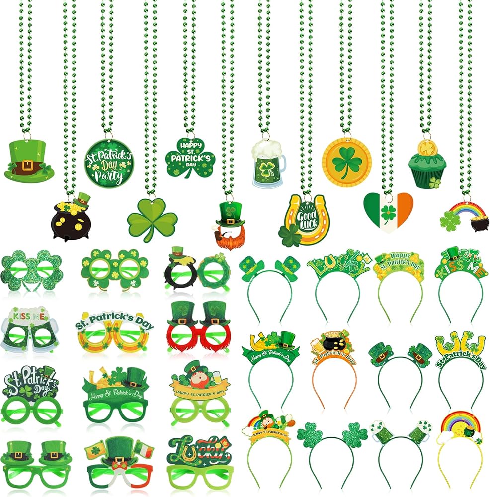 Herdear 36 قطعة مجموعة هدايا حفلات عيد القديس باتريك، نظارات شامروك محظوظة، عقد من الخرز، عصابات رأس أيرلندية خضراء، لوازم إكسسوارات تنكرية لحفلات عيد القديس باتريك، دعامات كشك الصور للأطفال الأولاد والبنات