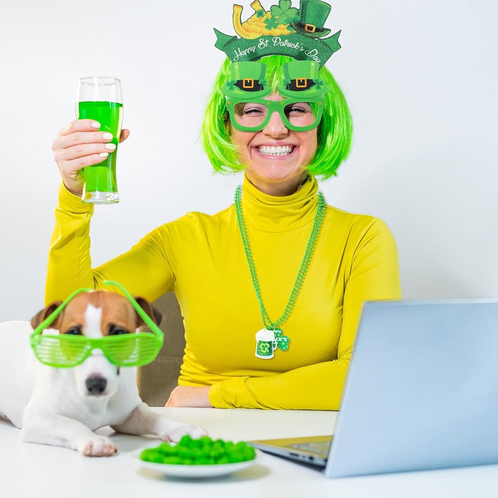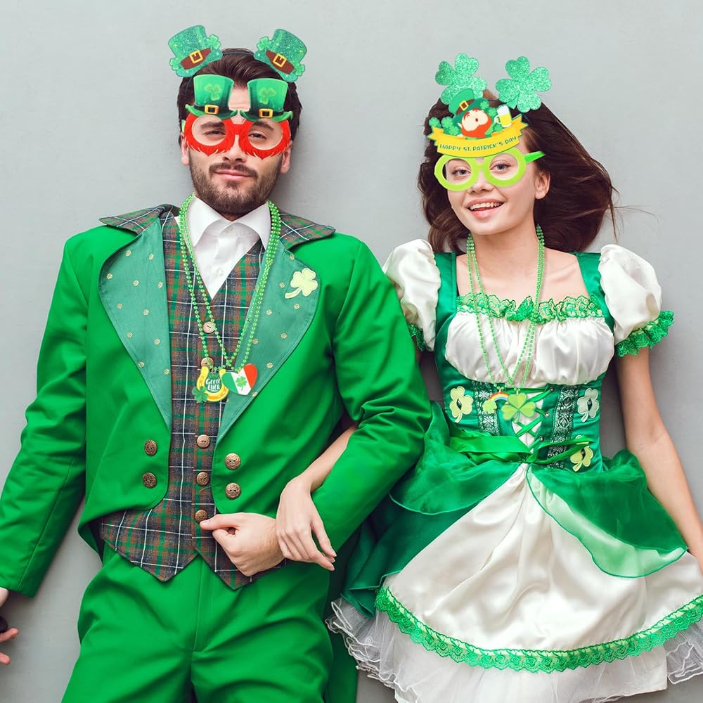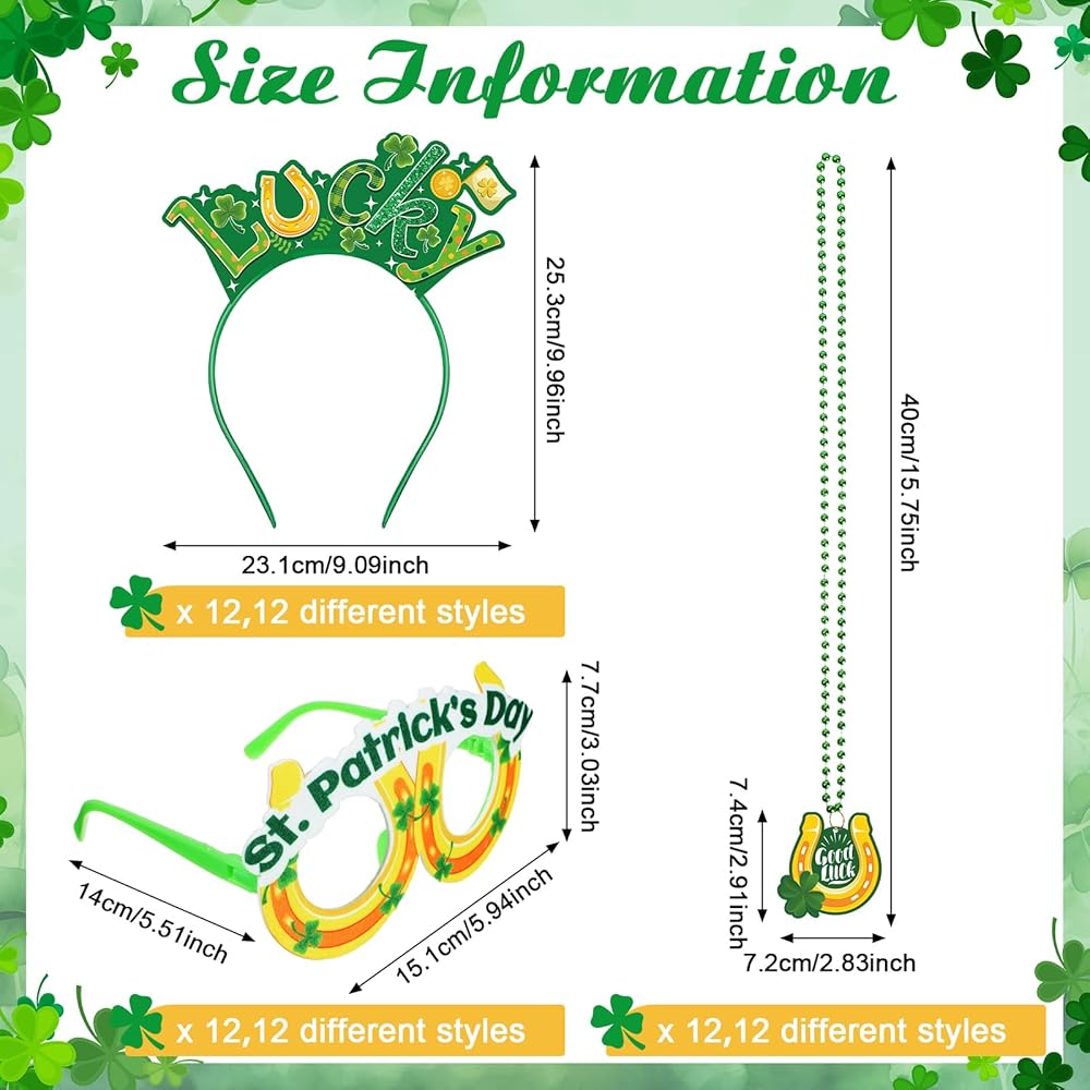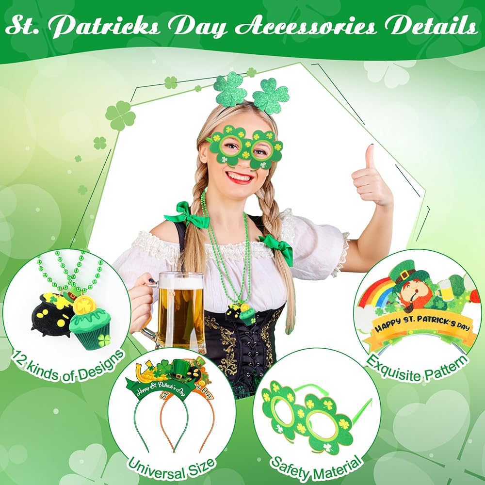 Herdear 36 قطعة مجموعة هدايا حفلات عيد القديس باتريك، نظارات شامروك محظوظة، عقد من الخرز، عصابات رأس أيرلندية خضراء، لوازم إكسسوارات تنكرية لحفلات عيد القديس باتريك، دعامات كشك الصور للأطفال الأولاد والبنات