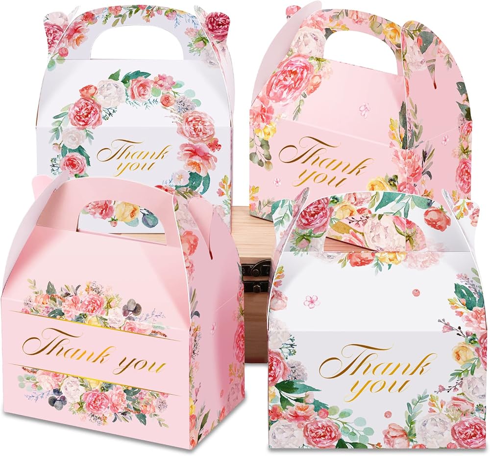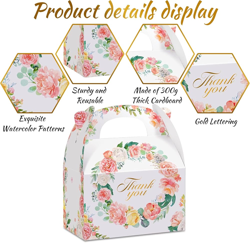 موضوع الزهور المائية: مع الأبيض والوردي كخلفية، جنبًا إلى جنب مع أنماط الزهور المائية الرائعة ونص "شكرًا لك" الأنيق، صناديق هدايا الحفلات هذه جميلة جدًا ورومانسية وجذابة، وسوف تصبح النقطة المحورية لحفلاتك