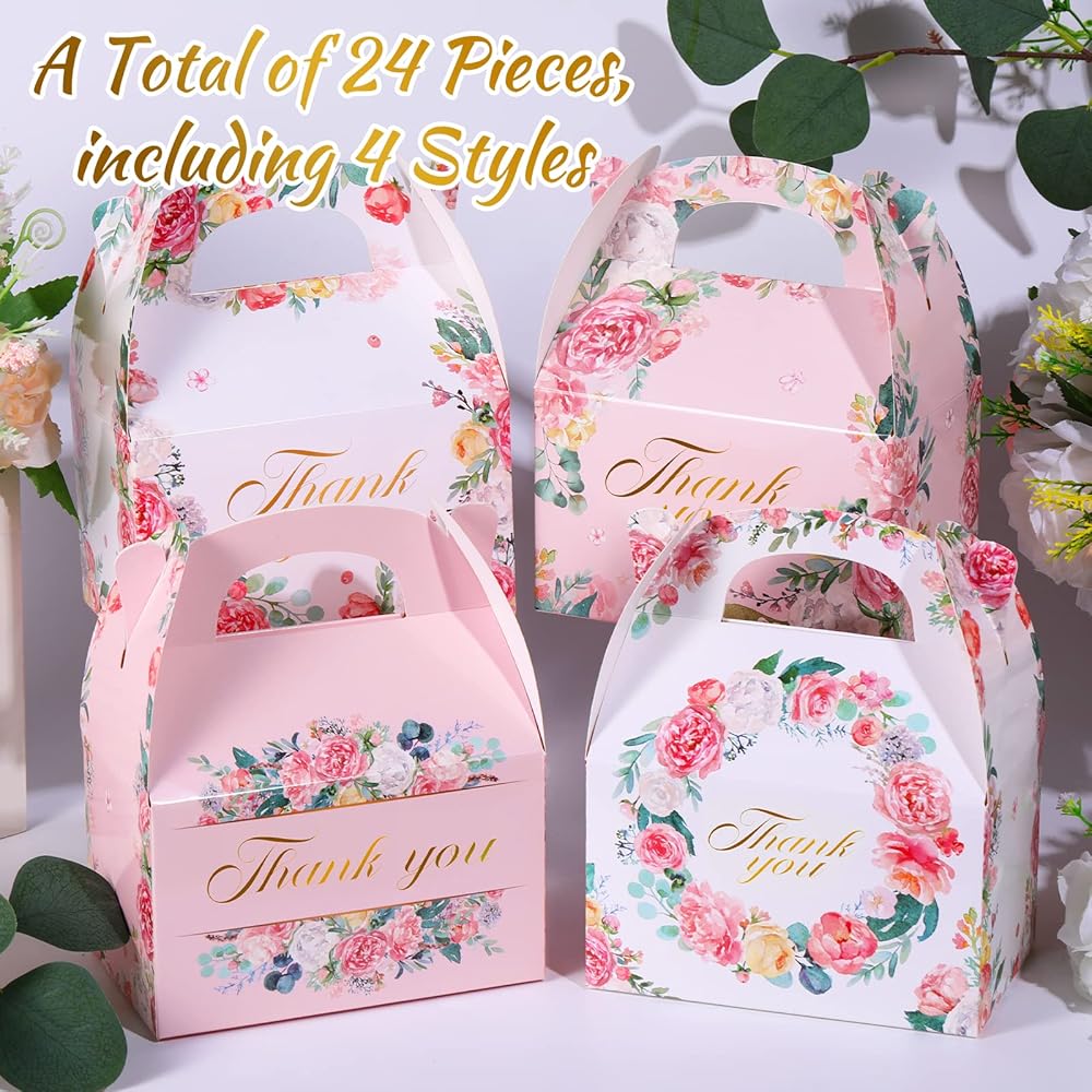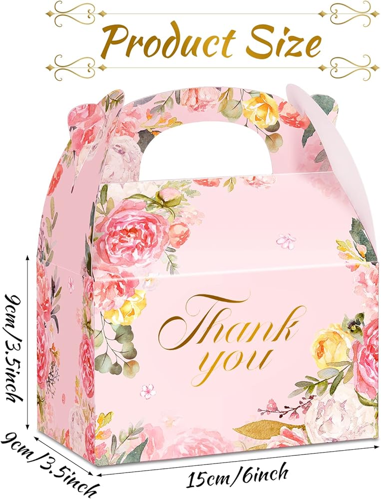 الكمية الإجمالية وتفاصيل الحجم: سوف تحصل على 24 قطعة من الزهور شكرًا لك على صناديق الحلوى من 4 أنماط مختلفة، والخلفيات بشكل أساسي باللون الوردي والأبيض على التوالي؛ حجم كل صندوق هو 5.9 × 3.5 × 3.5 بوصة / 15 × 9 × 9 سم، وهو كبير بما يكفي لحمل الحلوى والكب كيك والوجبات الخفيفة والألعاب الصغيرة.