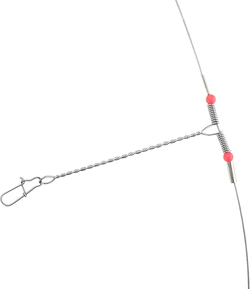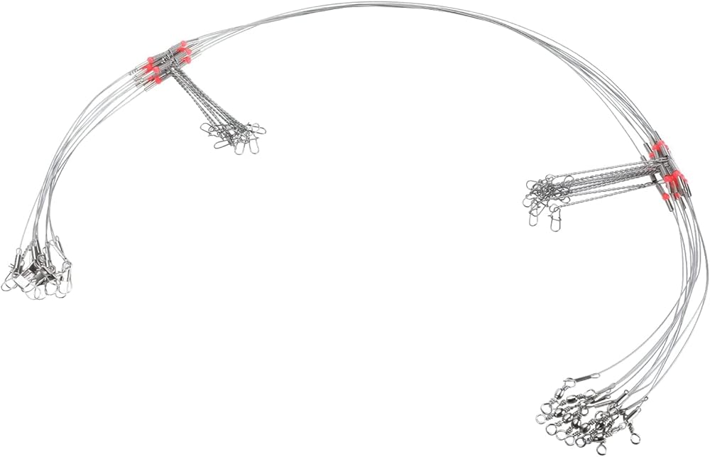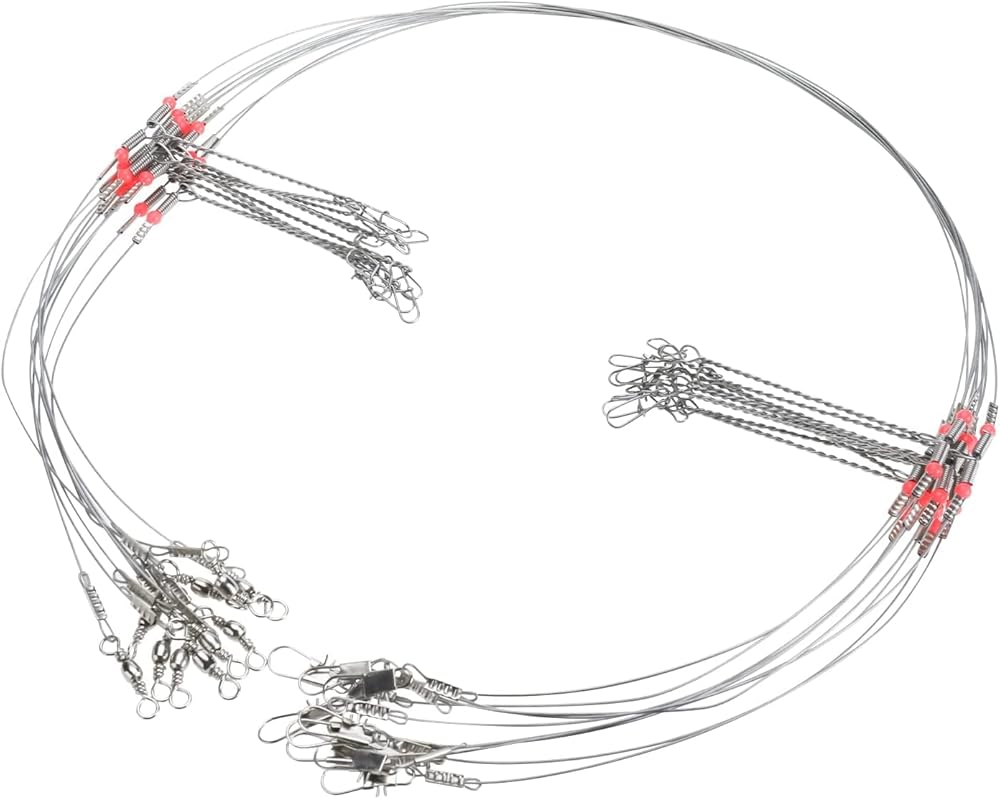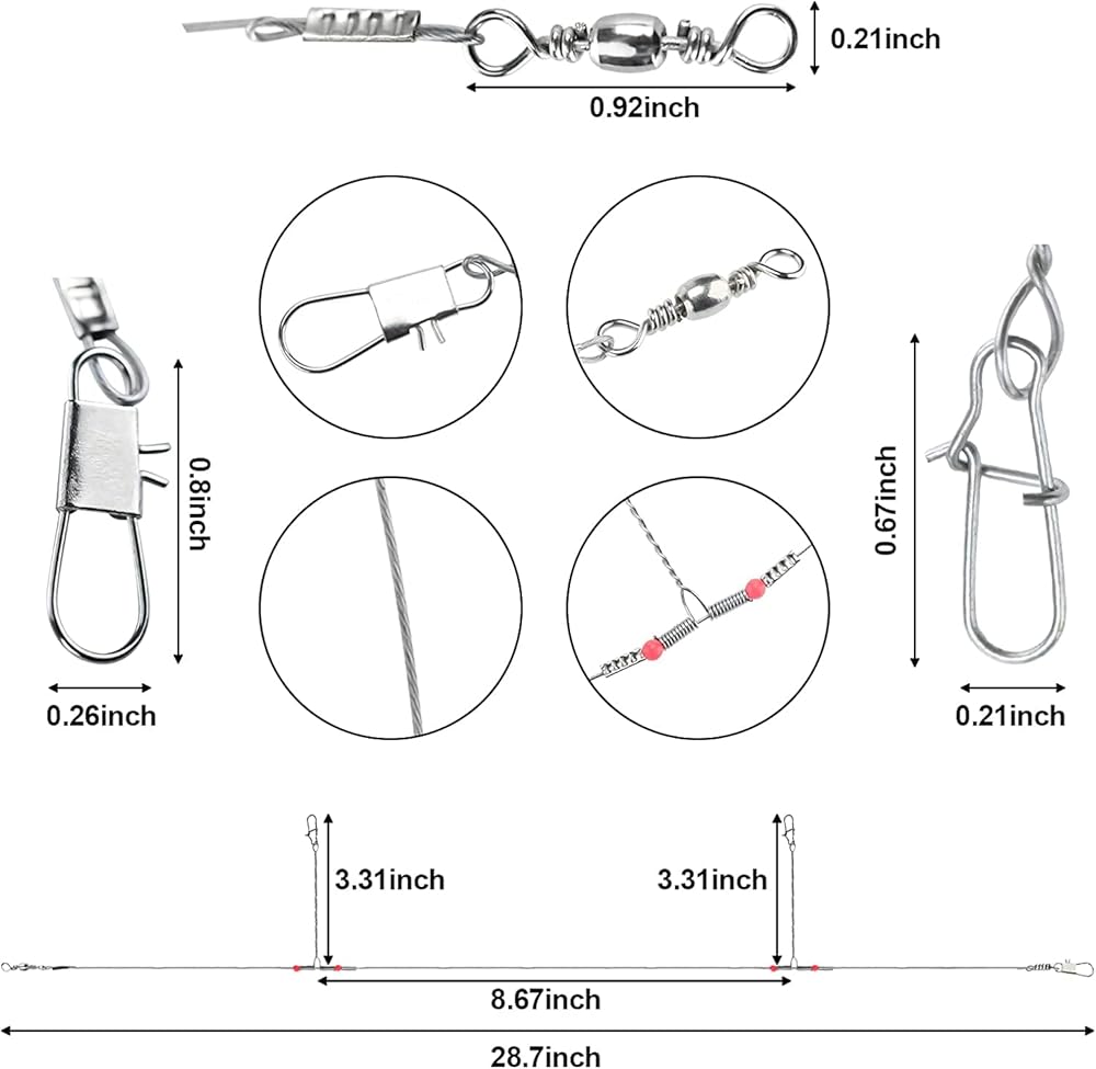 تشمل العبوة: 50 قطعة من أسلاك الصيد المصنوعة من الفولاذ المقاوم للصدأ مع ذراعين، مزودة بأزرار كبس ودوارات وخرز أحمر.