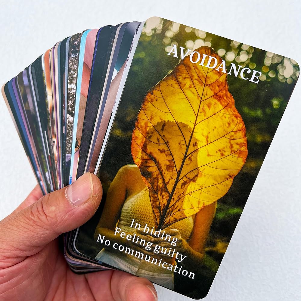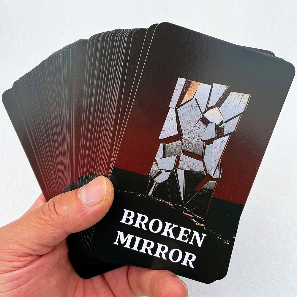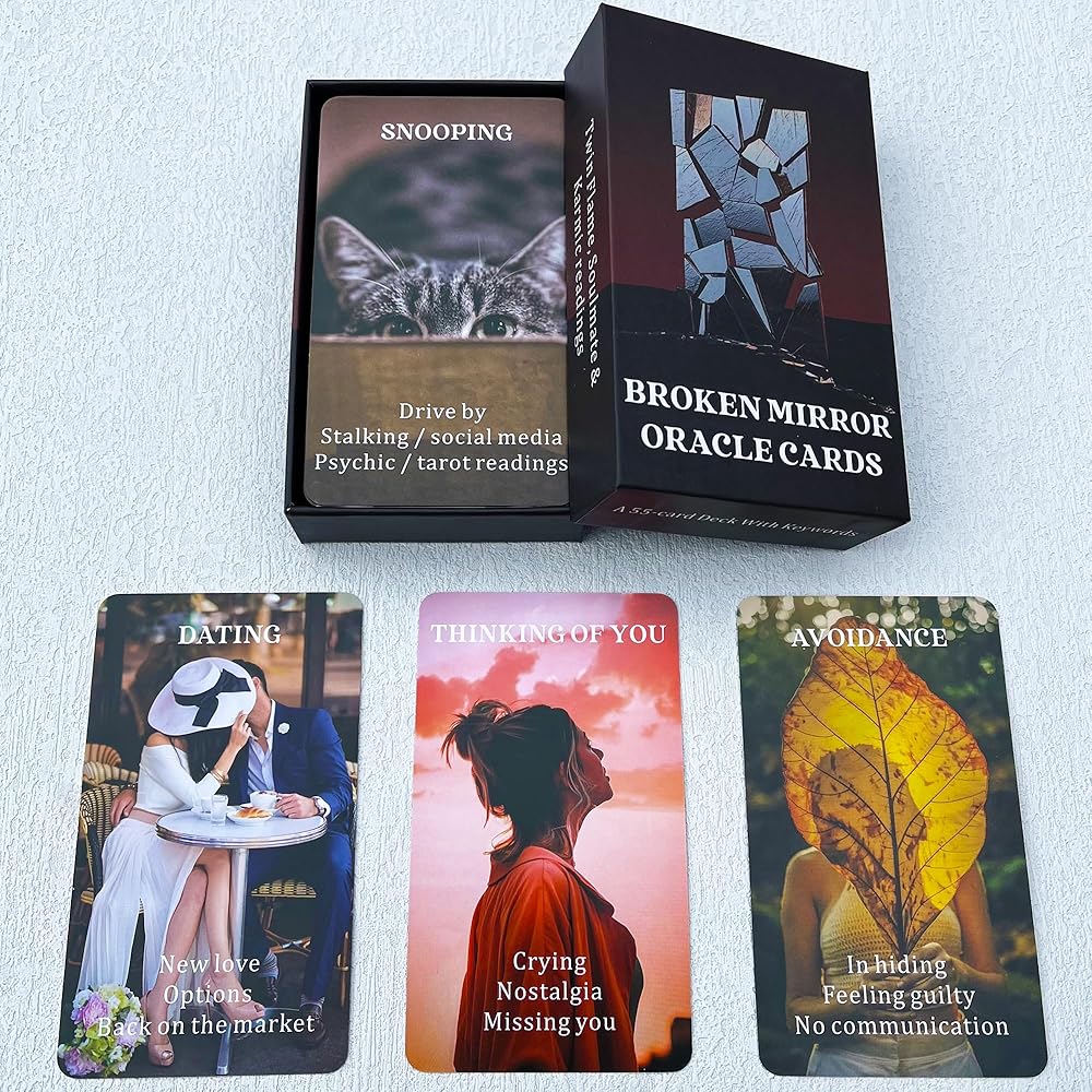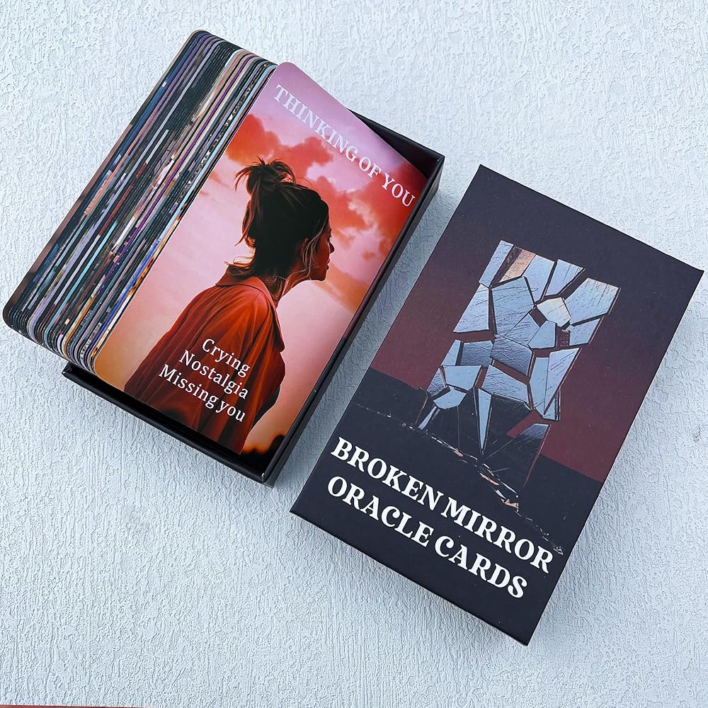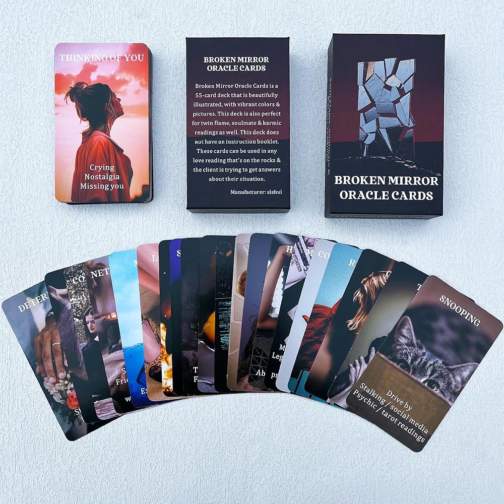 🔮【سطح المرايا المكسورة 】عبارة عن مجموعة مكونة من 55 بطاقة مصورة بشكل جميل، بألوان وصور نابضة بالحياة. يمكن استخدام هذه البطاقات في أي قراءة حب على الصخور ويحاول العميل الحصول على إجابات حول موقفه.