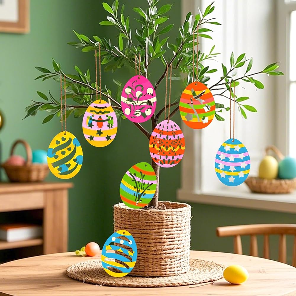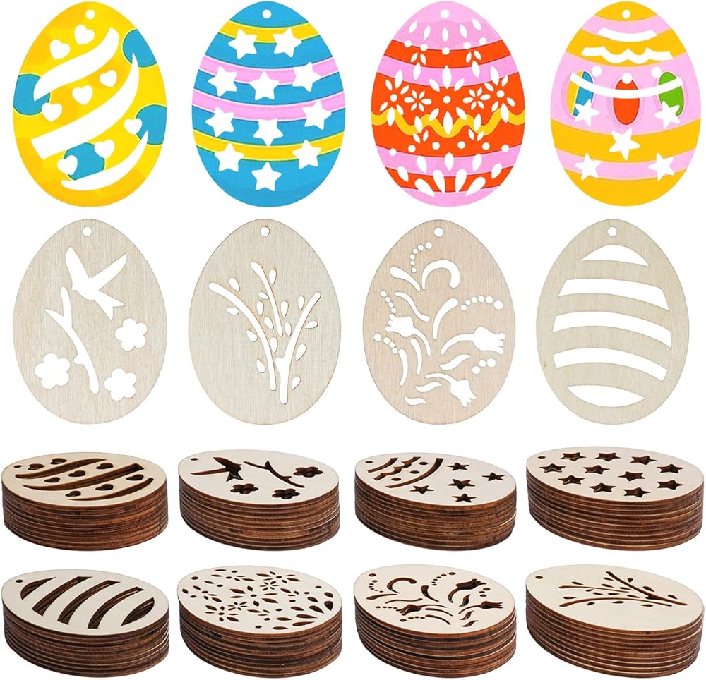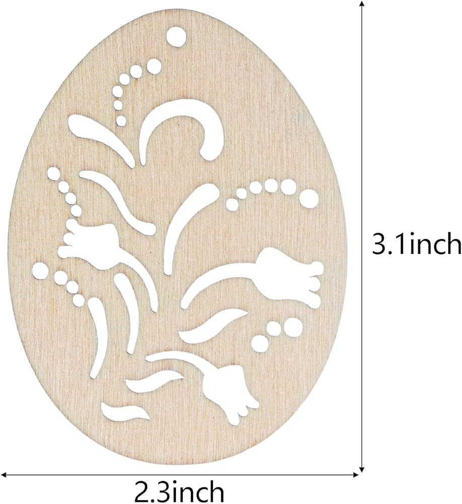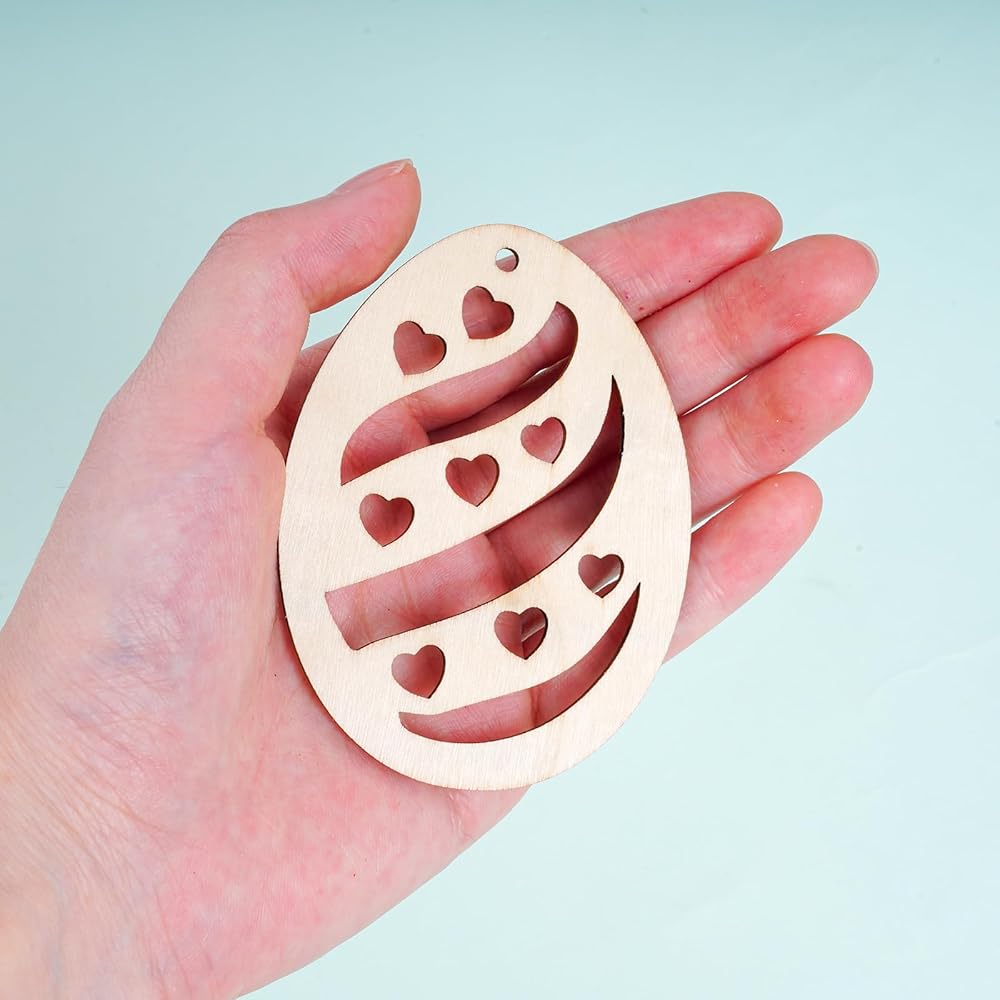 مصنوعات البيض: يمكن أن تصنع قطع البيض الخشبية مجموعة متنوعة من الحرف اليدوية، وعلامات عيد الفصح، وبيض عيد الفصح، وبطاقات عيد الفصح، وسلاسل المفاتيح، والأقراط، والديكورات المعلقة، وتزيين العبوات والمشروعات اليدوية للبيض.