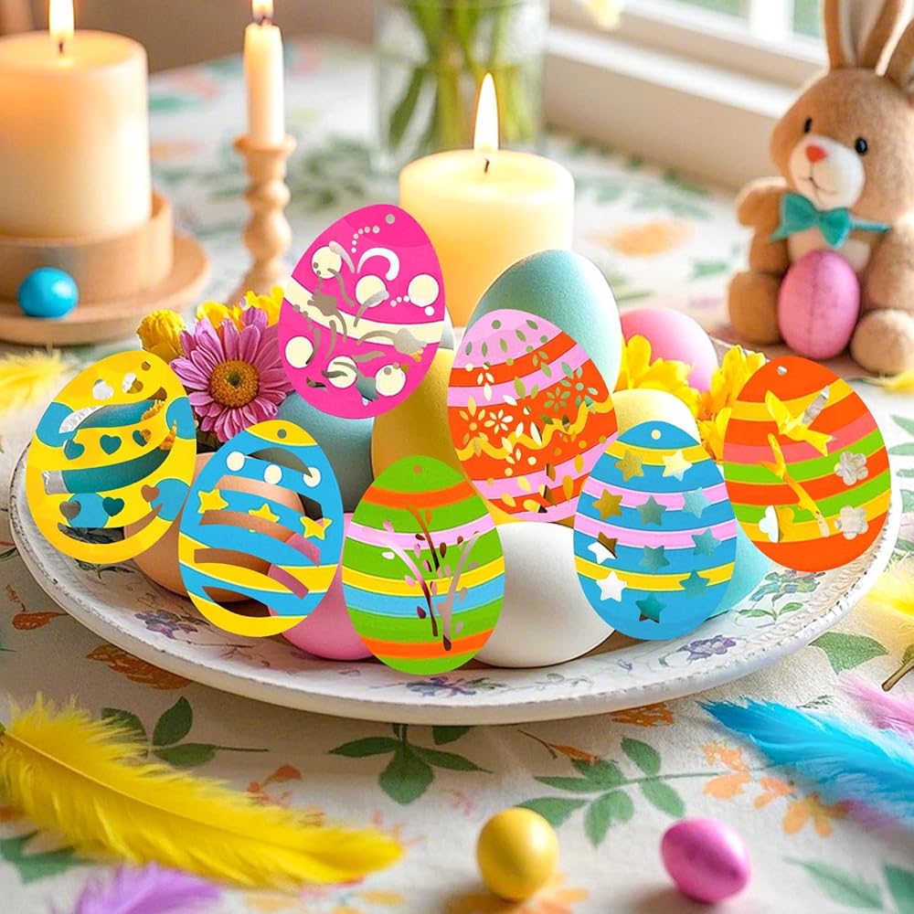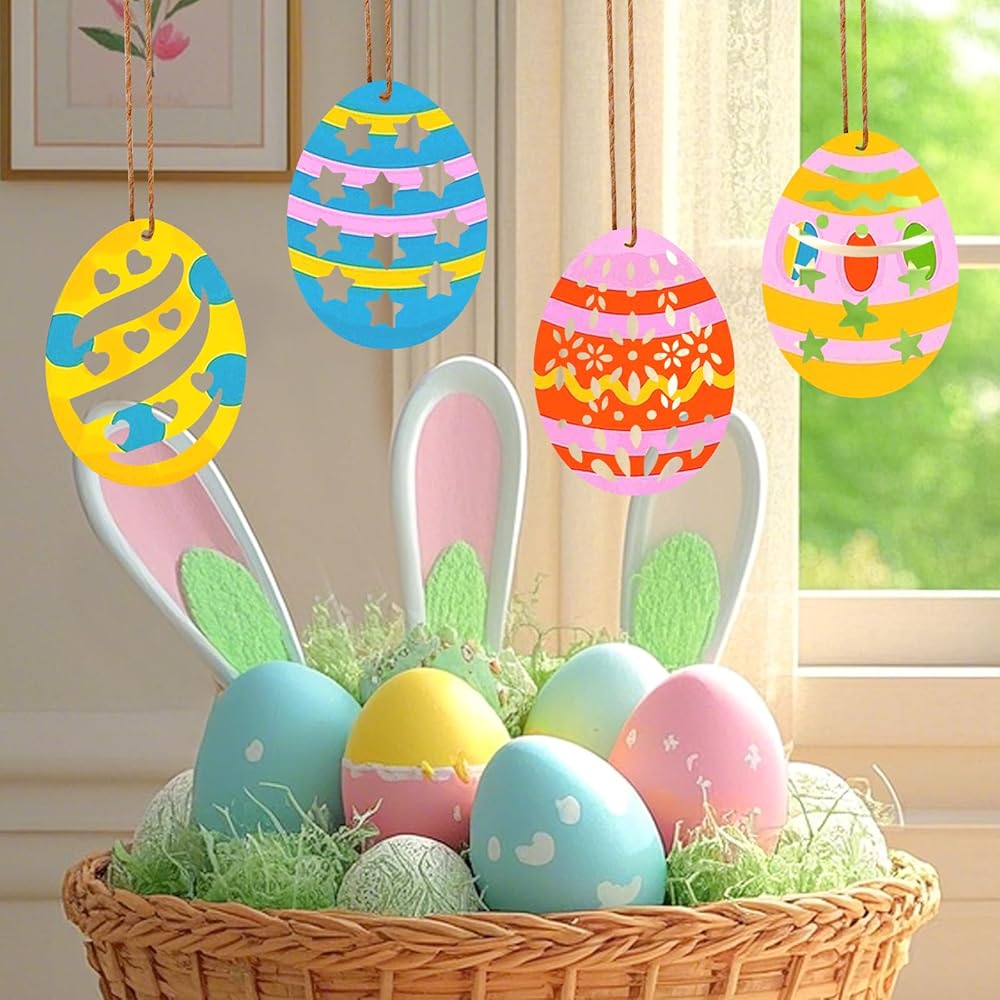 زينة عيد الفصح: يمكن استخدام رقائق الخشب الفارغة على شكل بيضة في الرسم والكتابة، ويمكن تزيينها بالطلاء وأحجار الراين والأشرطة. يمكنك طلاء ألوان مختلفة على قطع بيض عيد الفصح الخشبية لجعلها ملونة.