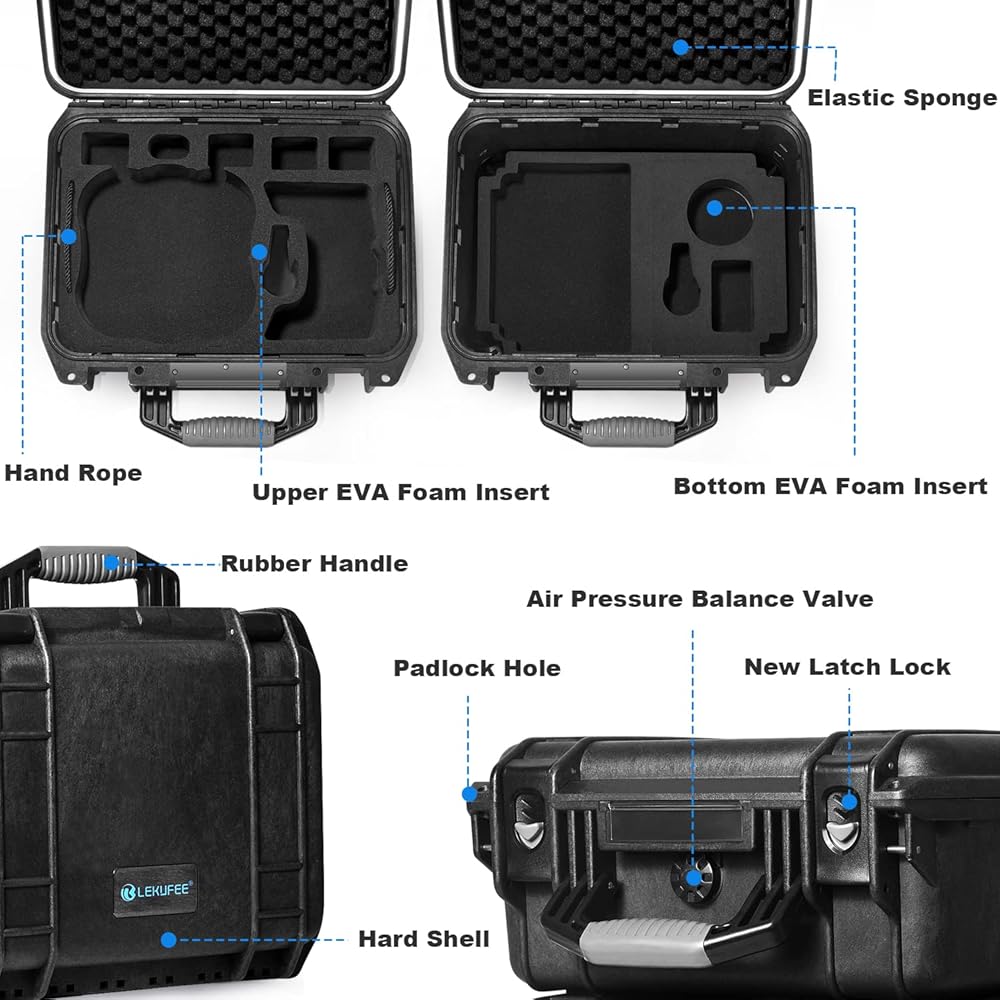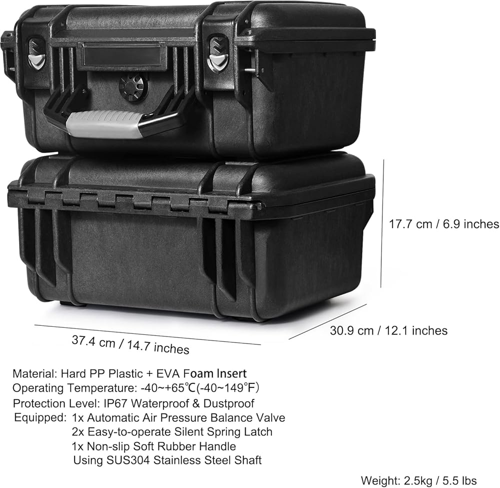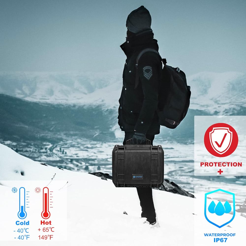 حماية قوية: مقاوم للماء والغبار بتصنيف IP67. الغلاف الصلب مصنوع من البلاستيك المتين ومبطن برغوة EVA المخصصة للحفاظ على العناصر منظمة ومحمية.