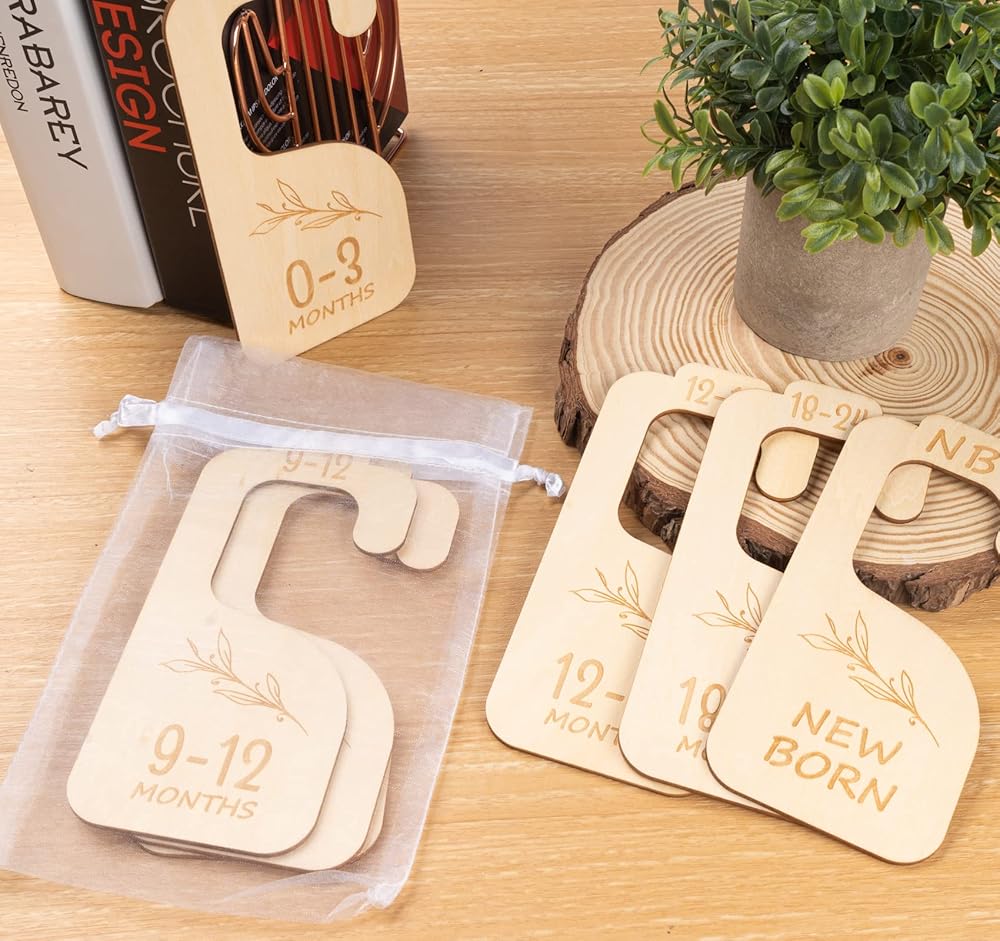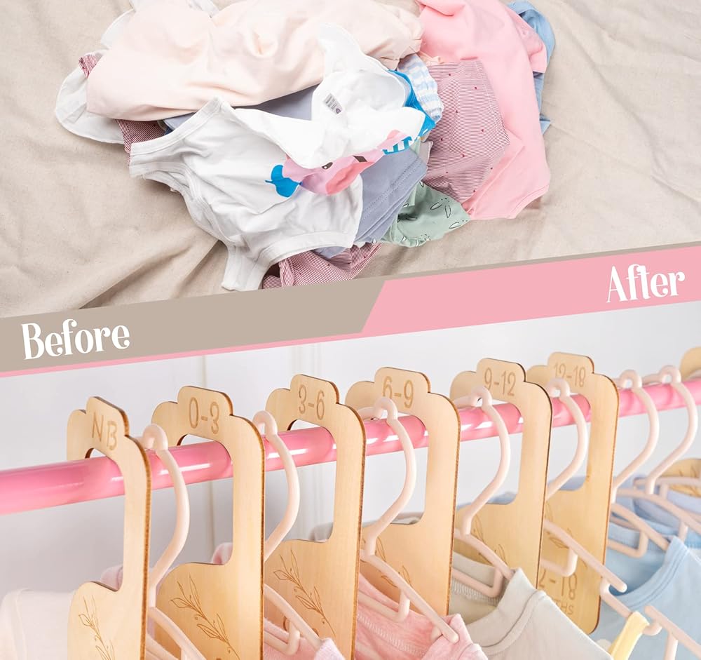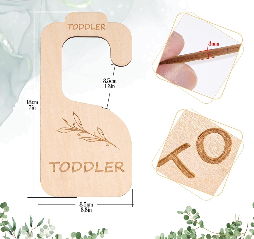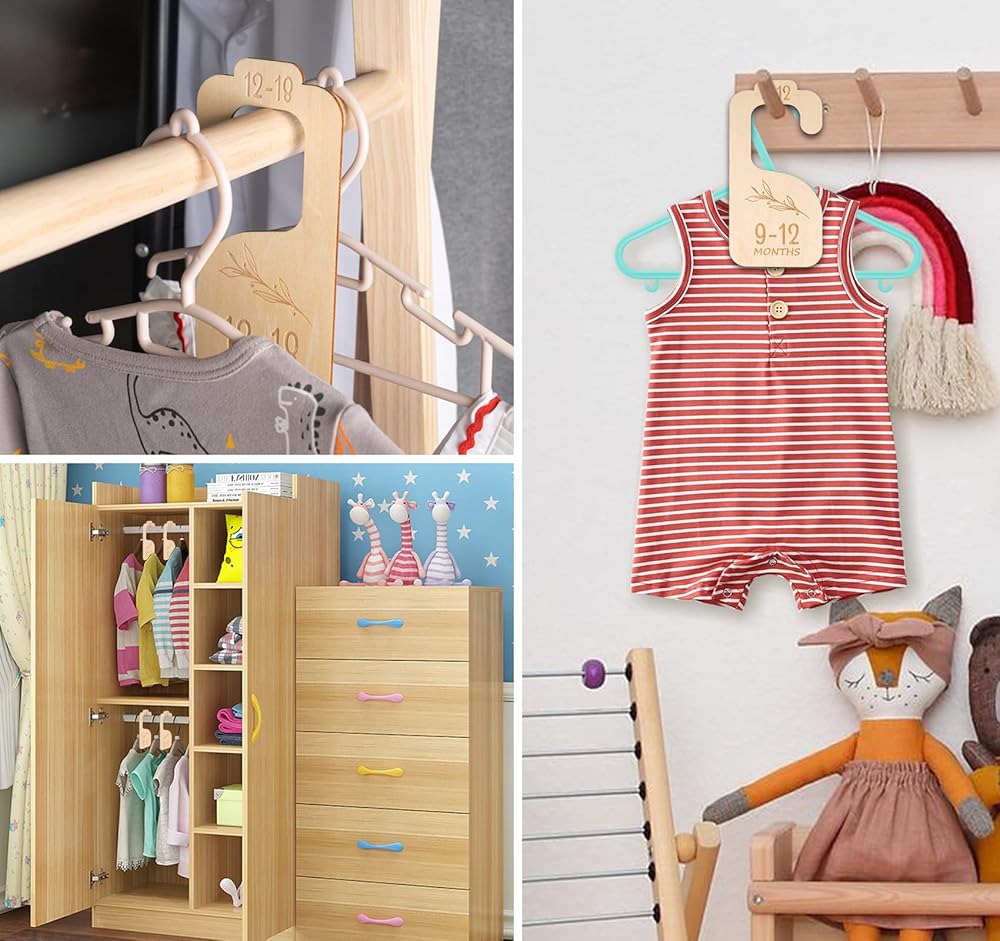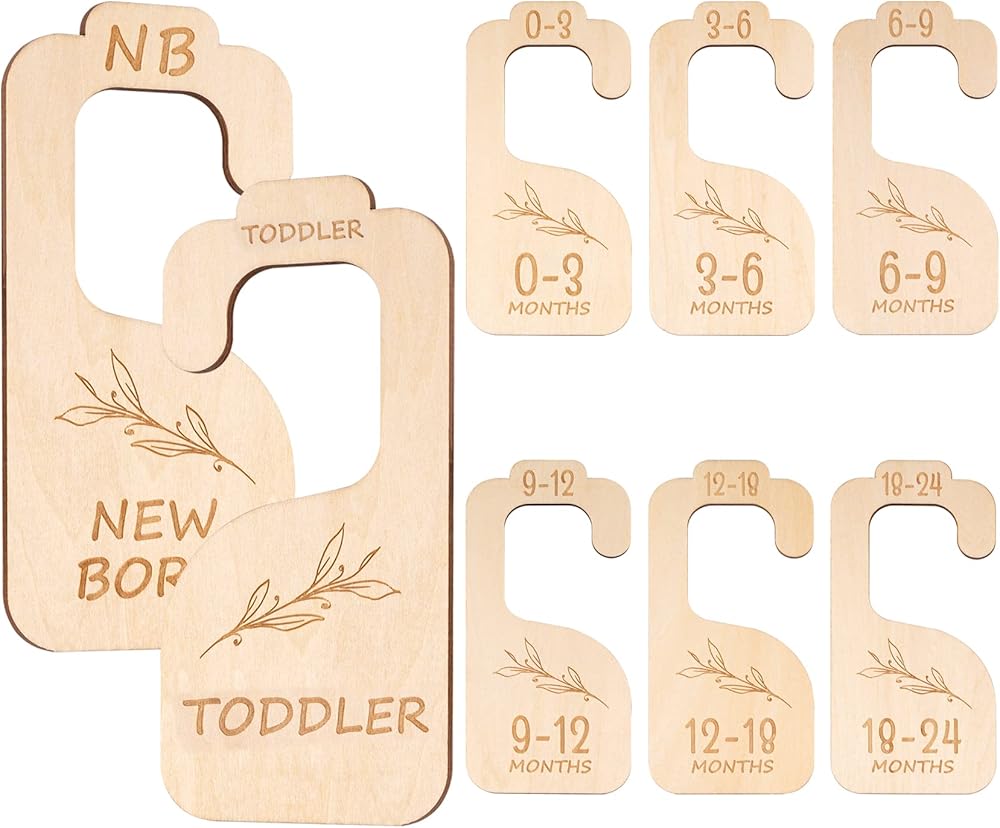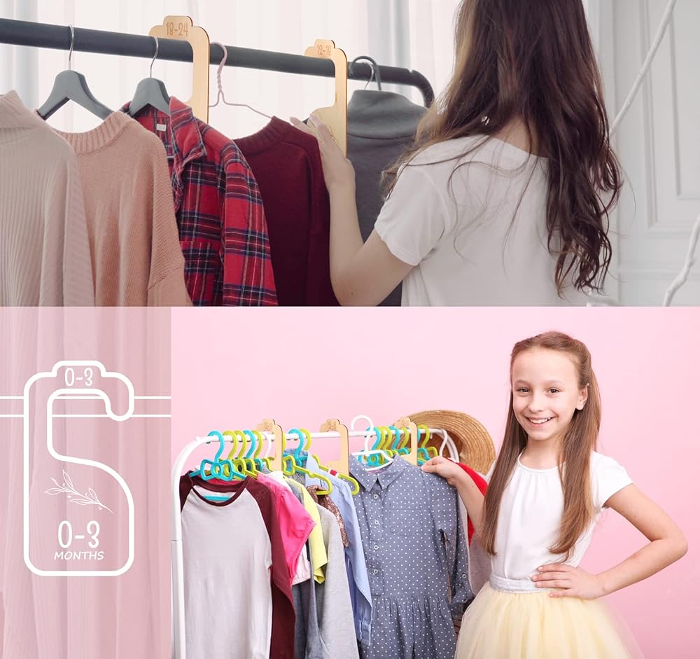 [فواصل خزانة] - مجموعة من 8 مقاسات تشمل: حديثي الولادة، 0-3 أشهر، 3-6 أشهر، 6-9 أشهر، 9-12 شهرًا، 12-18 شهرًا، 18-24 شهرًا، طفل صغير. يمكن لفواصل الحضانة تقسيم خزانة حسب العمر لإبقائها منظمة بشكل جيد.