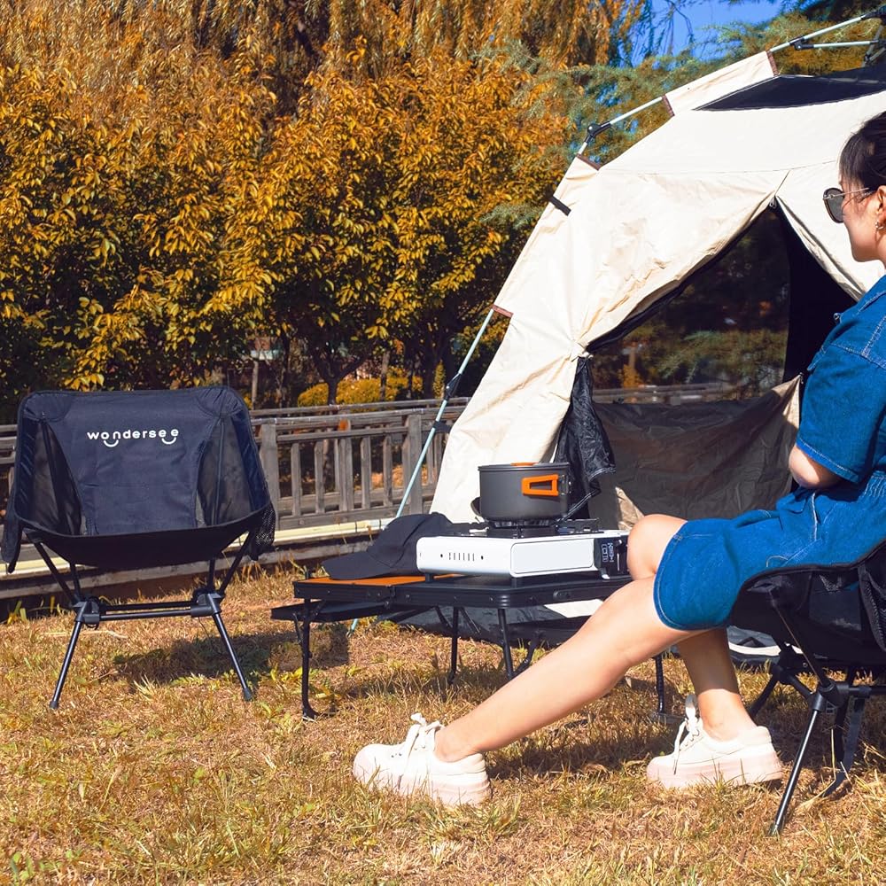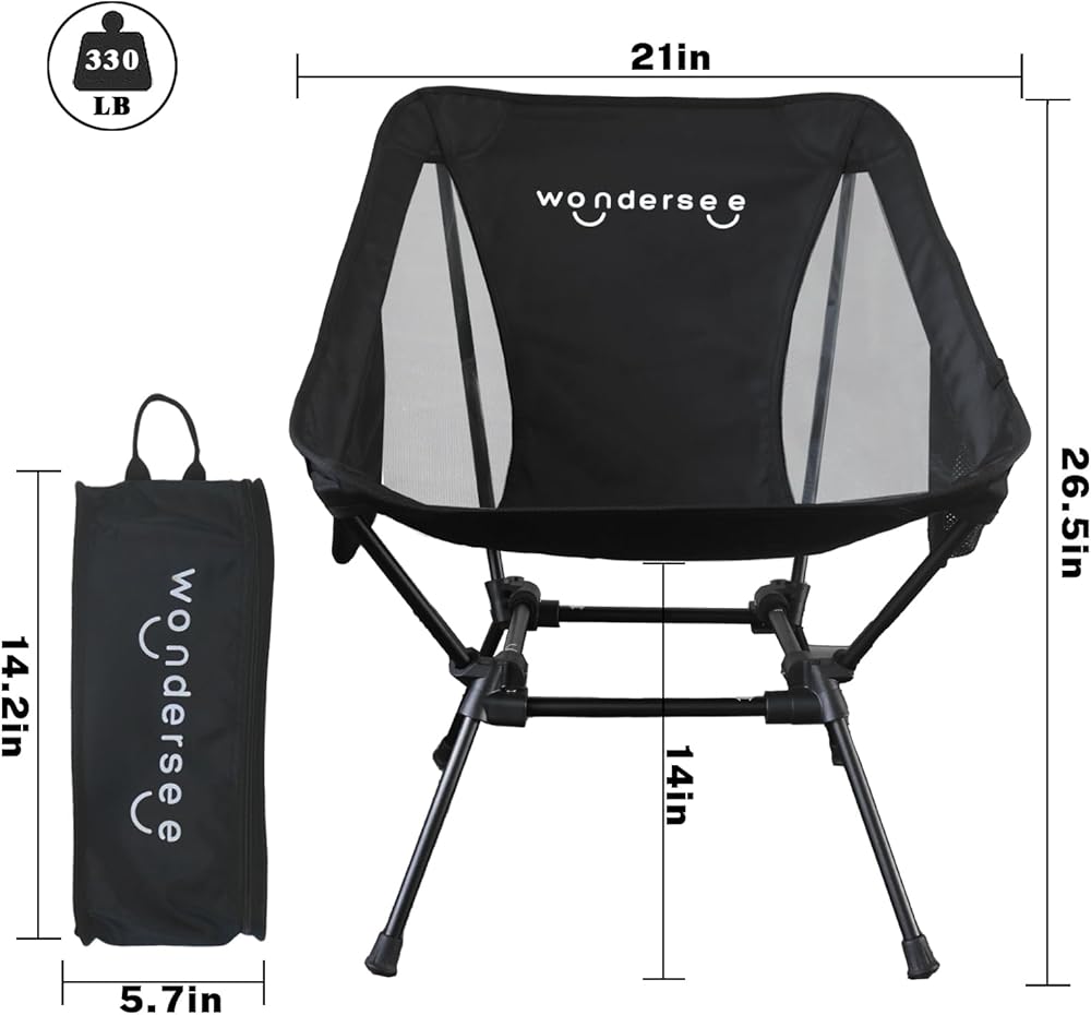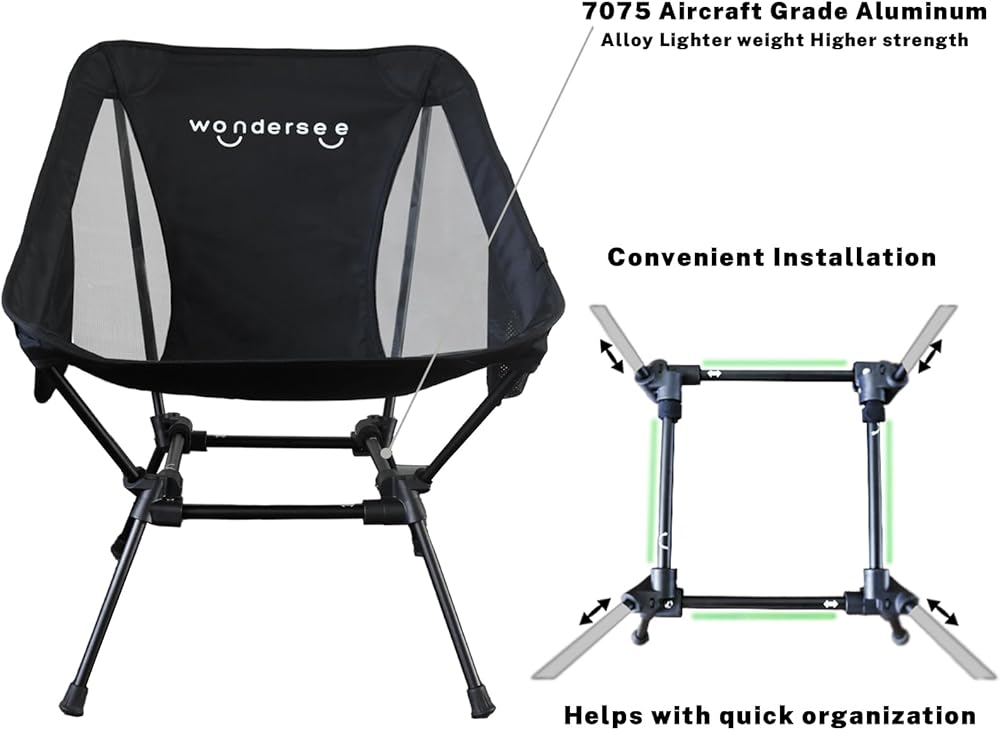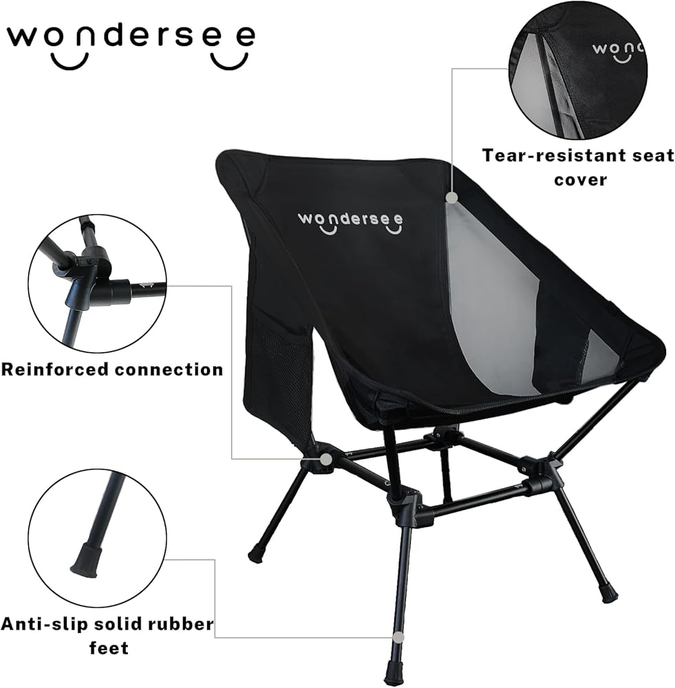 كرسي Wondersee خفيف الوزن محمول قابل للطي مع إطار رباعي ثابت وجيبين جانبيين كبيرين جدًا للتخييم وصيد الأسماك والمشي لمسافات طويلة على الشاطئ ومجال الرياضة