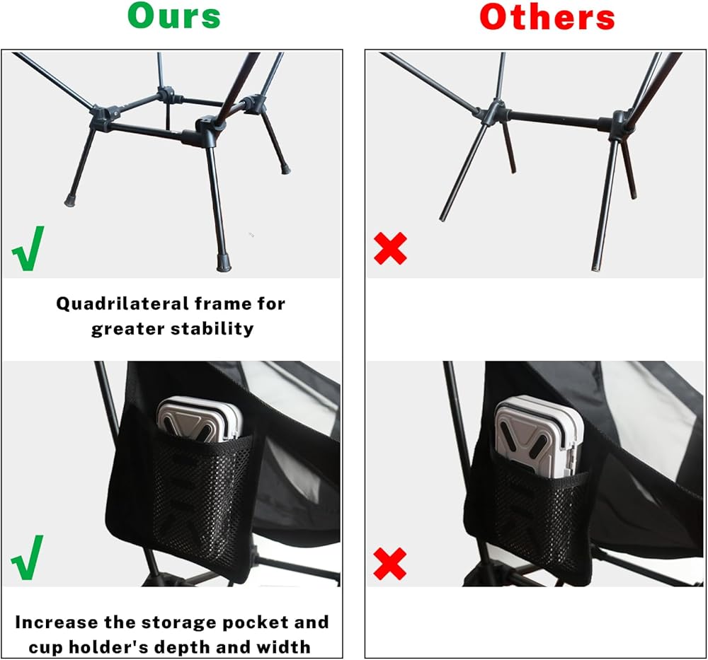 خفيف للغاية وقابل للحمل: يزن كرسي التخييم هذا 2.4 رطل فقط. من السهل حملها حتى بالنسبة للأطفال، عند طيها يمكن لشخص بالغ رفعها بيد واحدة. عند طيها إلى نصف حجم صندوق الأحذية، يمكن وضعها بسهولة في حقيبة ظهر أو ربطها بالجزء الخارجي من حقيبة الظهر، وحتى إذا كنت إذا كنت تركب على طريق سريع أو طريق جبلي، فإن حمل الكرسي القابل للطي قطريًا على ظهرك لن يشعرك بالثقل على الإطلاق.