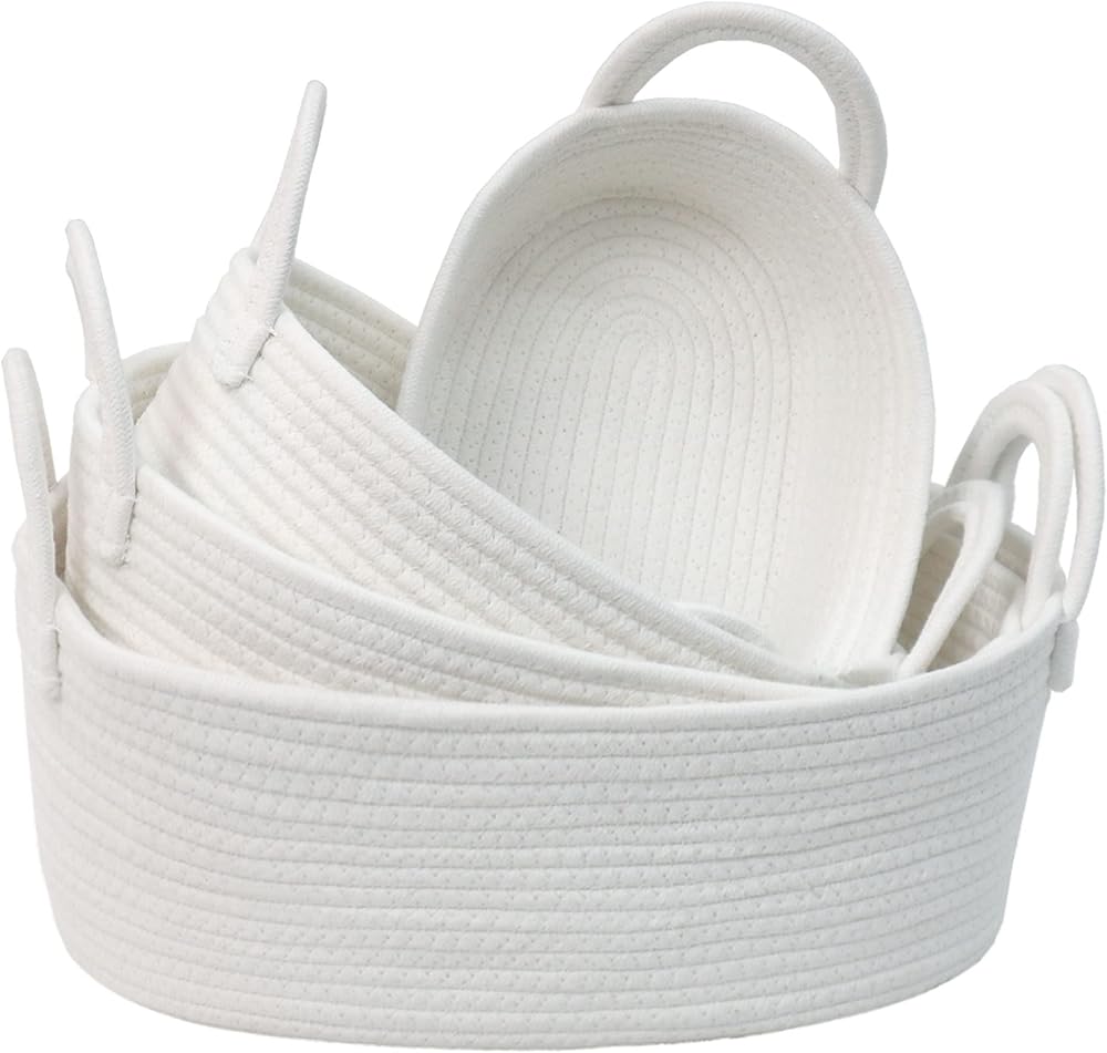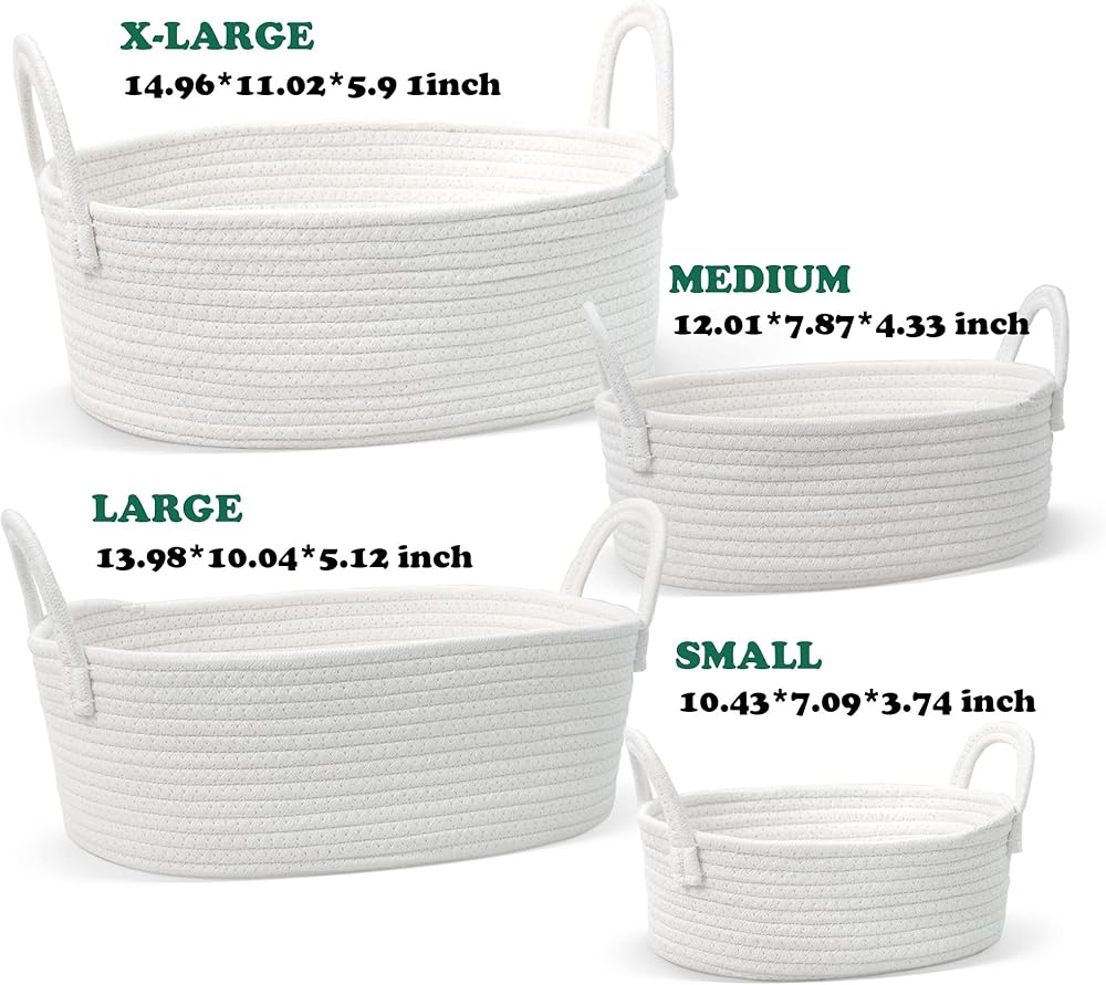 【أربعة أحجام مختلفة】سلال التخزين الأربعة هذه ذات 4 أحجام مختلفة مزخرفة وعملية. مناسبة لتخزين جميع أنواع الأدوات، مثل جهاز التحكم عن بعد والمفاتيح والإكسسوارات والوجبات الخفيفة والألعاب الصغيرة. توفير مساحة التخزين بالكامل وجعل المنزل نظيفًا ومرتبًا.