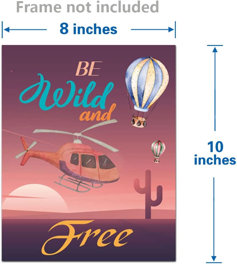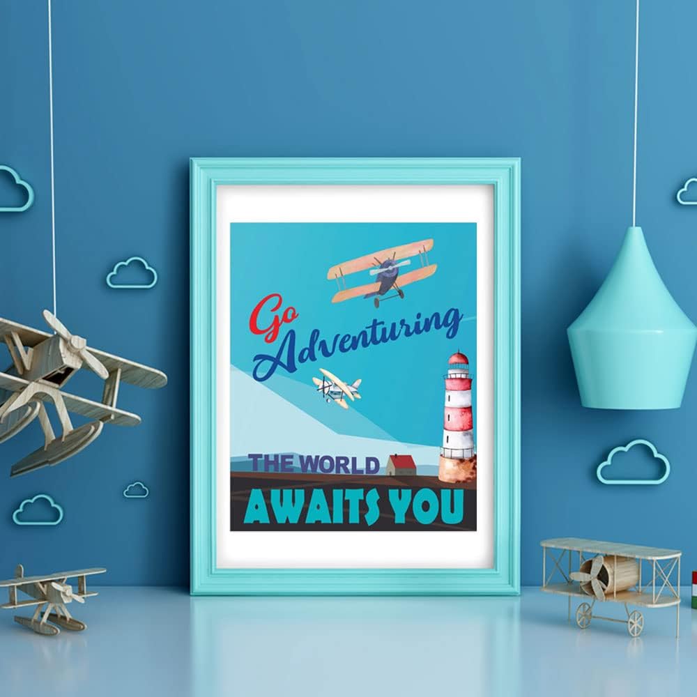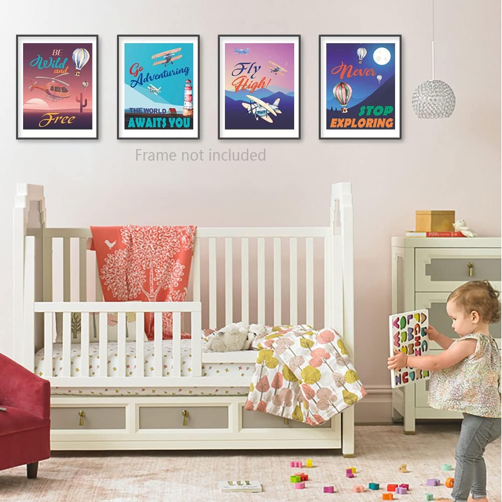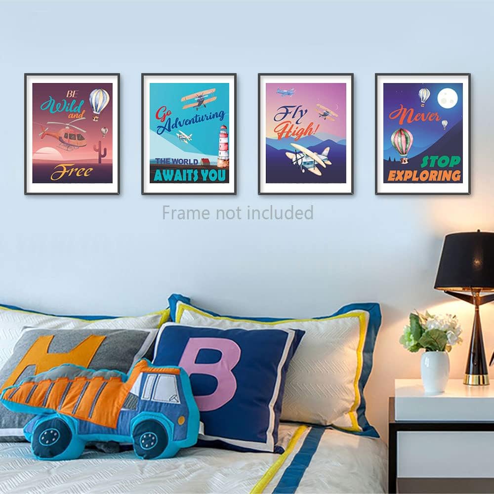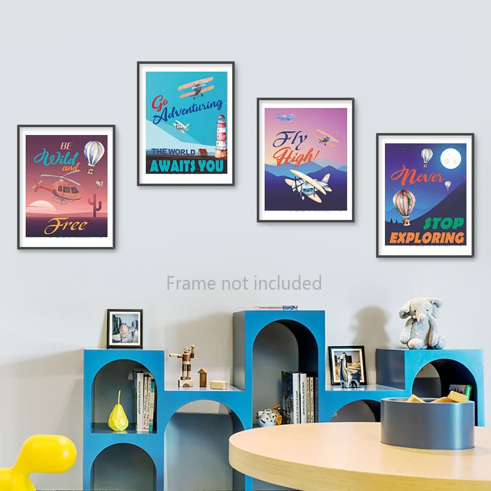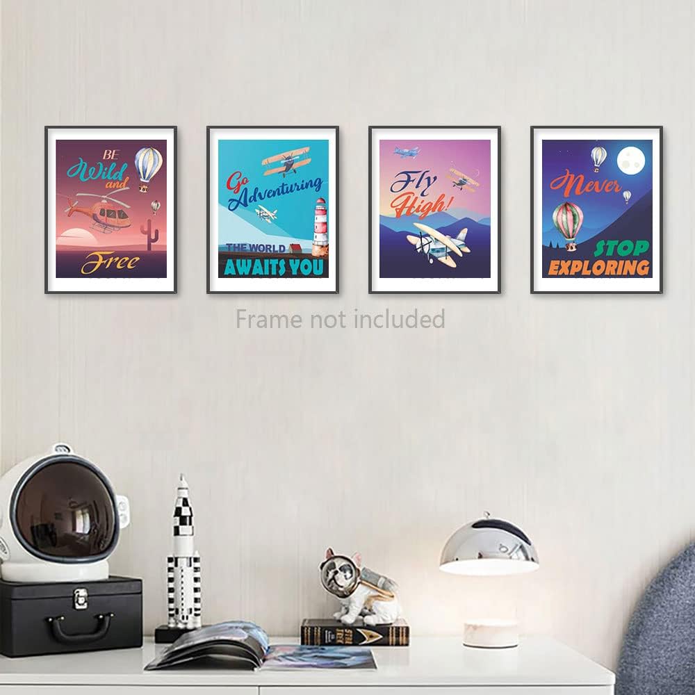 مطبوعات فنية جدارية لمغامرة منطاد الهواء الساخن على شكل طائرة عتيقة، اقتباس ملهم بالألوان المائية لاستكشاف ينتظر ملصق لوحة صور لغرفة الأطفال، مجموعة من 4 قطع (8 × 10 بوصات)، بدون إطار