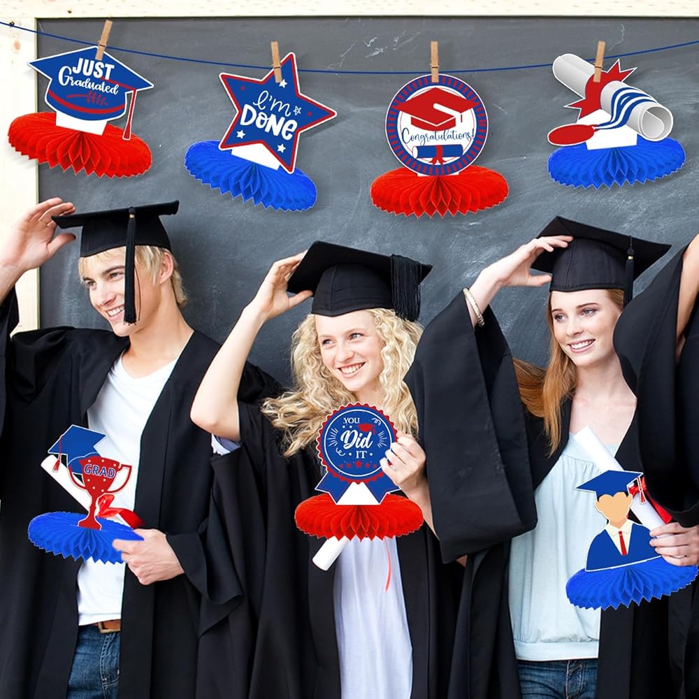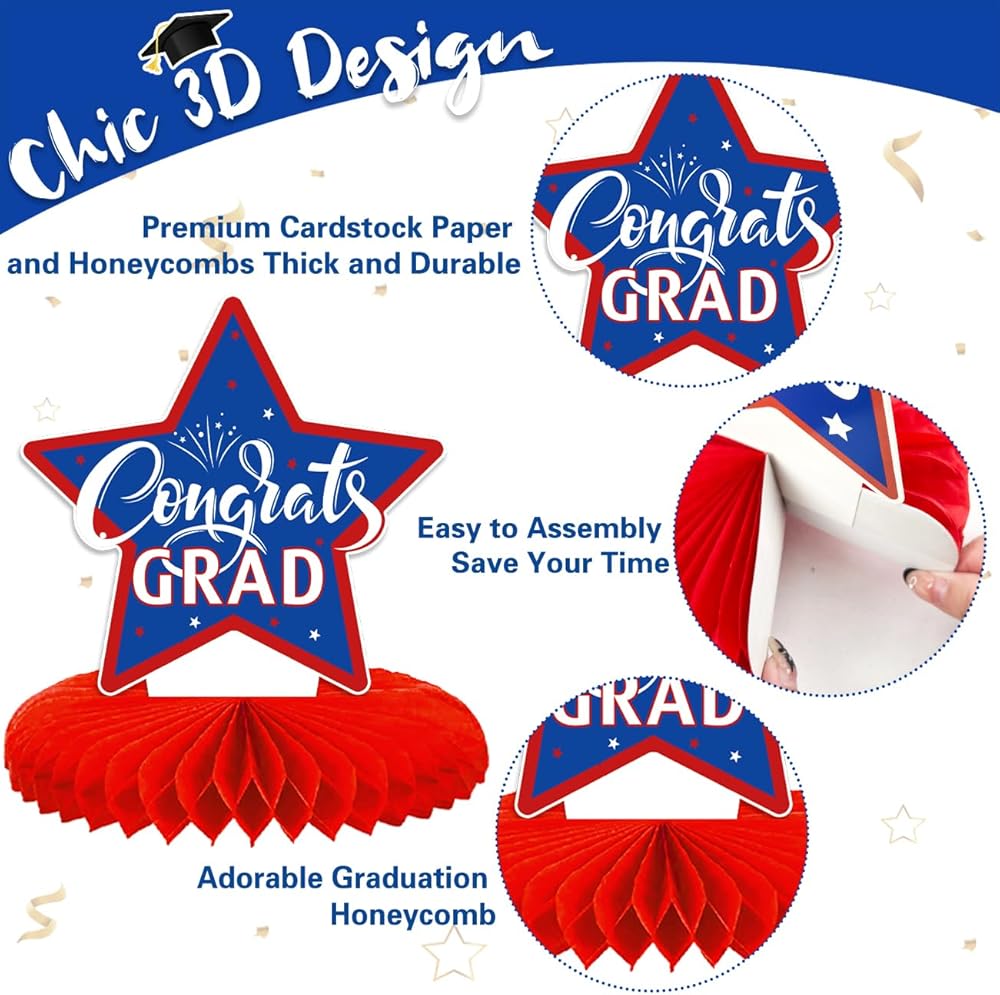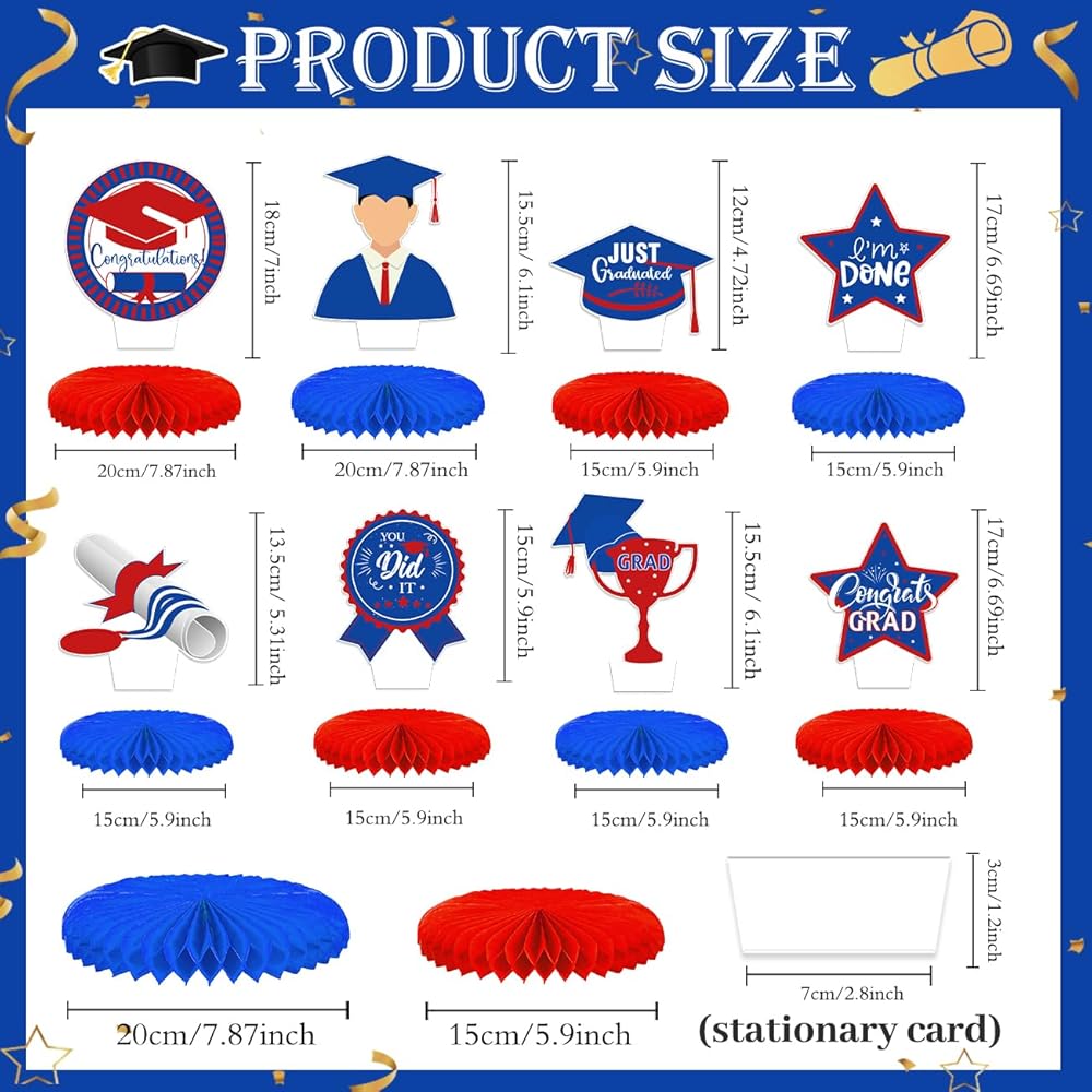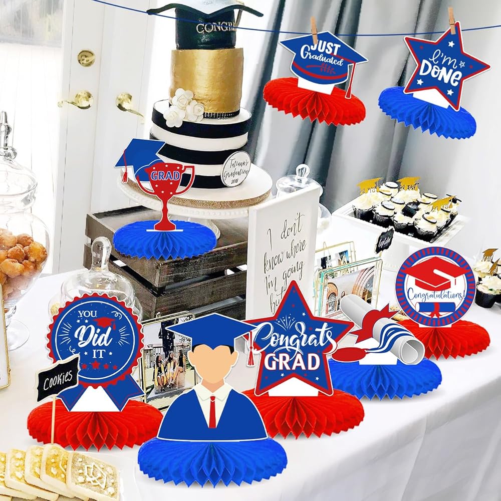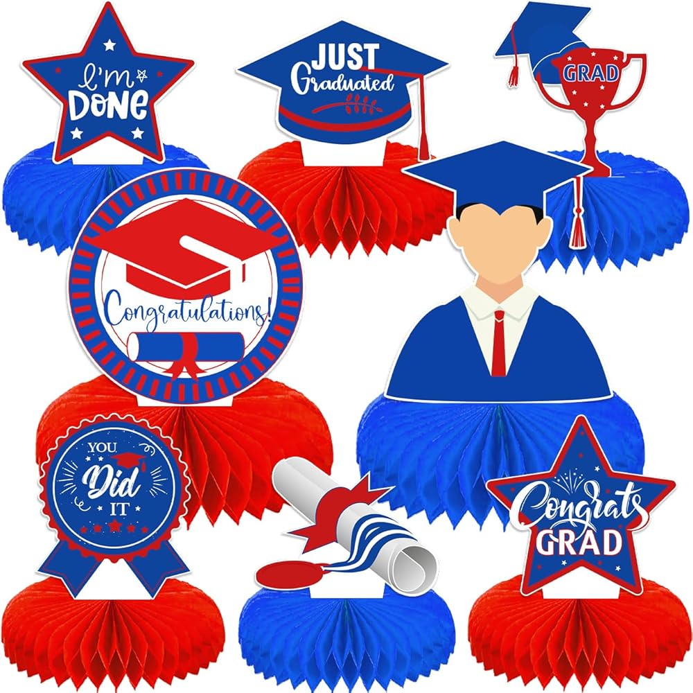 زخارف التخرج باللونين الأحمر والأزرق: سوف تحصل على 8 قطع مركزية على شكل قرص العسل للتخرج، يبلغ مقاس كل قطعة مركزية تقريبًا 7.08 بوصة × 6.1 بوصة. قم بإقامة حفلة تخرج رائعة لخريجيك من خلال ترتيب هذه القطع المركزية لطاولة التخرج 2024 باللونين الأزرق والأحمر!