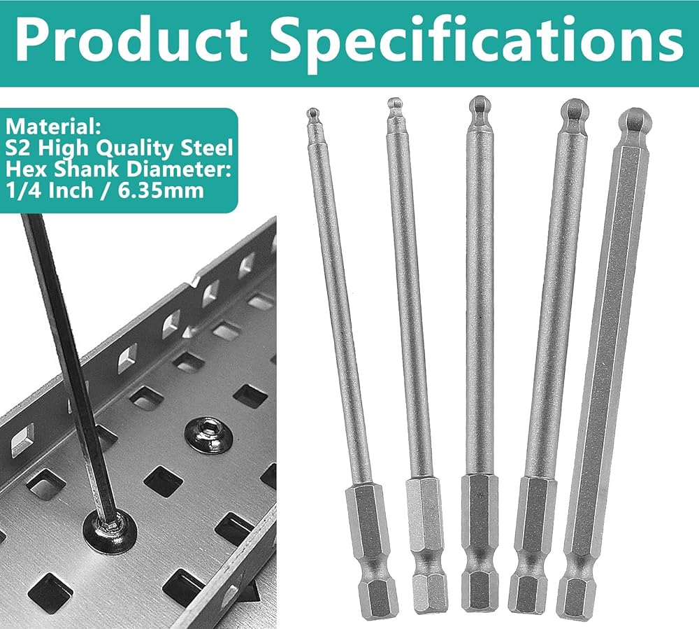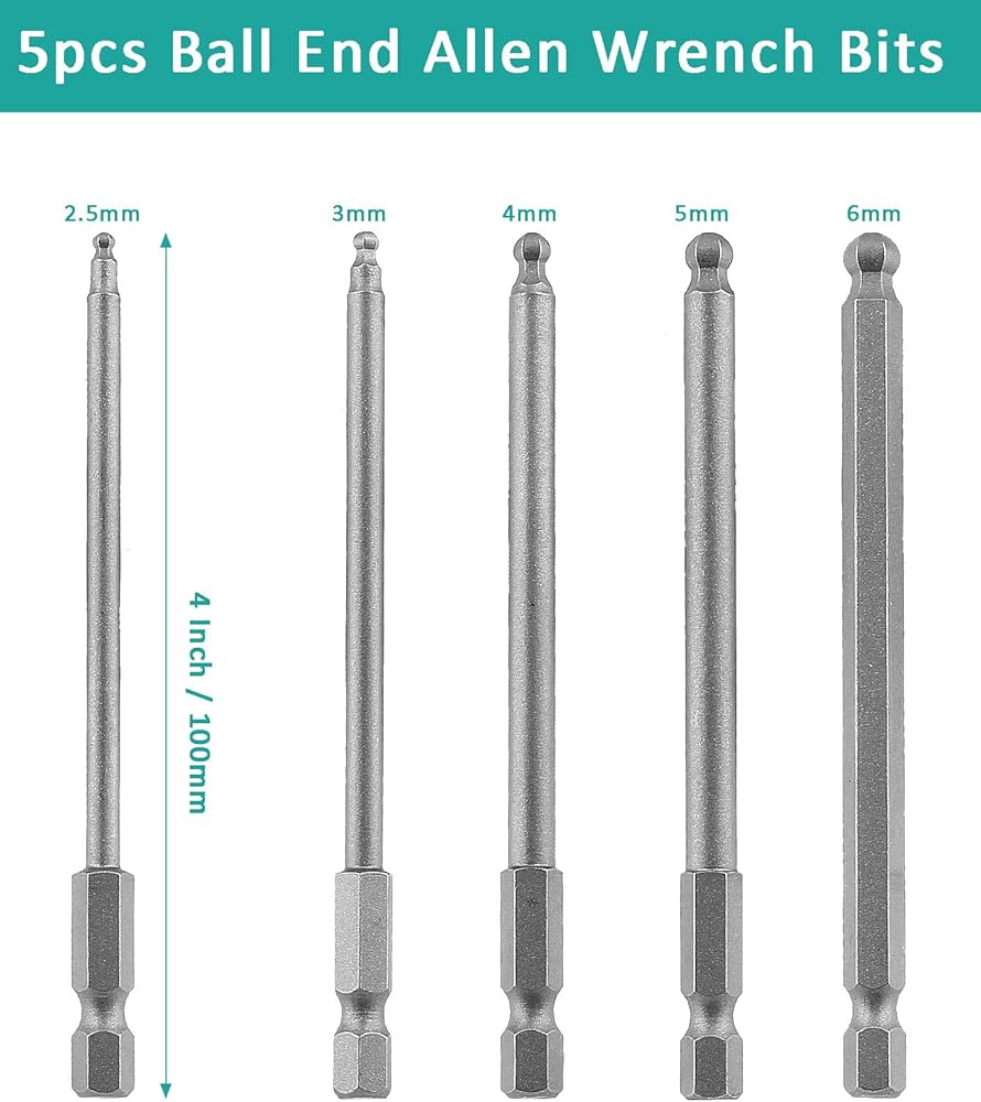 تحتوي العبوة على: 5 × لقم محرك سداسية مترية بنهاية الكرة، لقم مفتاح ألين كروية الأحجام: 2.5 مم، 3 مم، 4 مم، 5 مم، 6 مم. قطر الساق السداسية: 1/4 بوصة / 6.35 مم، الطول الإجمالي: 4 بوصة / 100 مم. تعمل قطع ألين ذات النهاية الكروية مع معظم مفكات البراغي اليدوية والكهربائية والمثاقب والأدوات الدوارة الأخرى.