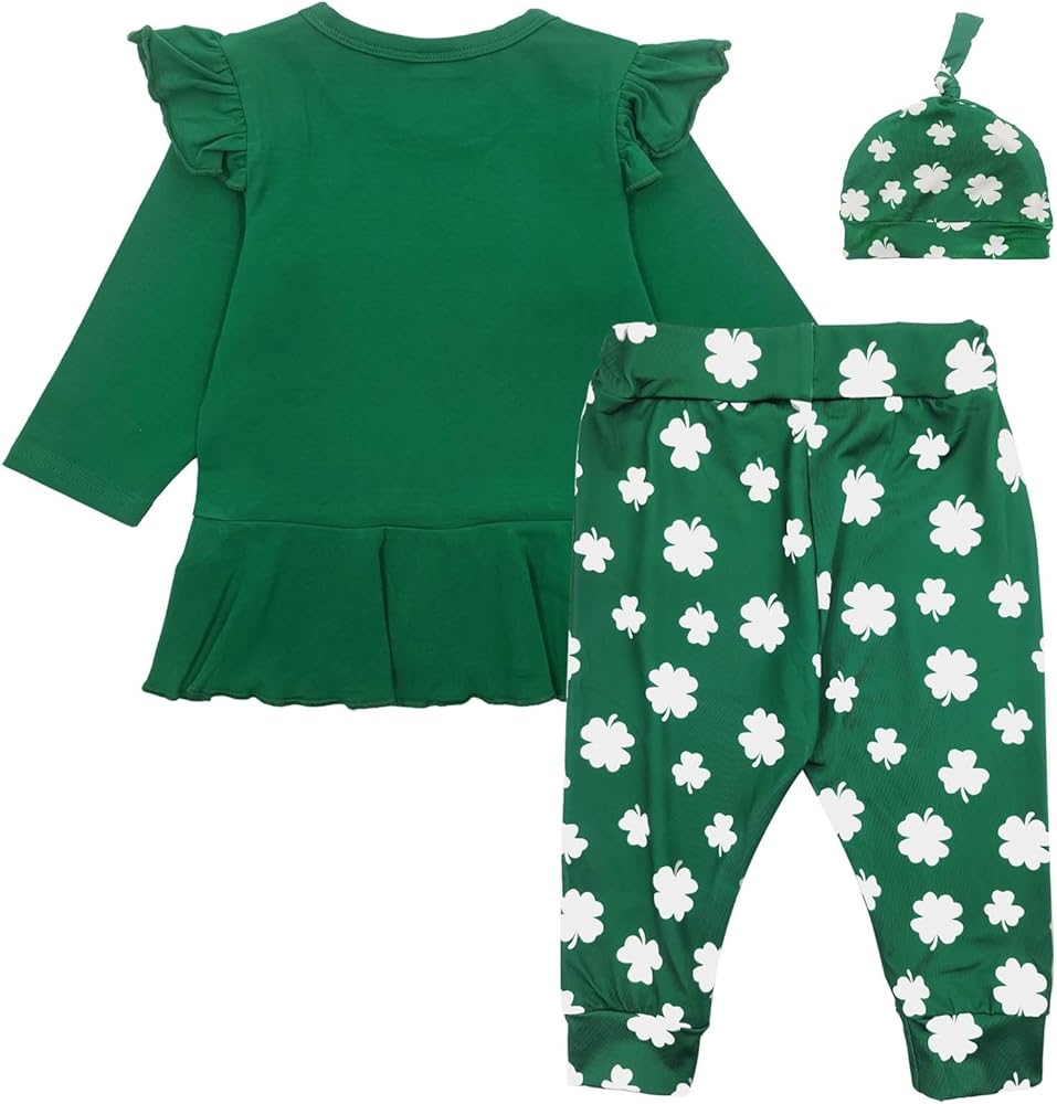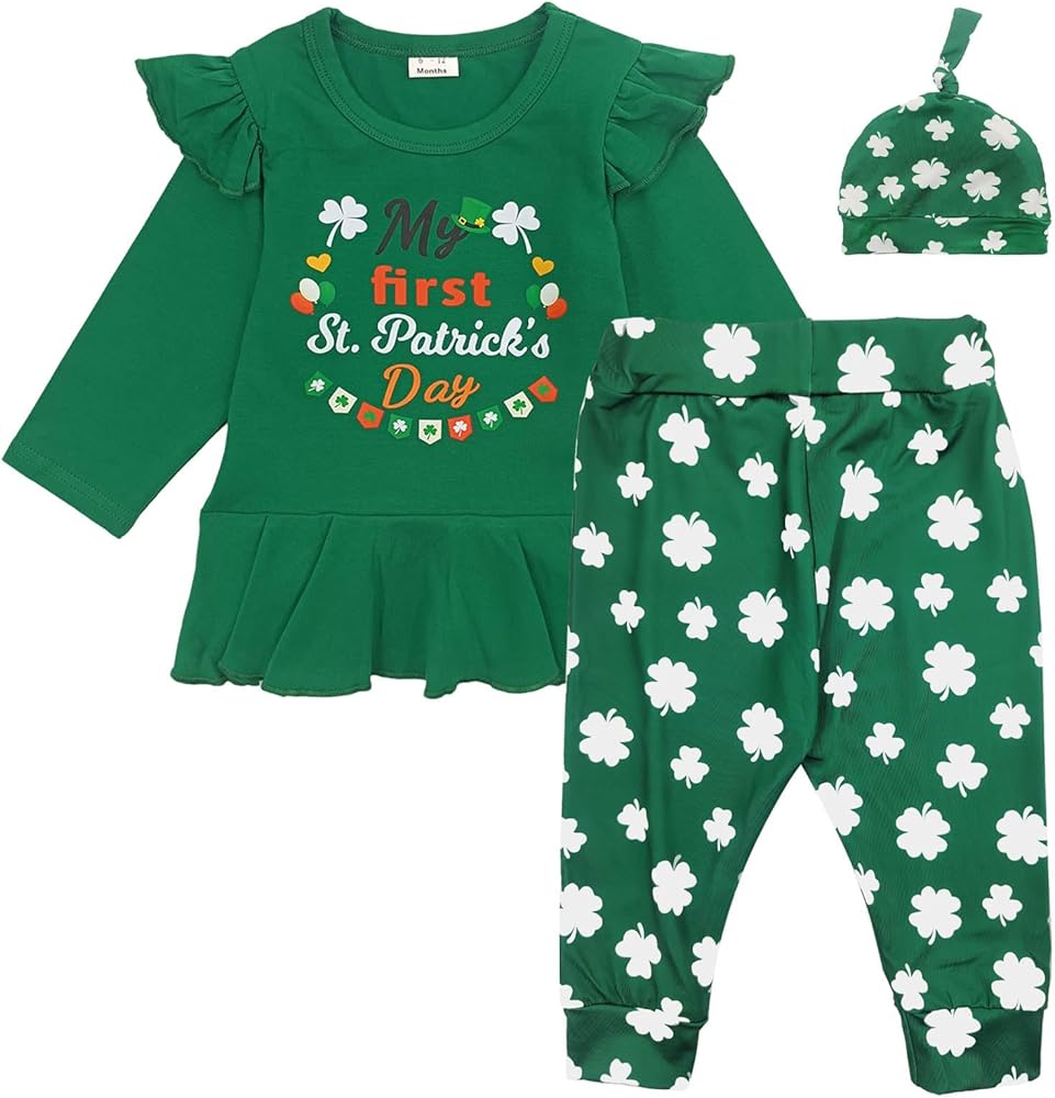 التصميم---3 قطع ملابس للفتيات حديثي الولادة في عيد القديس باتريك، أكمام طويلة مكشكشة، فستان تونيك لطيف مطبوع عليه حروف "My First St. Patrick's Day"، مليء بالسراويل الضيقة المطبوعة على شكل البرسيم، قبعة مرنة متطابقة، لطيفة جدًا وساحرة!