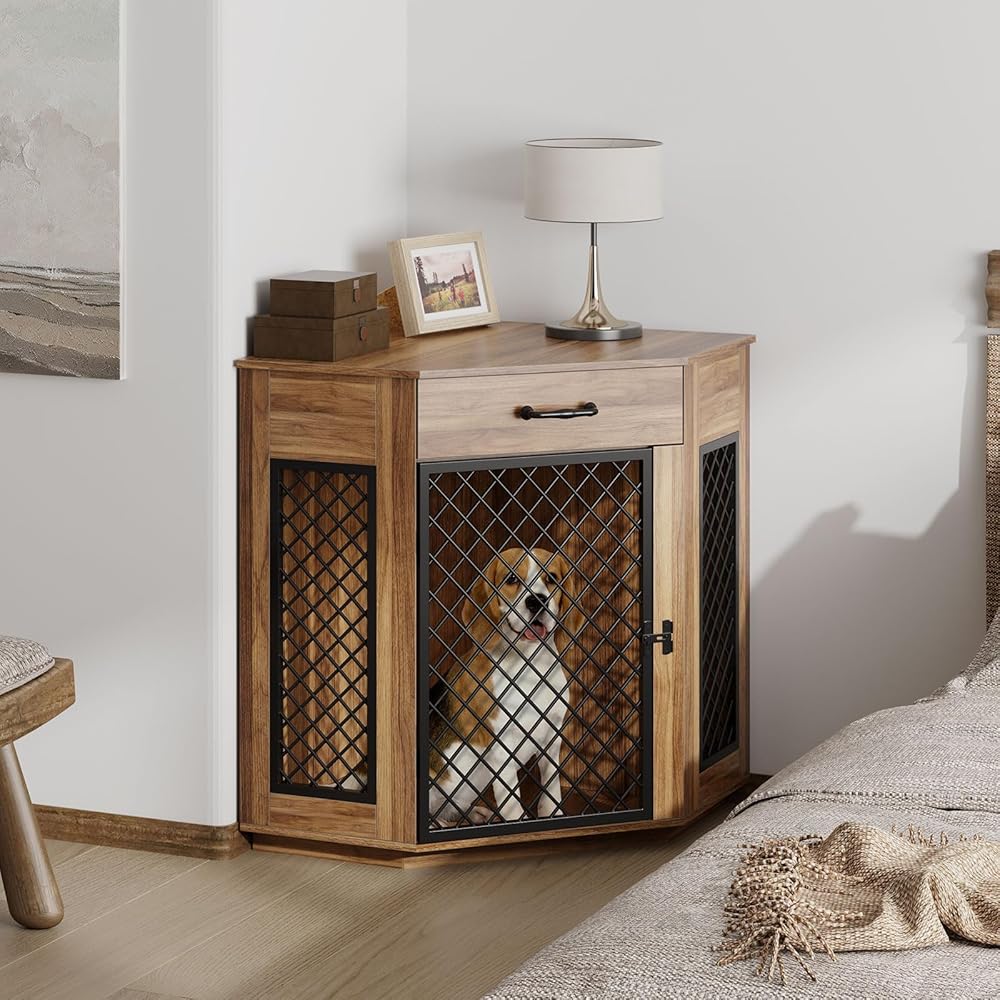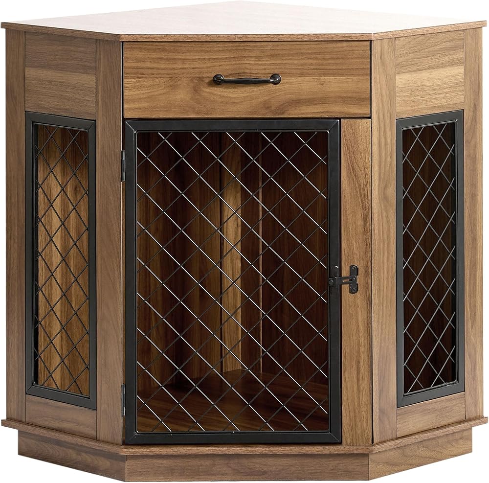 أثاث قفص زاوية للكلاب من sogesfurniture مع درج تخزين، طاولة نهاية بيت الكلب الخشبي للكلاب الصغيرة، بيت الكلب الداخلي مع باب شبكي معدني لغرفة المعيشة وغرفة النوم والمدخل، عتيق