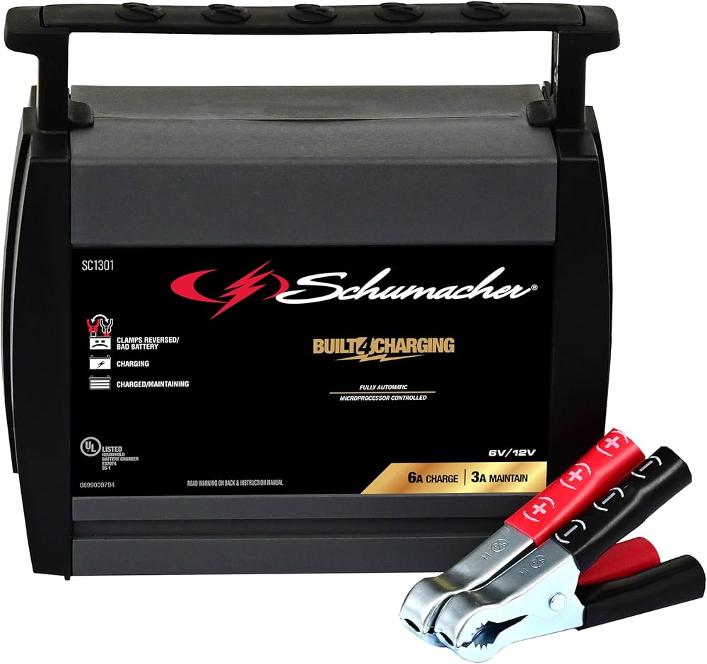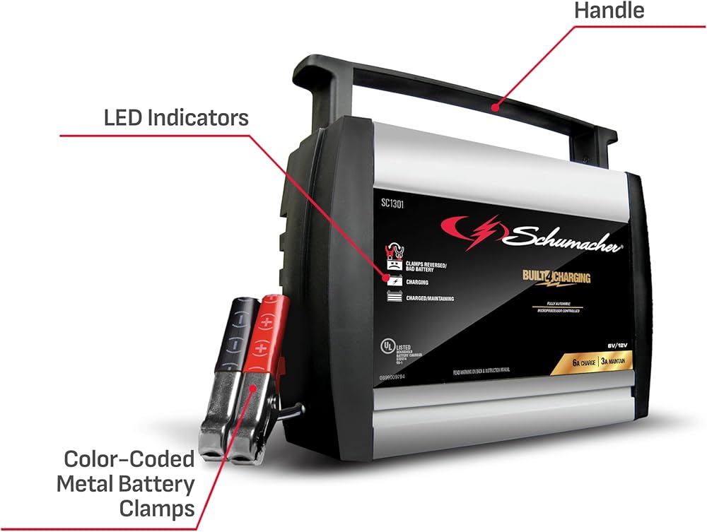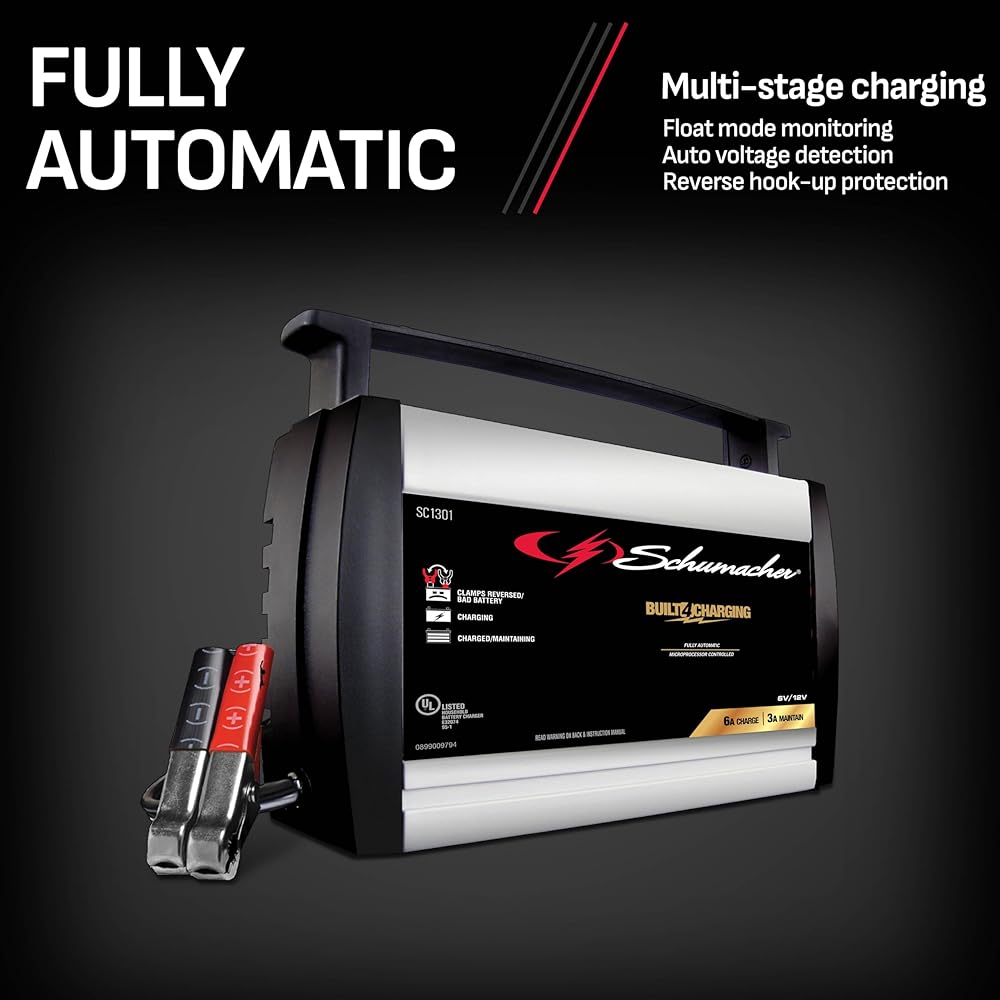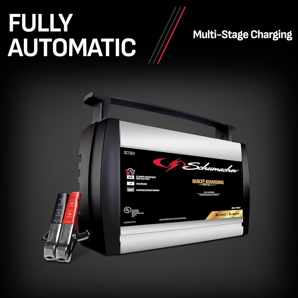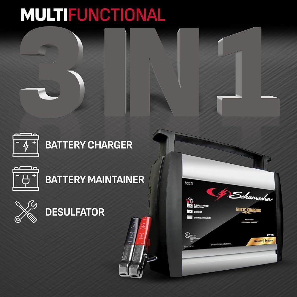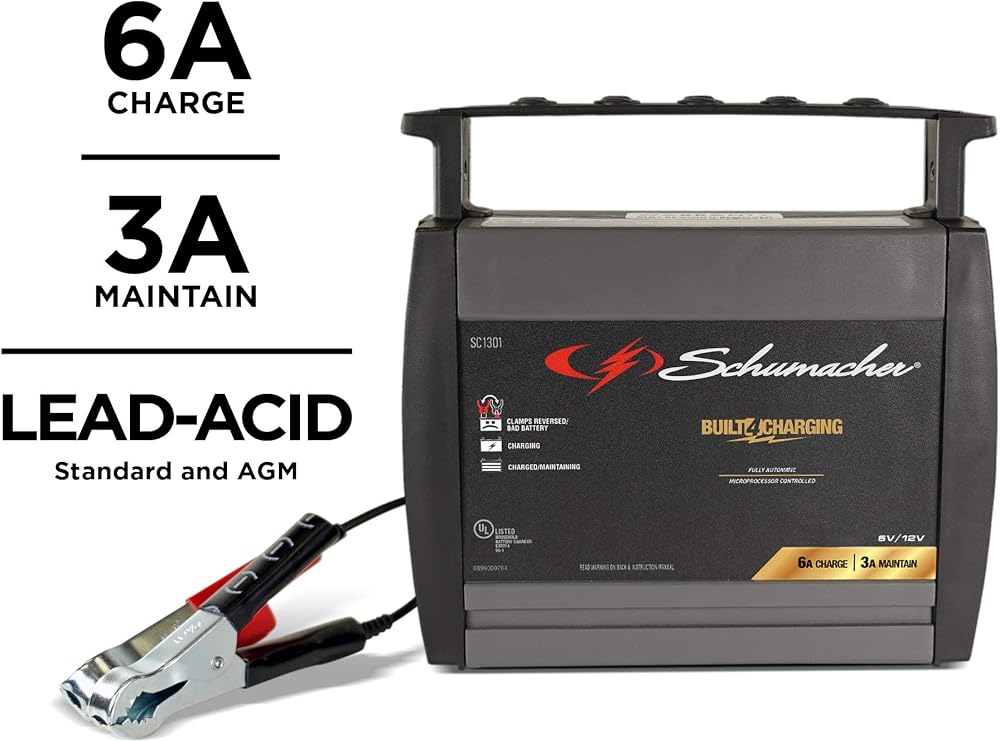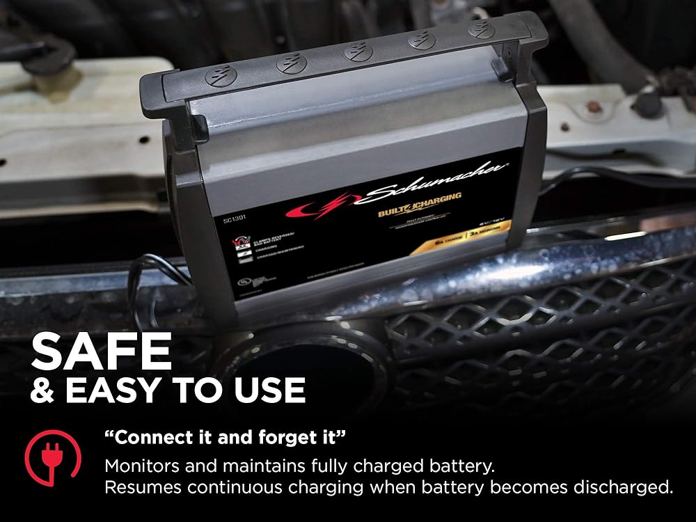 The Schumacher SC1301 Battery Charger and Maintainer is a great option for car, boat, or power sport batteries. Energy efficient and automatic, the unit features easy to connect clamp and ring terminal adapters. The microprocessor automatically adjusts the amperage rate, with multi-stage charging and float mode monitoring for optimum charging and maintaining to extend battery life. Includes reverse hook-up protection which prevents the charger from operating if the clamps are reversed. Schu Eco Energy meets the highest industry standards. Compatible with standard and AGM batteries.
