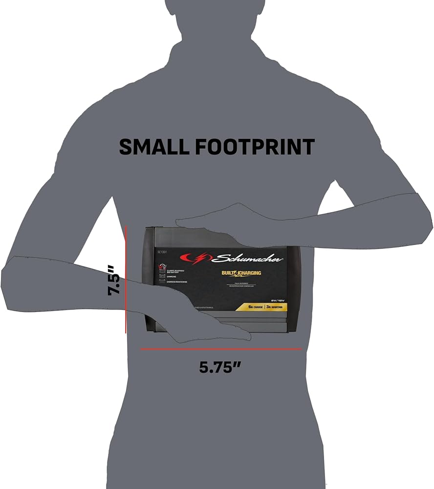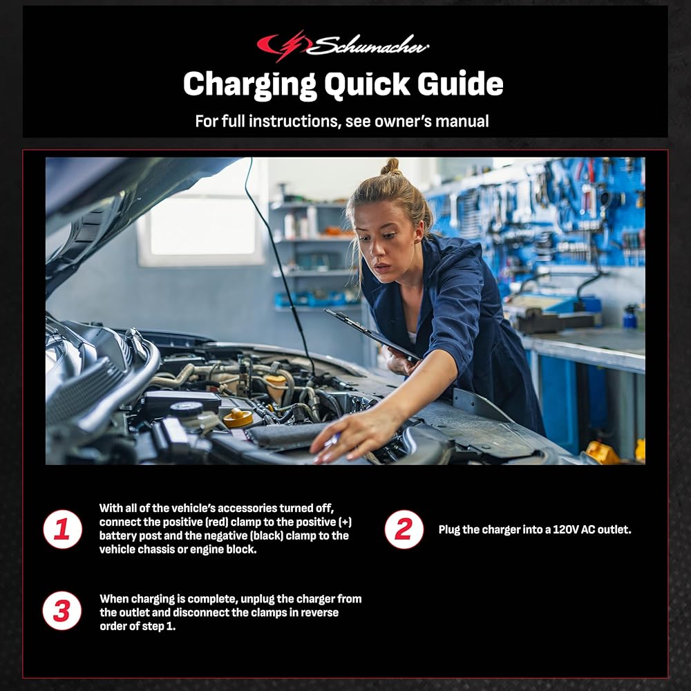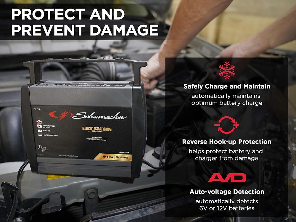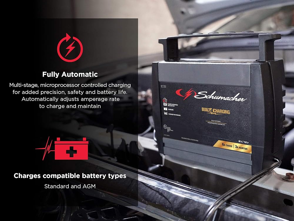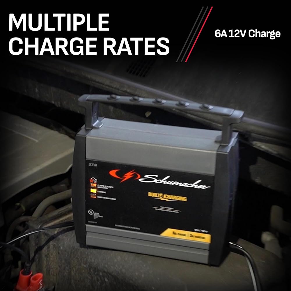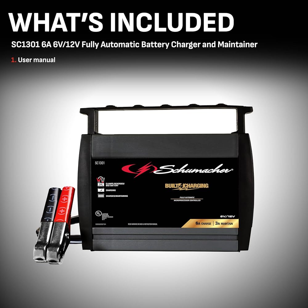 The Schumacher SC1301 Battery Charger and Maintainer is a great option for car, boat, or power sport batteries. Energy efficient and automatic, the unit features easy to connect clamp and ring terminal adapters. The microprocessor automatically adjusts the amperage rate, with multi-stage charging and float mode monitoring for optimum charging and maintaining to extend battery life. Includes reverse hook-up protection which prevents the charger from operating if the clamps are reversed. Schu Eco Energy meets the highest industry standards. Compatible with standard and AGM batteries.