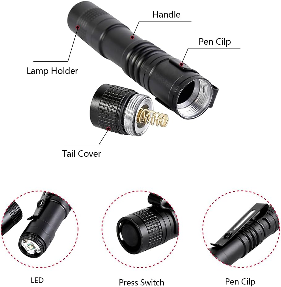 The package includes: you will get 5 pocket flashlights; The diffused beam of the flashlight illuminates the concentrated area, which is suitable for close tasks; And you can install 1 standard AAA batteries to last lighting for several hours (batteries are not included)