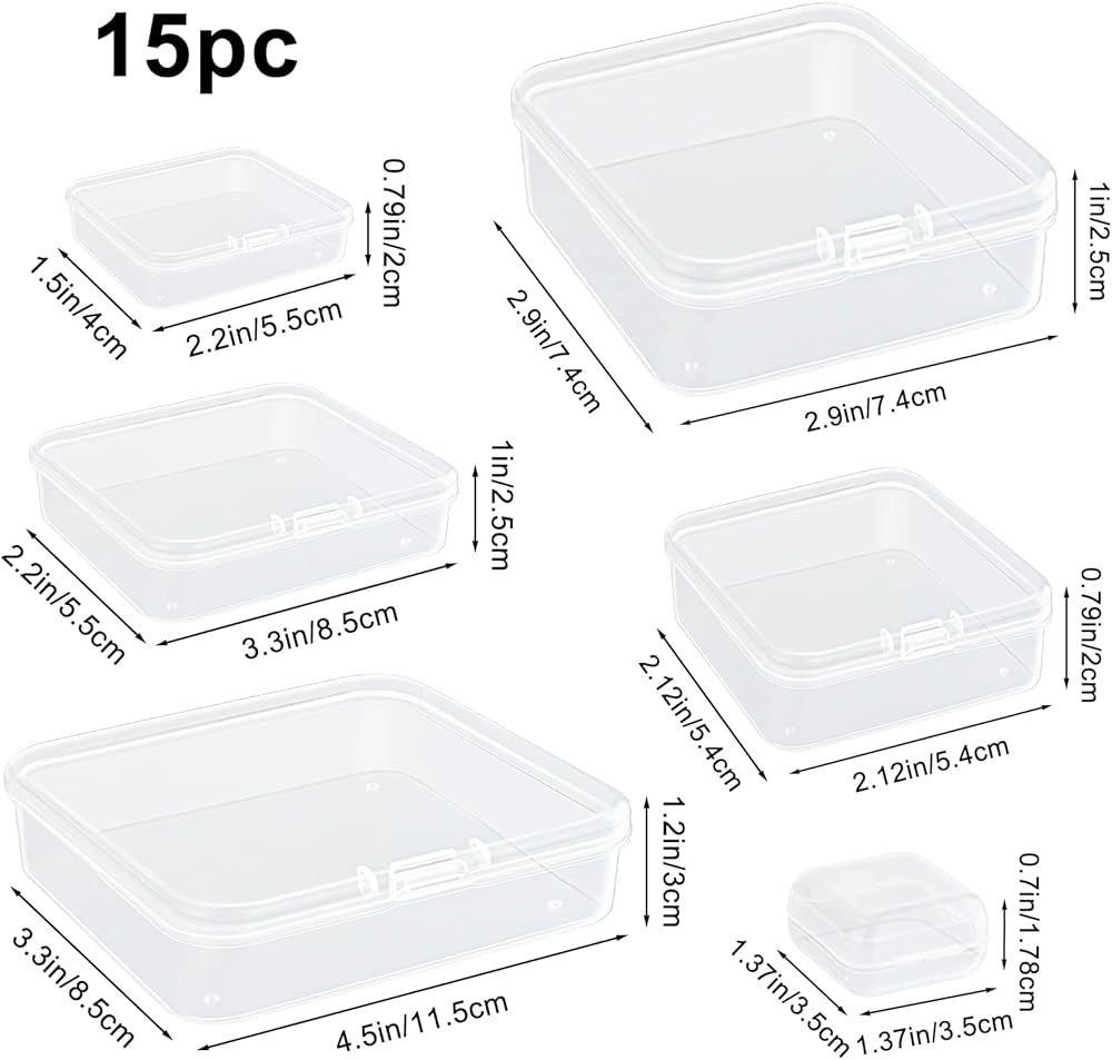 15 قطعة من حاويات التخزين الصغيرة، بأحجام مختلطة، صندوق حاويات تخزين بلاستيكي شفاف مستطيل صغير مع غطاء مفصلي للخرز، وتنظيم العناصر الصغيرة، والمشاريع الحرفية الأخرى