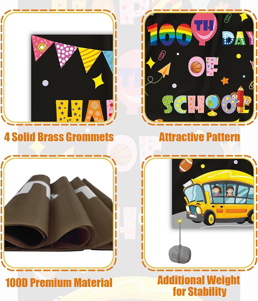 • ارفع روح المدرسة مع اللافتات الاحتفالية: استمتع بمتعة المعالم المدرسية مع اللافتات المصممة للاحتفال بأول 100 يوم من المدرسة. مصنوعة من نسيج البوليستر المتين 100D، تضيف هذه اللافتات لمسة من الدفء إلى الفصول الدراسية والأبواب الأمامية وخلفيات كشك الصور، مما يخلق جوًا لا يُنسى للطلاب.