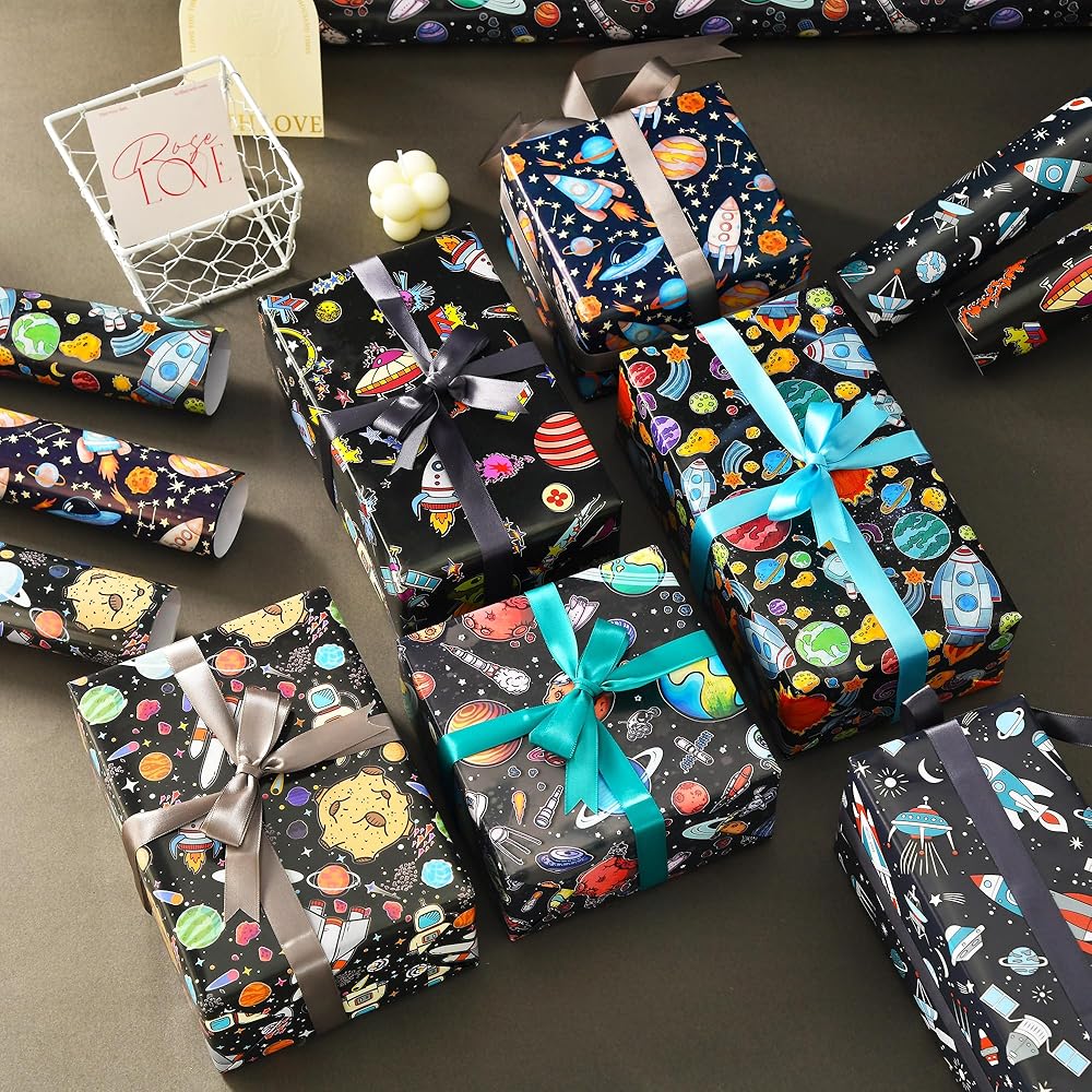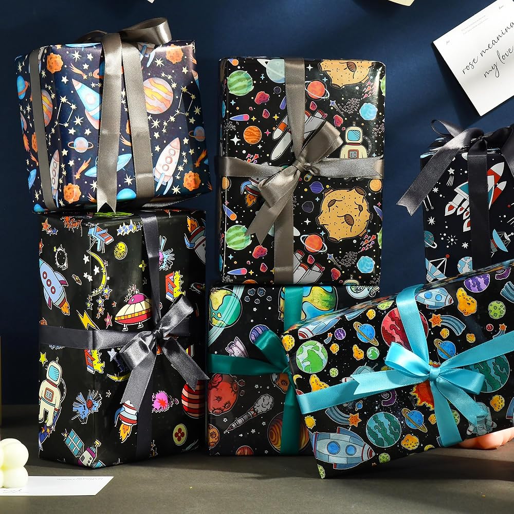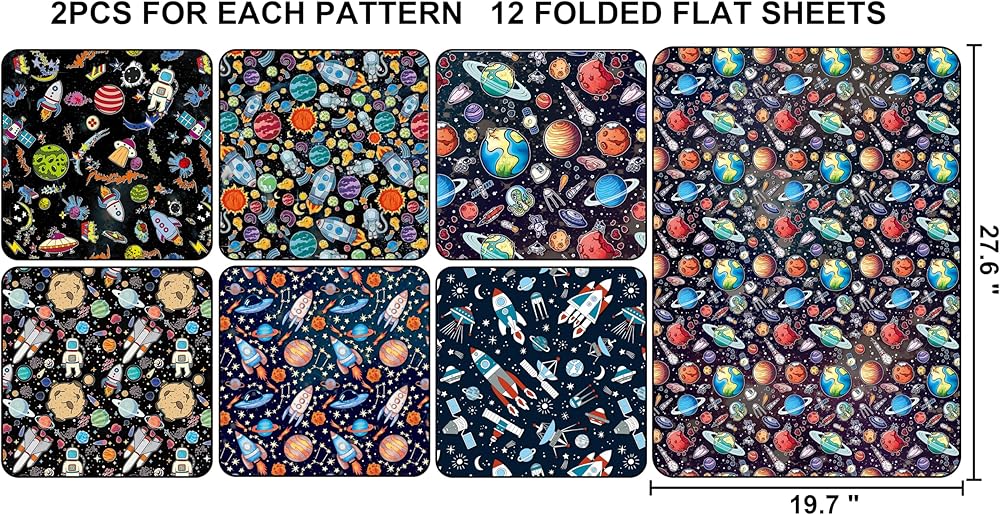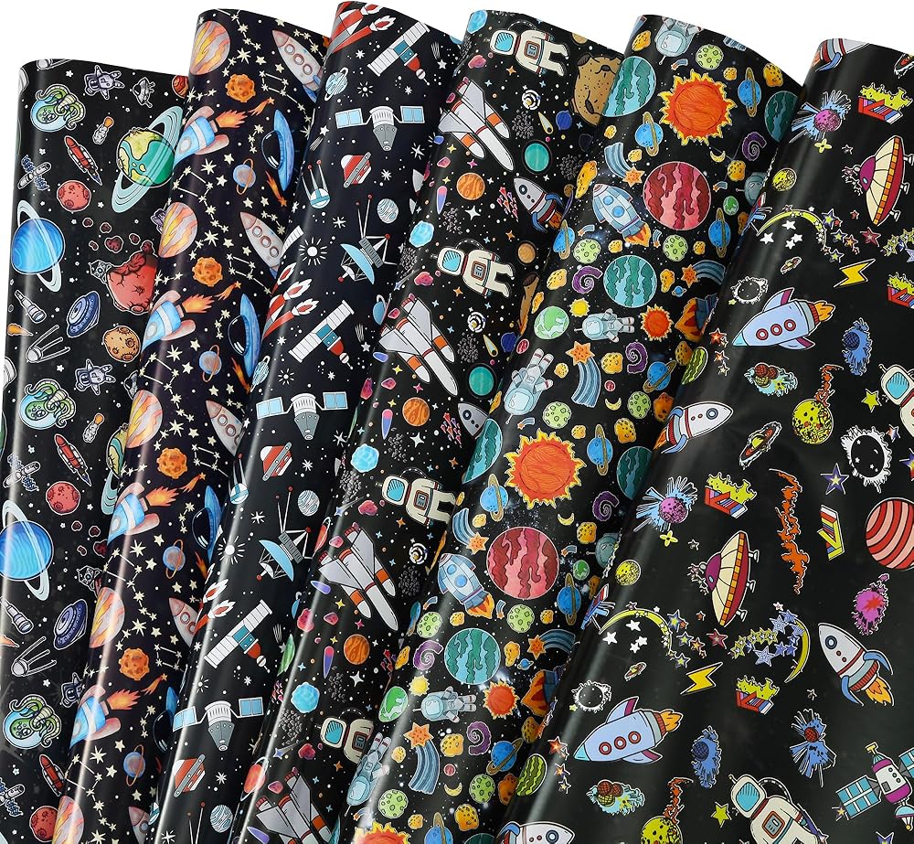 ورق تغليف الفضاء الخارجي: يتضمن 6 ورق تغليف لتصميمات الفضاء، كل تصميم ورقتين، مثالي للأولاد وأعياد الميلاد وعطلات عيد الميلاد