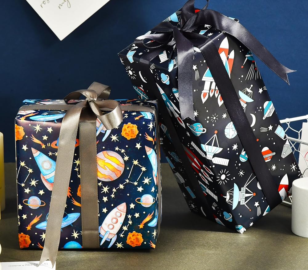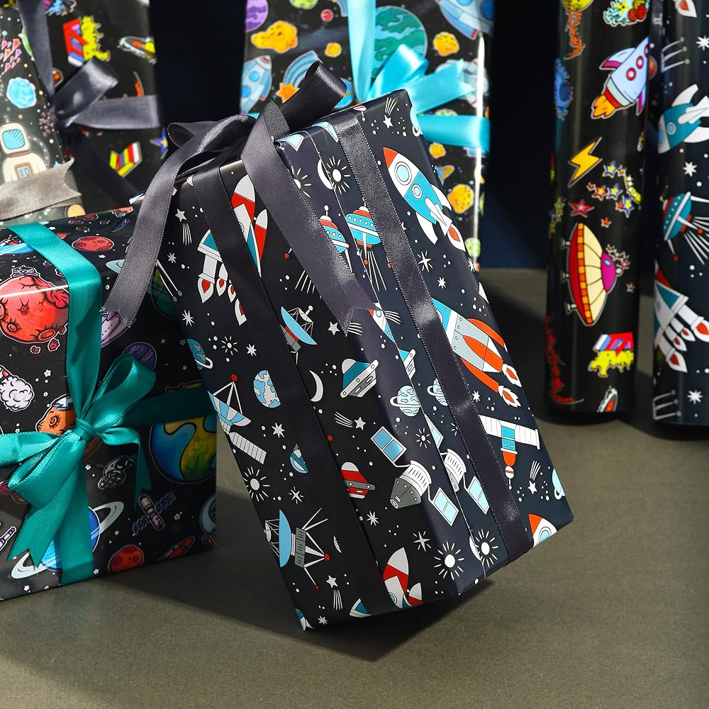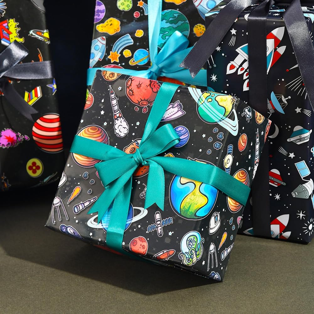 ورق تغليف الفضاء الخارجي: يتضمن 6 ورق تغليف لتصميمات الفضاء، كل تصميم ورقتين، مثالي للأولاد وأعياد الميلاد وعطلات عيد الميلاد