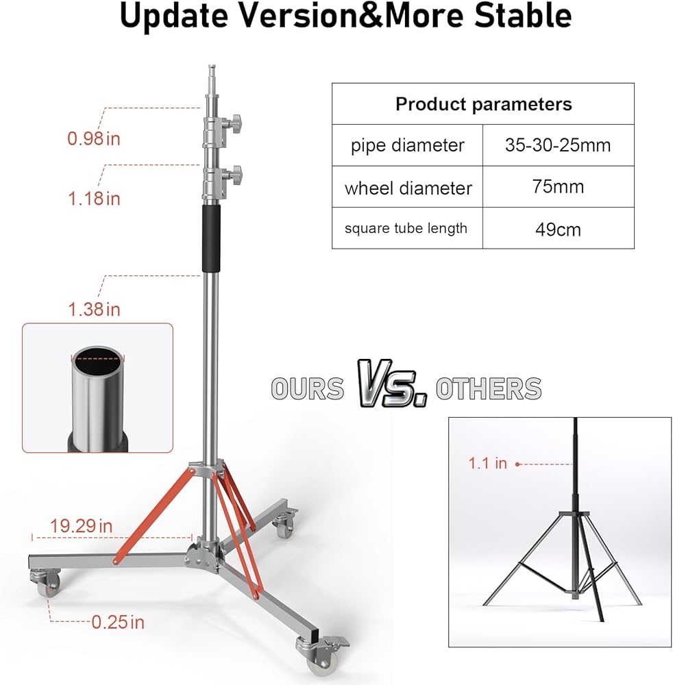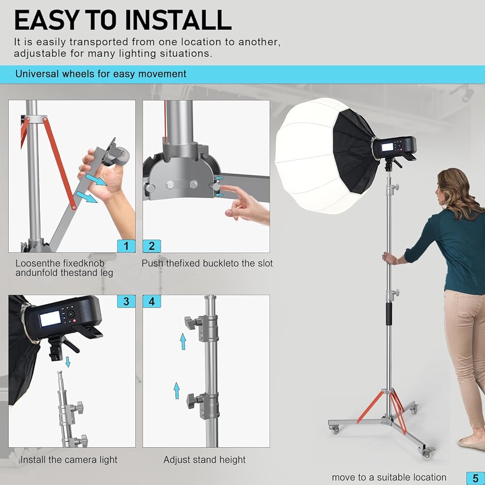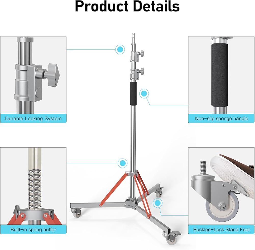 • 【تصميم آمن مع حامل وعجلة】مجهز بزنبرك عازل في حامل ثلاثي القوائم، والذي يمكن أن يقلل من تأثير السقوط المفاجئ لمعدات الإضاءة عند ضبط الارتفاع، وبالتالي حماية معدات الإضاءة.