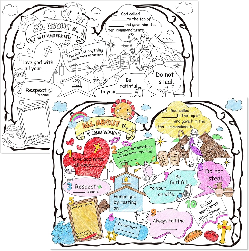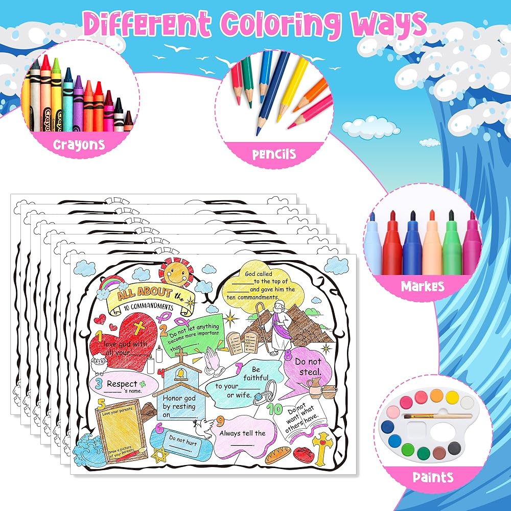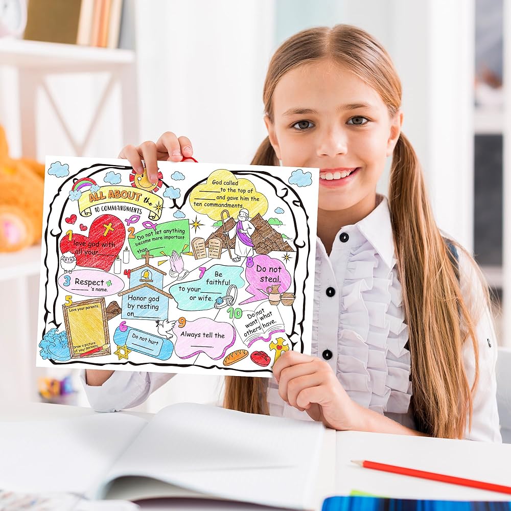 التعلم التفاعلي: يتميز الملصق الخاص بنا بمجموعة متنوعة من الأنماط وآيات الكتاب المقدس المتعلقة بالوصايا العشر، يمكن للأطفال إضافة لمستهم الشخصية إلى الملصق، مما يجعله تجربة تعليمية فريدة وشخصية، مما يجعله طريقة ممتعة وتفاعلية للأطفال للتعلم. واستكشاف تعاليم الكتاب المقدس.