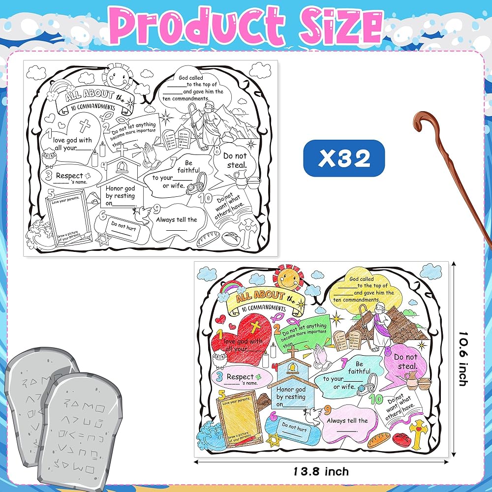 تشمل العبوة: سوف تحصل على 32 قطعة من ملصقات الوصايا العشر باللونين الأسود والأبيض. يمكن أن تلبي الملصقات الكافية احتياجات الأطفال في صفك، وسيقوم الطلاب بملء وتزيين ومشاركة الوصايا العشر مع زملائهم في الفصل.