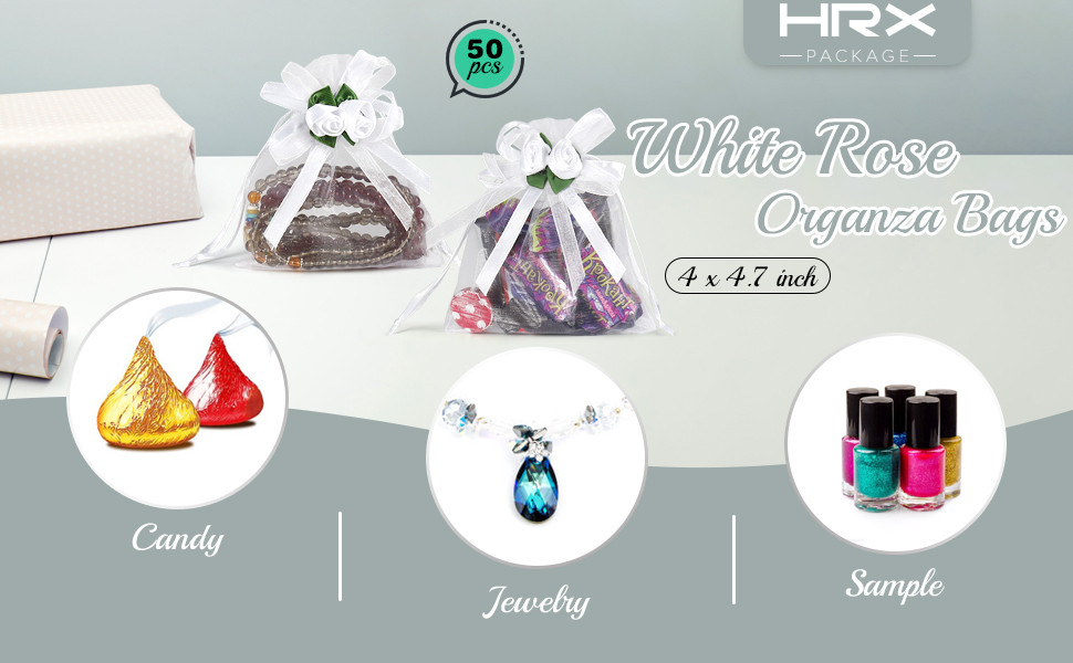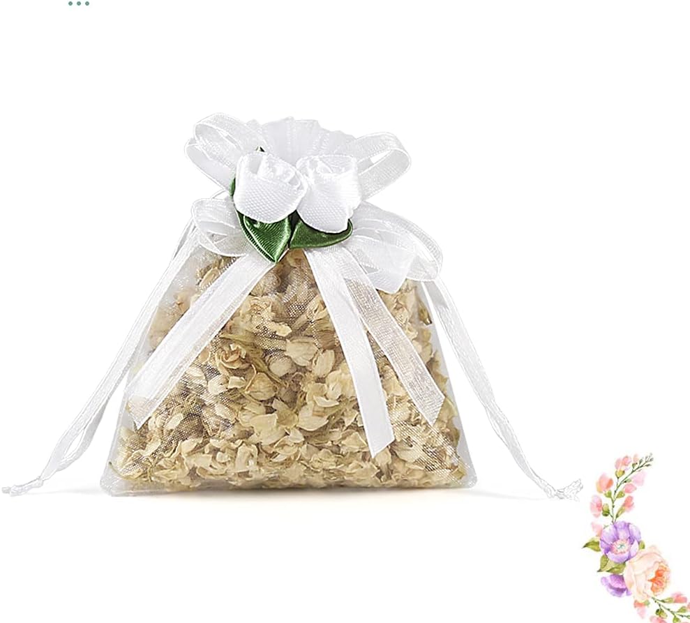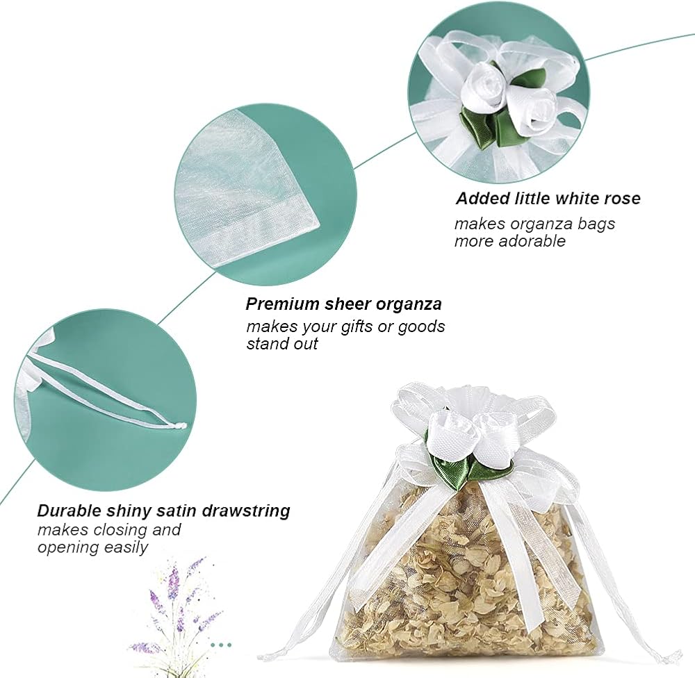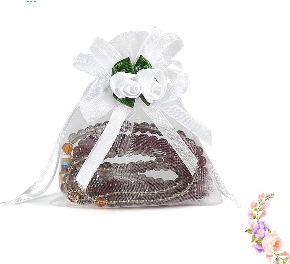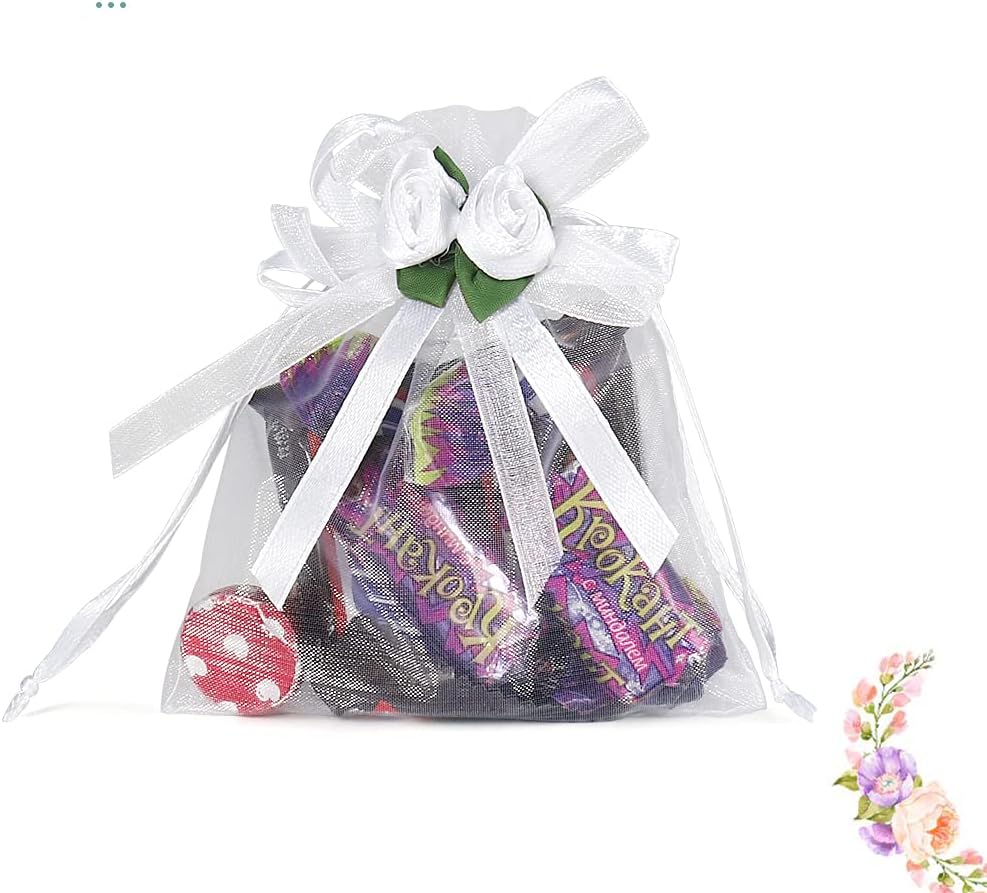 تصميم الورد الأبيض - حقائب الهدايا الأورجانزا هذه المزينة بالزهور الجميلة أكثر روعة وأناقة. تصميم برباط يجعل تغليف الهدايا سهلاً، ويمكنك إغلاق الحقائب وفتحها بحرية
