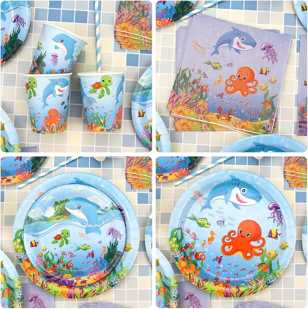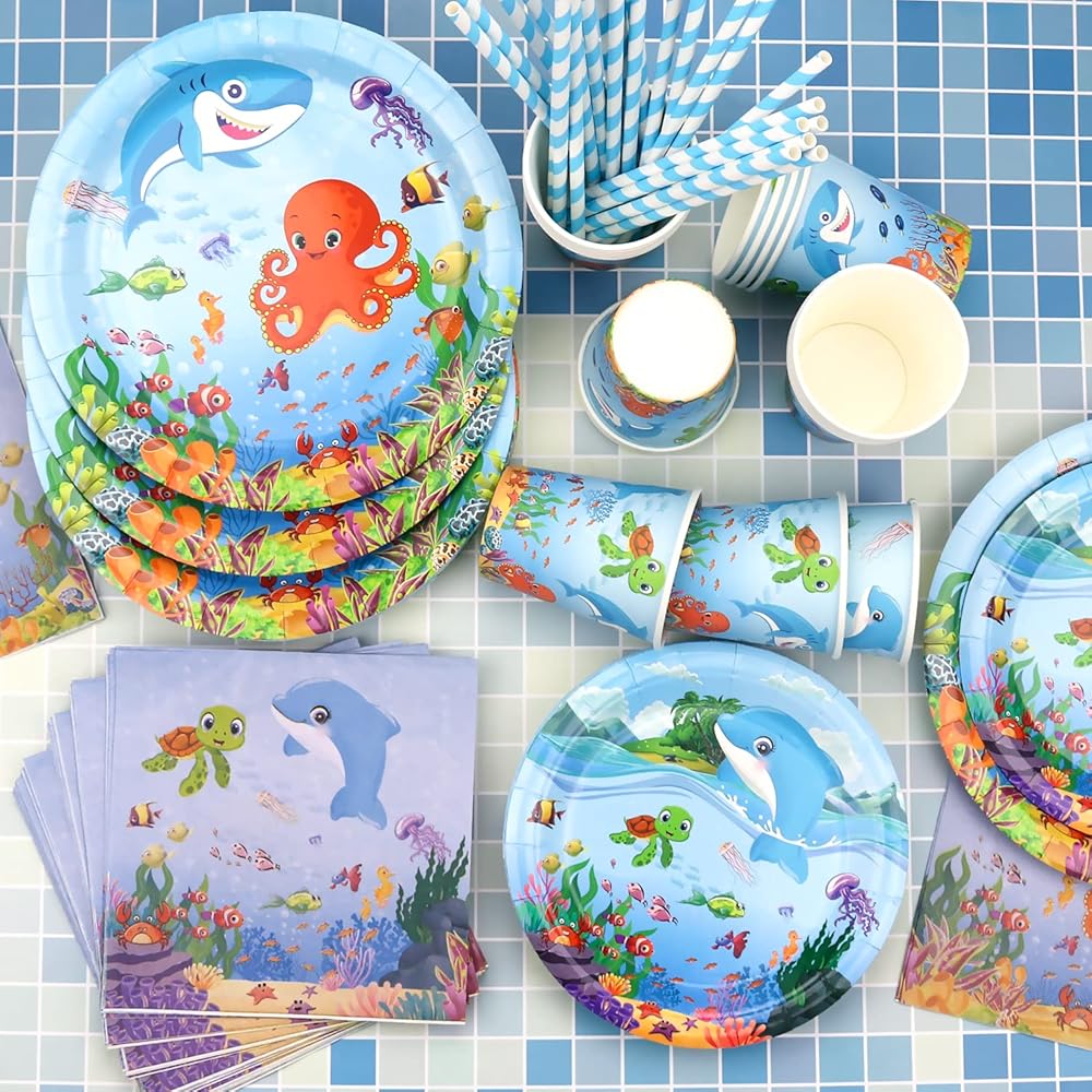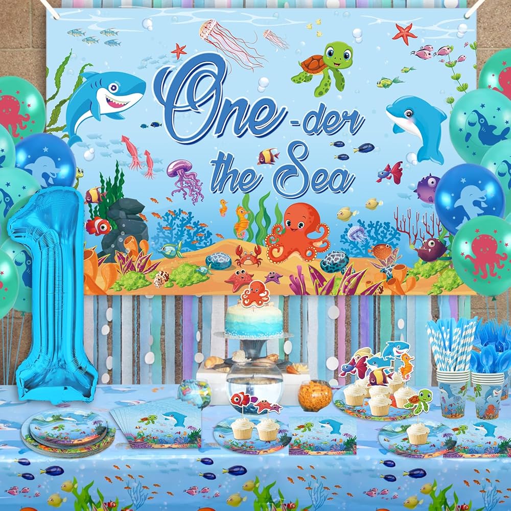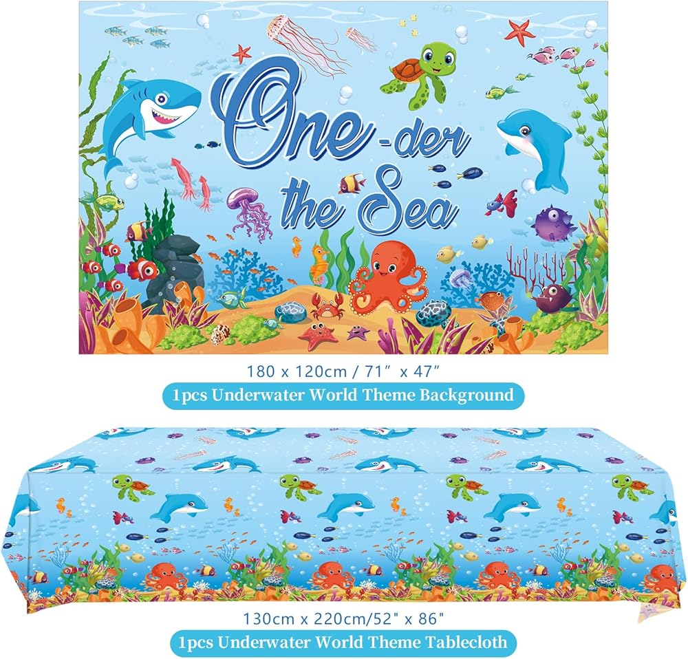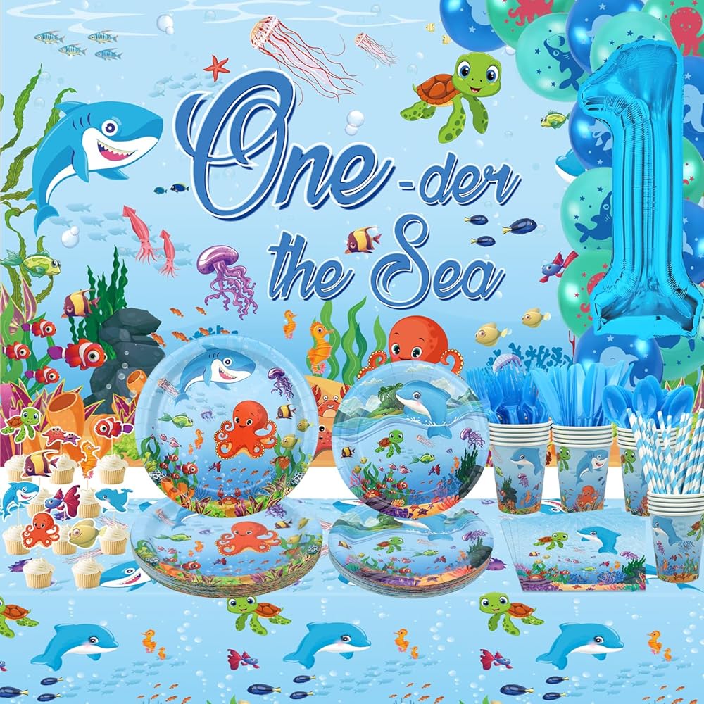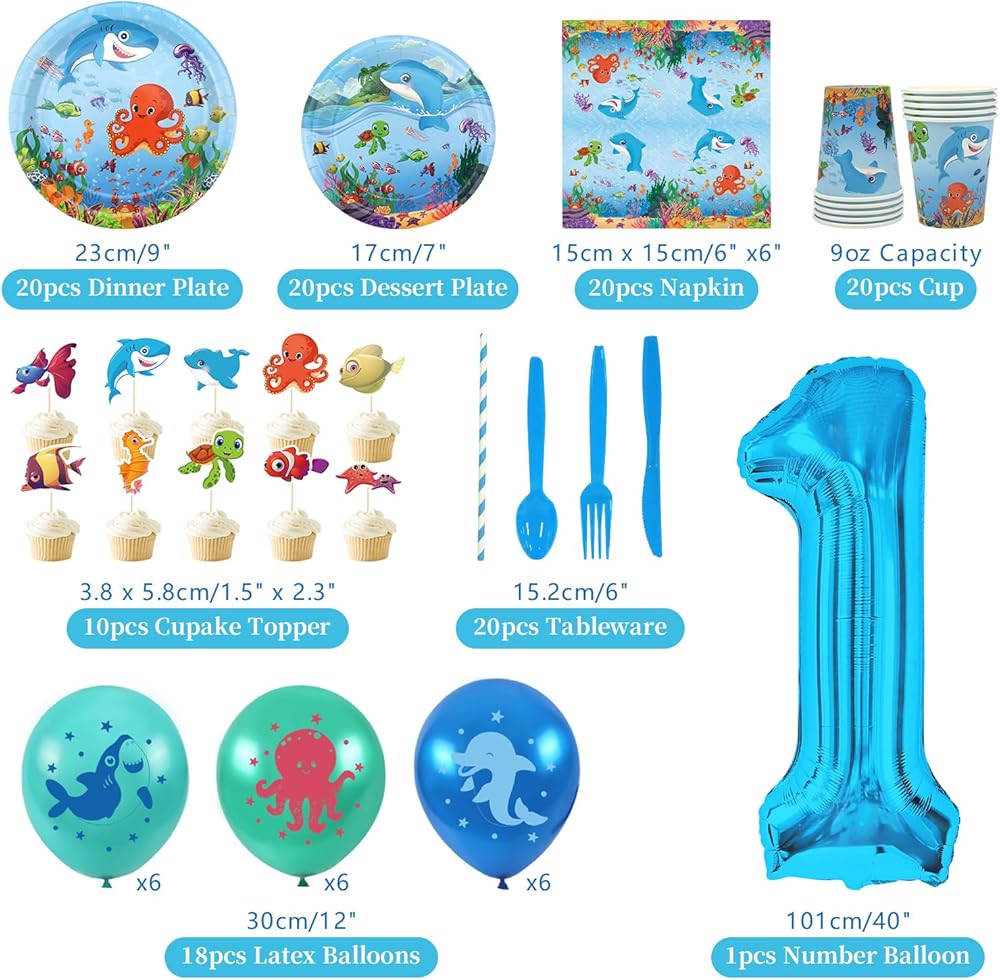 ديكورات حفلات أندر ذا سي، لوازم عيد ميلاد أوندر ذا سي، خلفية، طبق، كوب، منديل، مفرش طاولة، أدوات مائدة، بالونات، وأغطية الكعك لحفلة عيد الميلاد الأول للبحر تحت الماء، تخدم 20 شخصًا