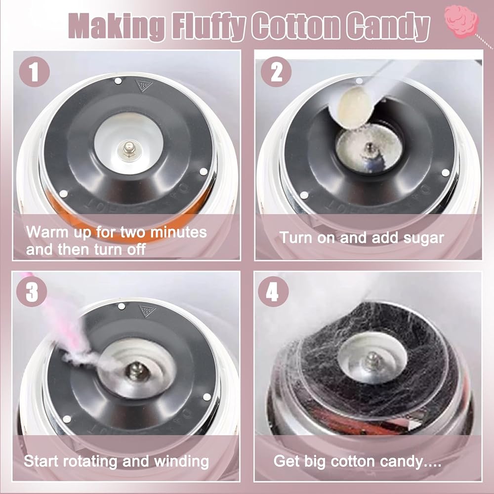 1. العملية الشرقية: فقط قم بتشغيل الطاقة، وانتظر بضع دقائق حتى تسخن، ثم اسكب السكر البودرة، ثم ابدأ في تدوير حلوى القطن، وستحصل قريبًا على حلوى قطنية لذيذة.