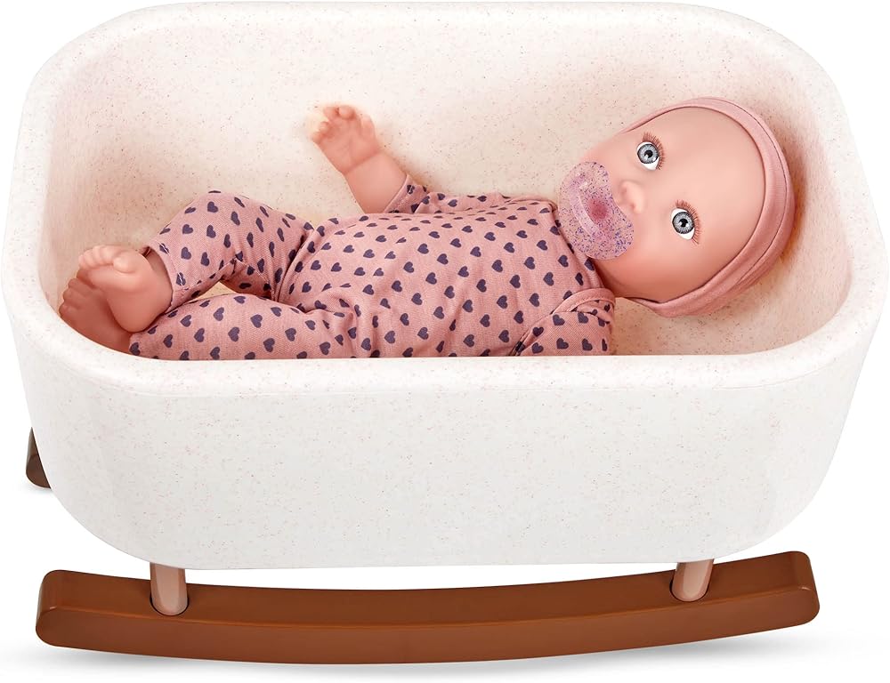 تشتمل على: بيبي جيرل تستقر في بيجامة على شكل قلب بولكا مع قبعة مطابقة، ولهاية قابلة للإزالة، وسرير هزاز.