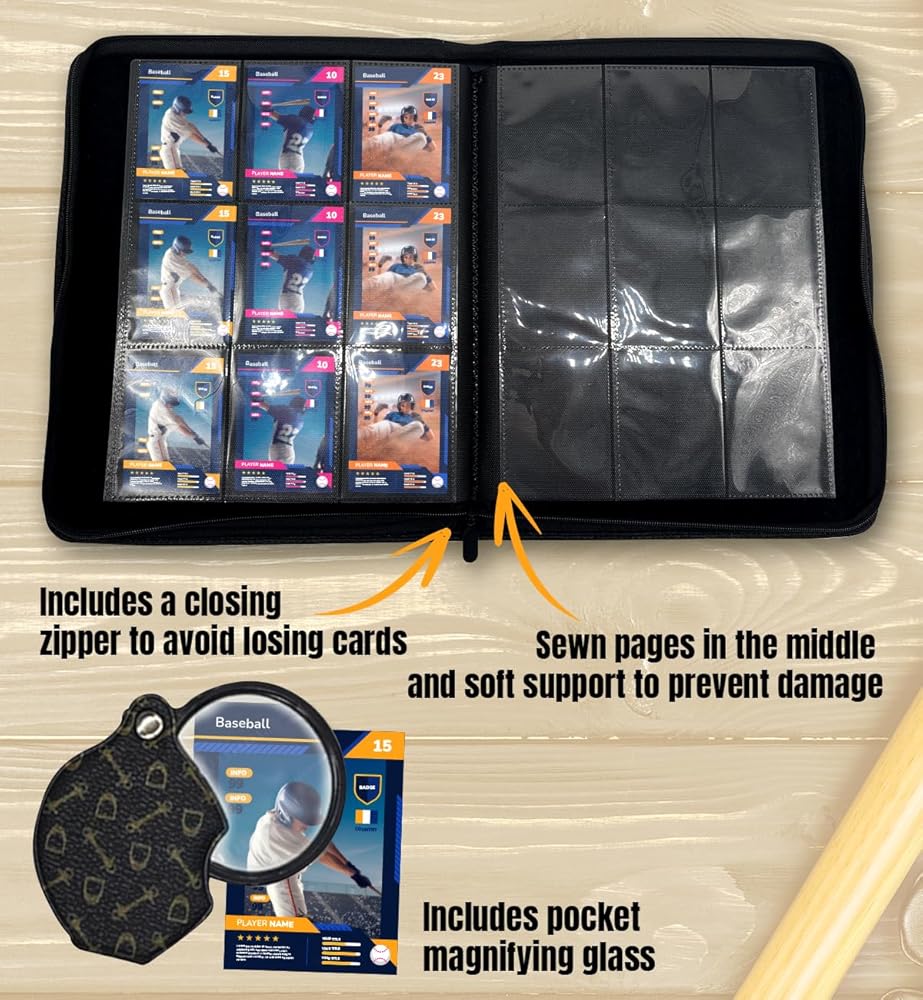 • [جودة ممتازة]: عند شراء حافظة بطاقات البيسبول الخاصة بنا، ستكون بطاقات مجموعتك محمية بالكامل. تتميز كل حجرة من مجلدات حماية البطاقات لدينا بخلفية ناعمة مع نسيج لطيف للحفاظ على البطاقات في حالة ممتازة. على عكس منافسينا، لا تحتوي حاملات بطاقات البيسبول لدينا على حلقات معدنية لتجنب الحوادث مع الأشخاص أو البطاقات