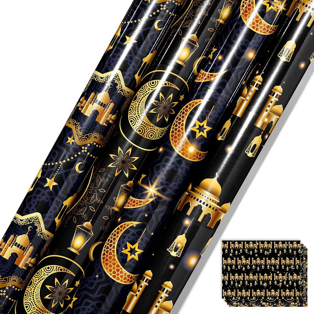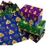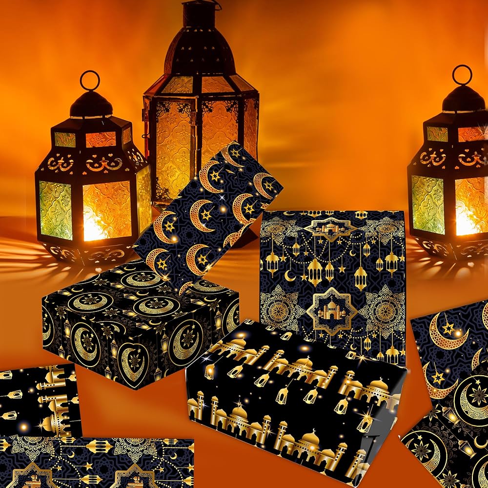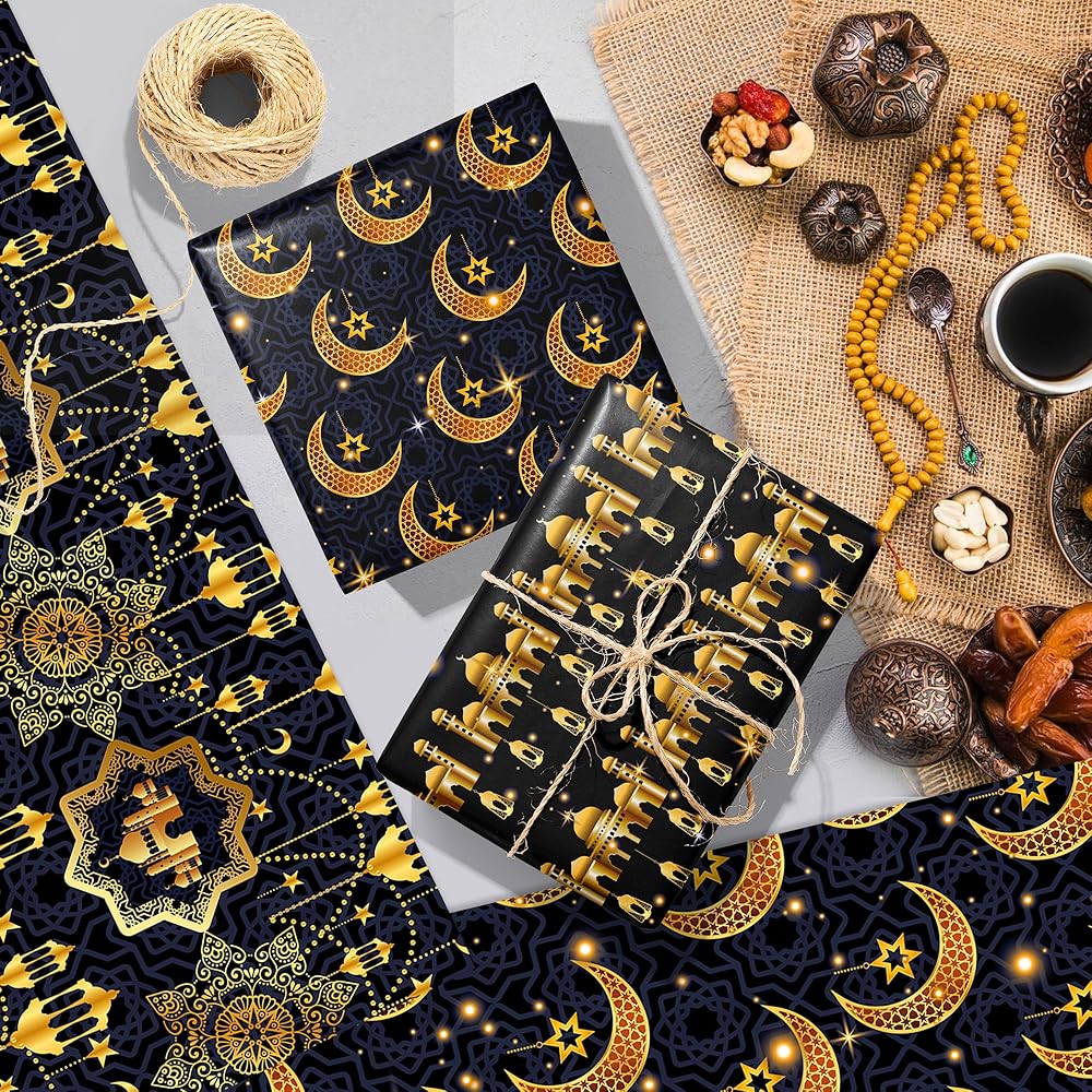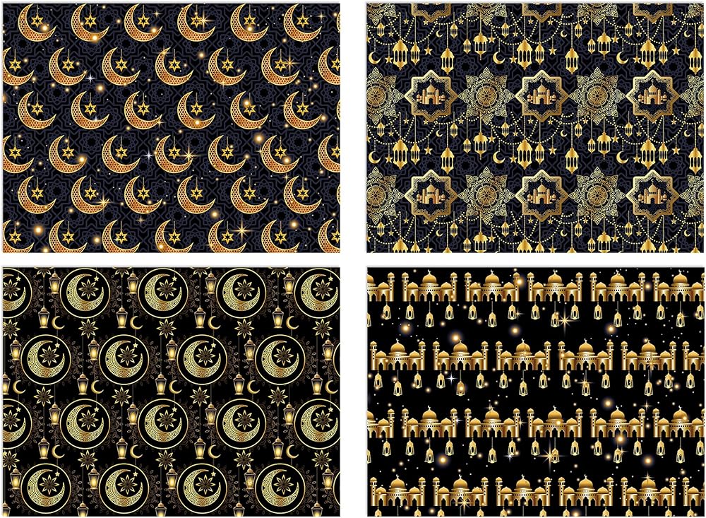 تتضمن العبوة: 12 ورقة من ورق تغليف هدايا رمضان الفاخر، مع 4 تصميمات مختلفة، كل تصميم يحتوي على 3 أوراق