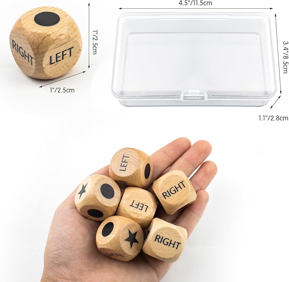 تصميم النرد: النردات ذات 4 علامات في كل أنبوب - "يسار"، ""(الوسط)،" "يمين" و""(نقطة)، النرد المصنوع من خشب الزان متين للغاية.