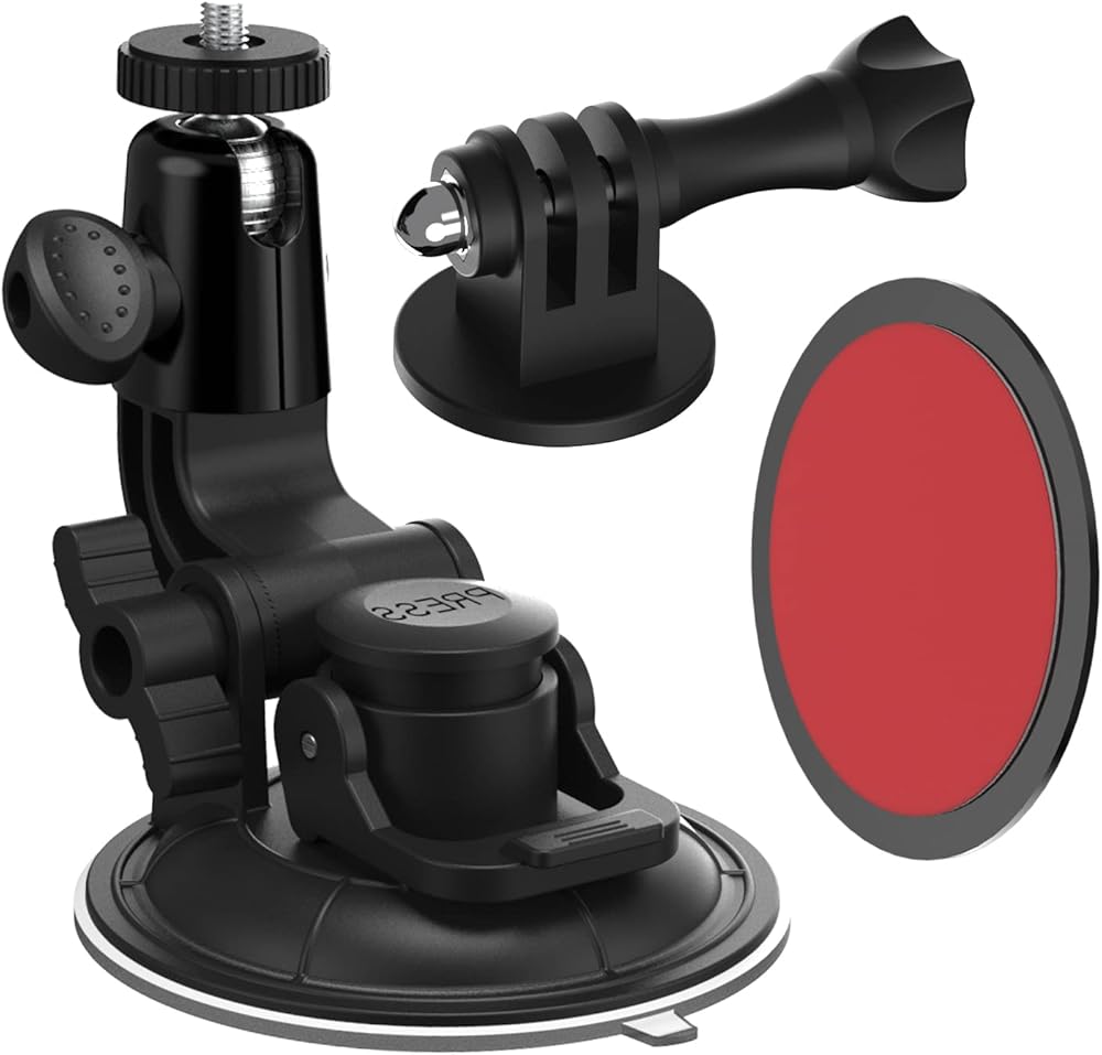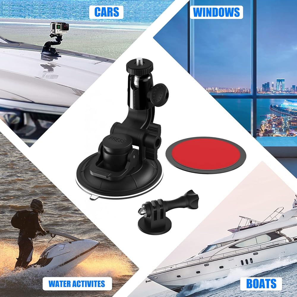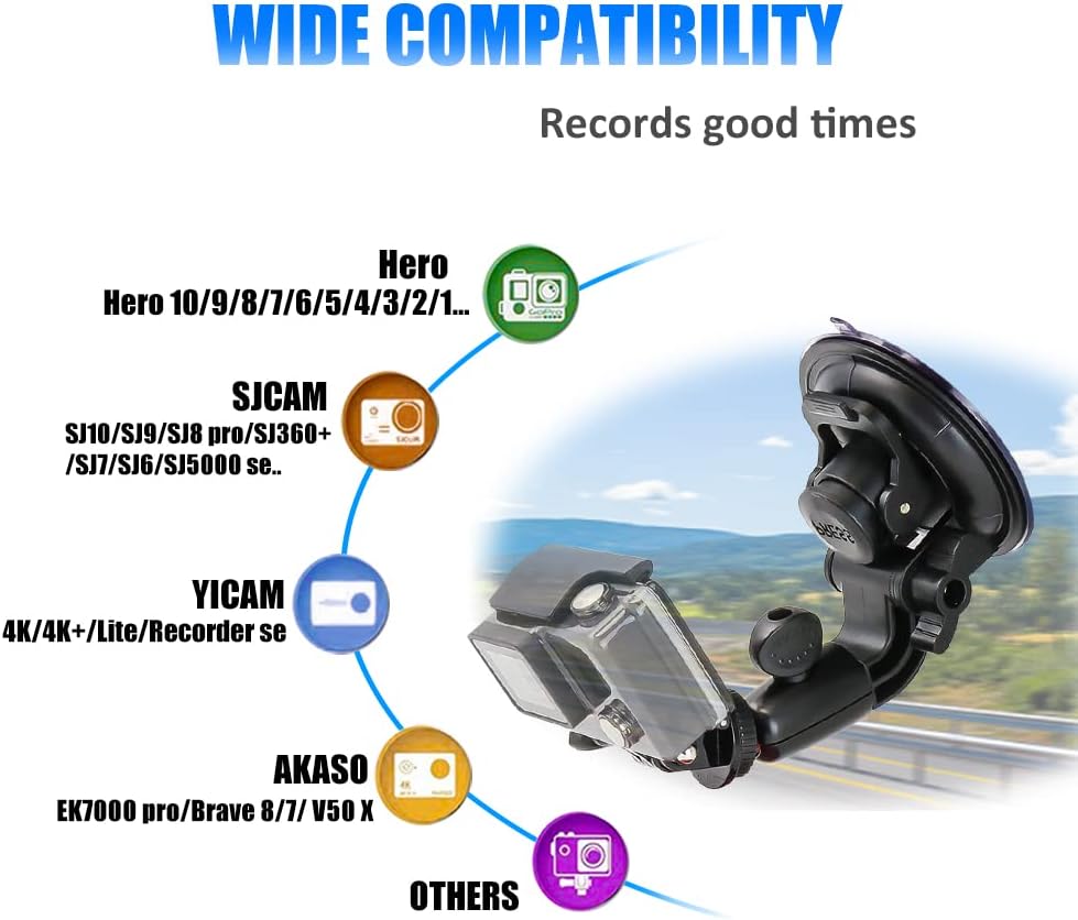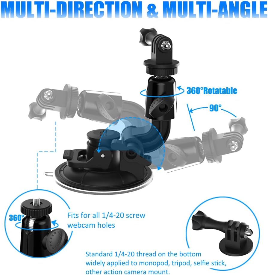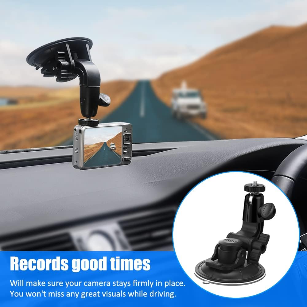 توافق واسع: حامل كوب الشفط عالي التحمل من Charchendo مع خيط برغي قياسي 1/4-20، يناسب الكاميرا الرياضية، وكاميرا الفيديو، وDVR، وأضواء الفيديو LED. مثل GoPro Hero 10 9 8 7 6 5 وCanon وNikon وSony وQumox وSJCAM وFujifilm وVicture وغيرها من الكاميرات الرياضية.