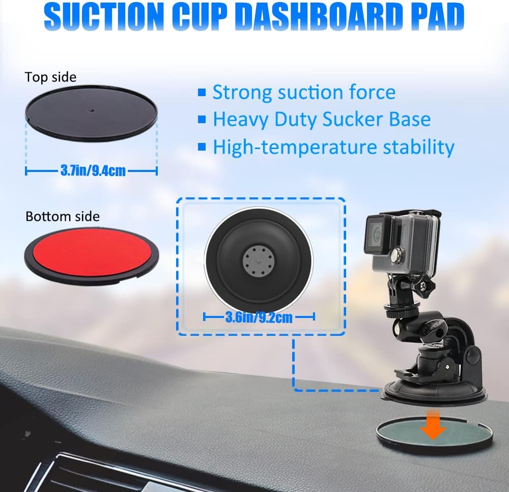 【قفل ثابت ومضاد للانزلاق】حامل تثبيت بالشفط لكاميرا الحركة سيكون من السهل لصقه على الزجاج الأمامي للسيارة أو لوحة القيادة أو النافذة أو أي سطح أملس (يأتي مع لوحة لوحة قيادة لاصقة واحدة حتى مناسبة للأسطح غير المستوية). تصميم بسيط وصغير الحجم، سهل الضغط على زر واحد لتثبيت الجهاز وتحريره.