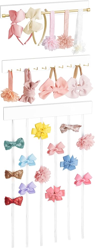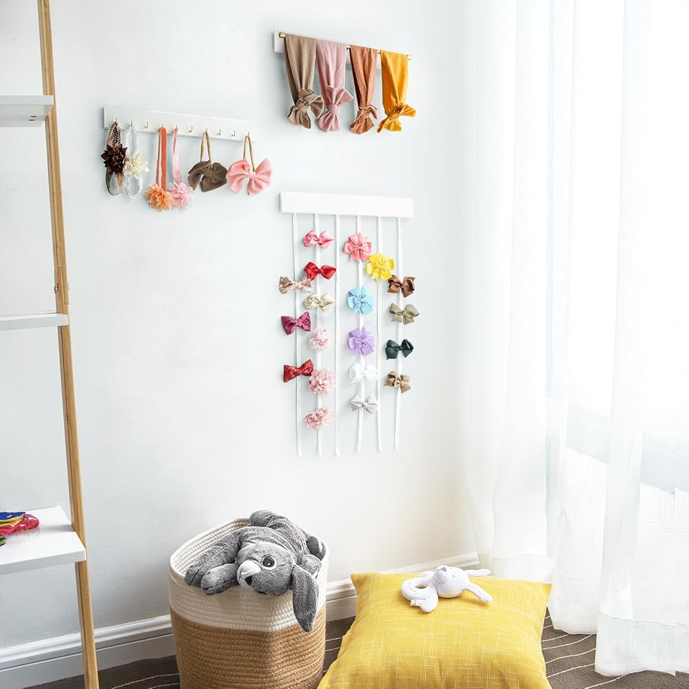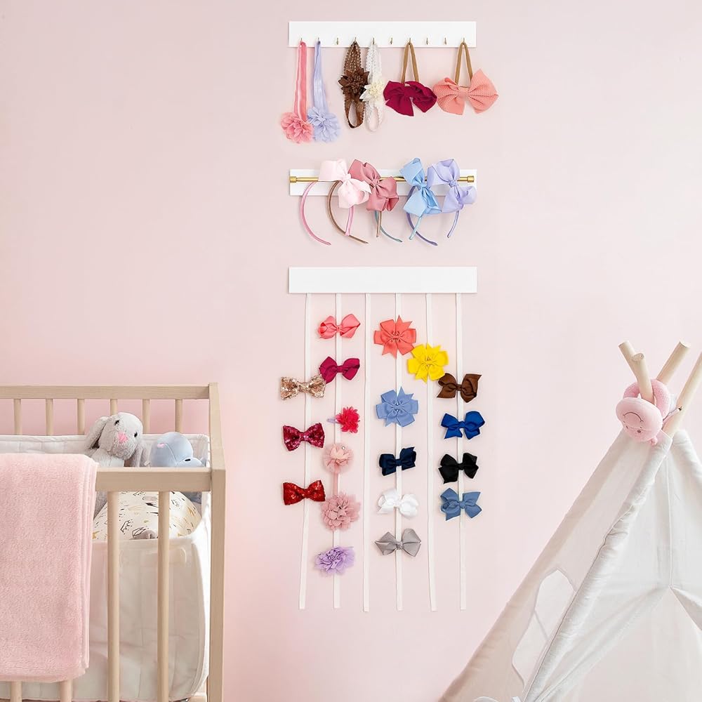 داهي القوس حامل للفتيات الشعر الأقواس المنظم حامل عقال مع شريط معدني و 10 السنانير الحديثة القوس شماعات مجموعة من 3 مقاطع الشعر الخشبية تخزين الفتيات إكسسوارات شعر الطفل لغرفة الحضانة الفتيات
