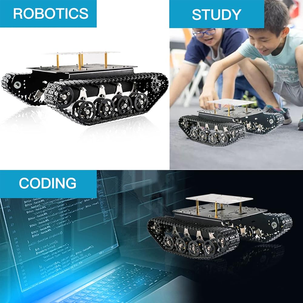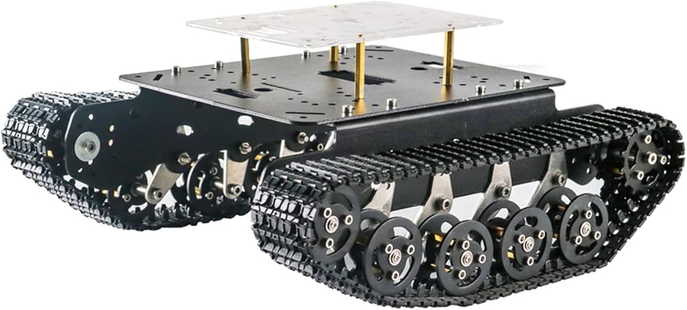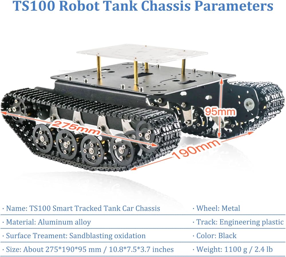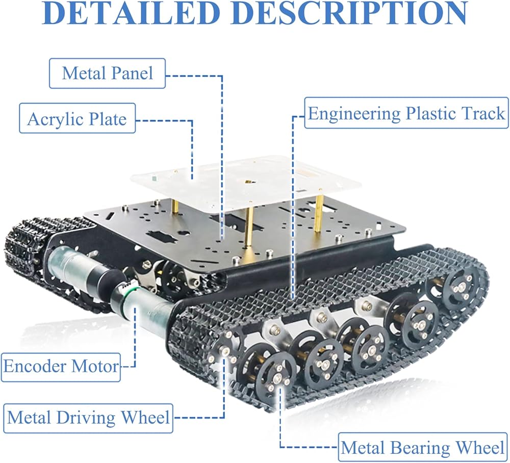 • هيكل روبوت ممتص للصدمات - تحتوي مجموعة هيكل السيارة المعدنية الذكية الممتصة للصدمات على 10 قطع عجلات تحمل، قطعتين من عجلات القيادة، منها 8 قطع عجلات تحمل مع 8 قطع زنبركات وحوامل دعم التعليق مع وظيفة نظام التعليق التخميد. أكثر من 20 قطعة من المحامل تجعل هيكل سيارة الخزان هذا يعمل بسلاسة وله احتكاك منخفض. لذلك، يمكن لهيكل الخزان هذا أن يتجنب بسهولة بعض العوائق، مثل الحصى.