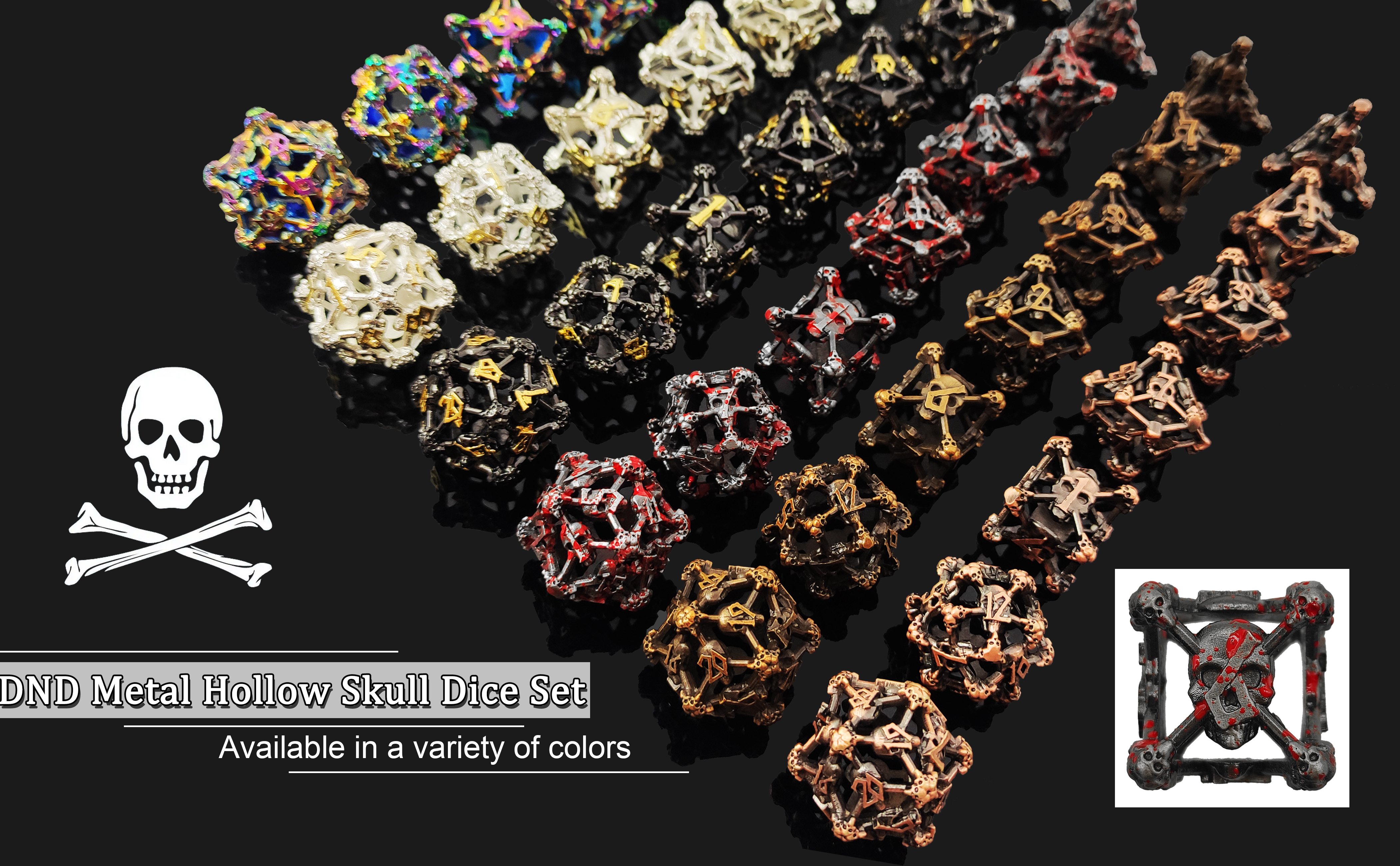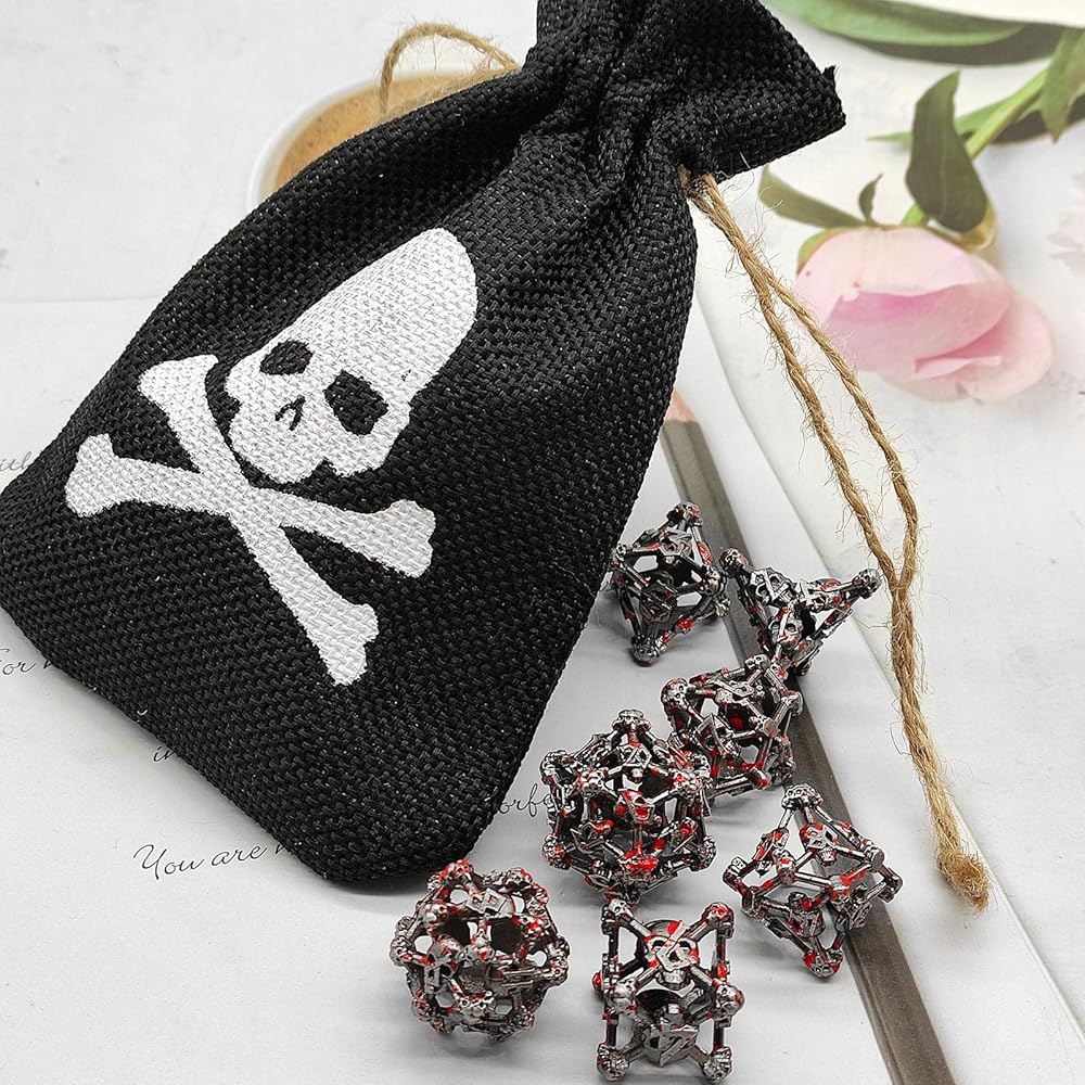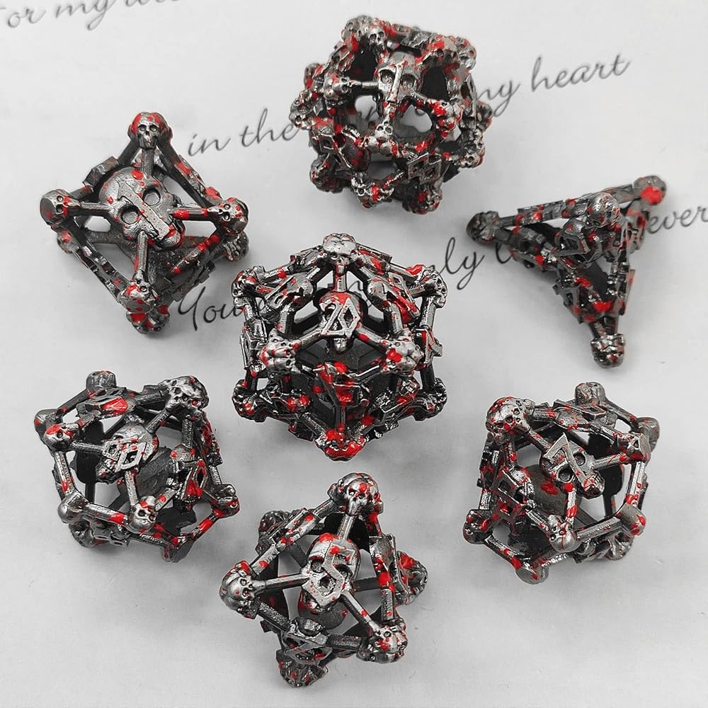 💀【العبوة】: 7 قطع/مجموعة (1 × صندوق تخزين معدني مجاني، تخزين النرد)، بما في ذلك D4، D6، D8، D10، D%، D12، D20