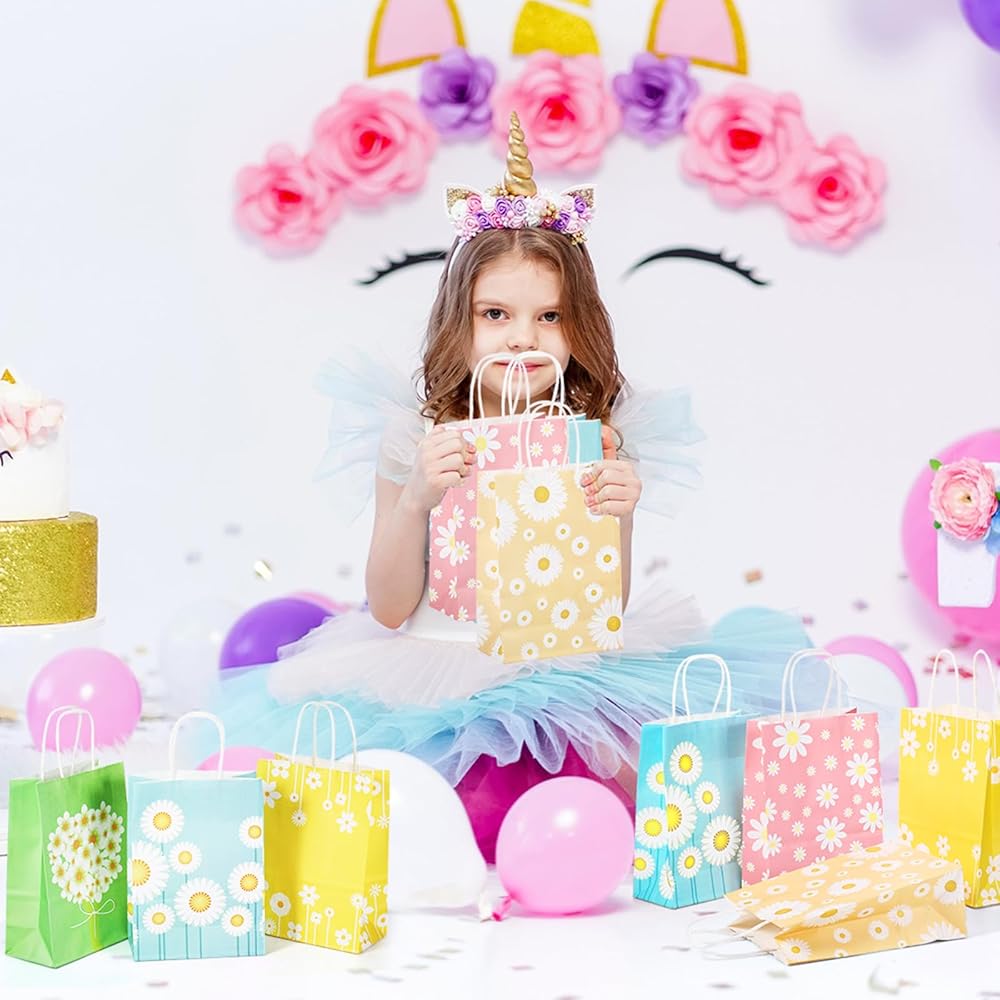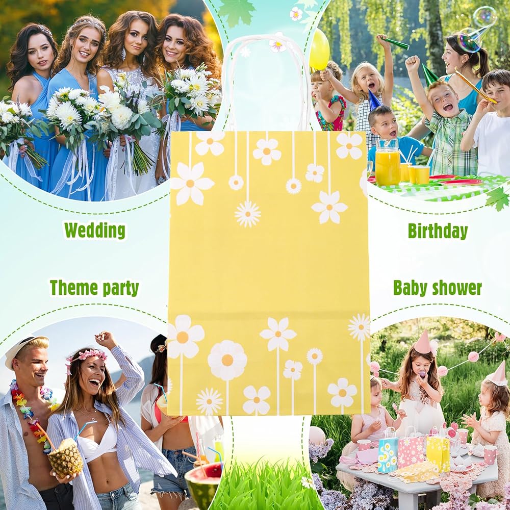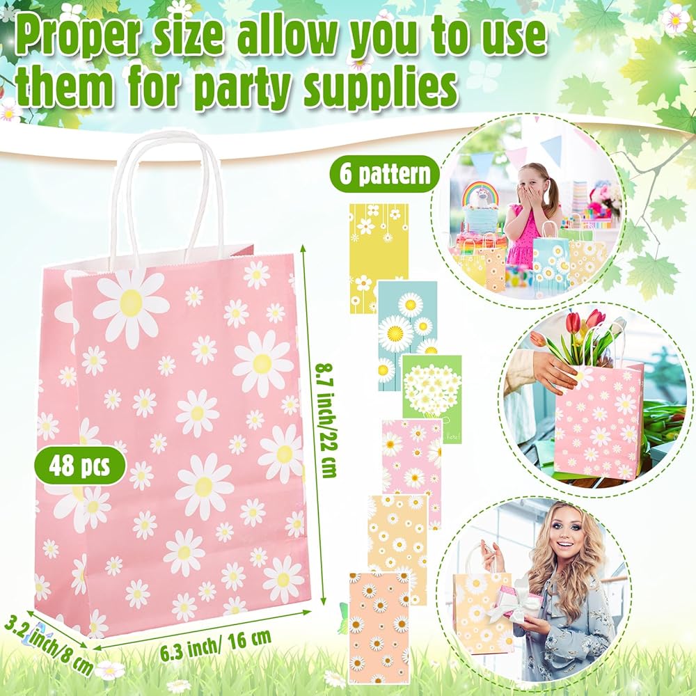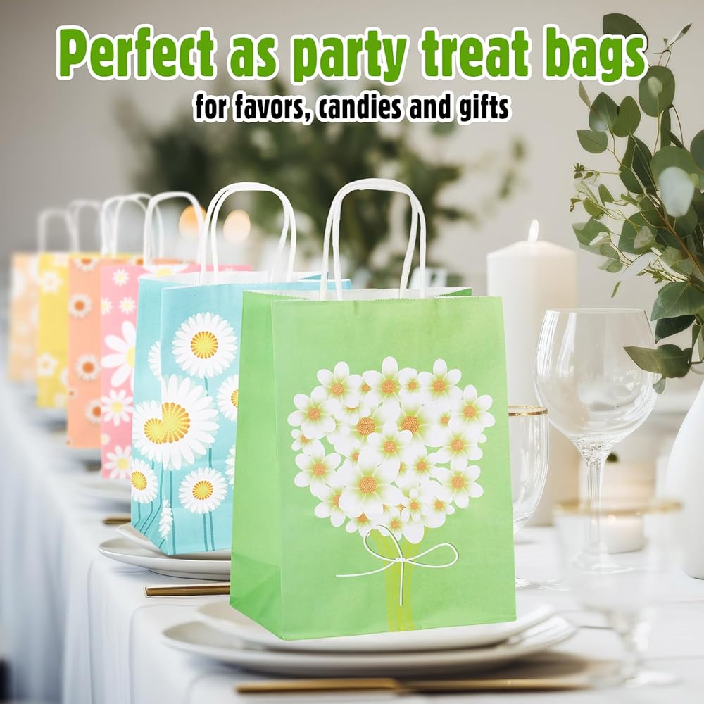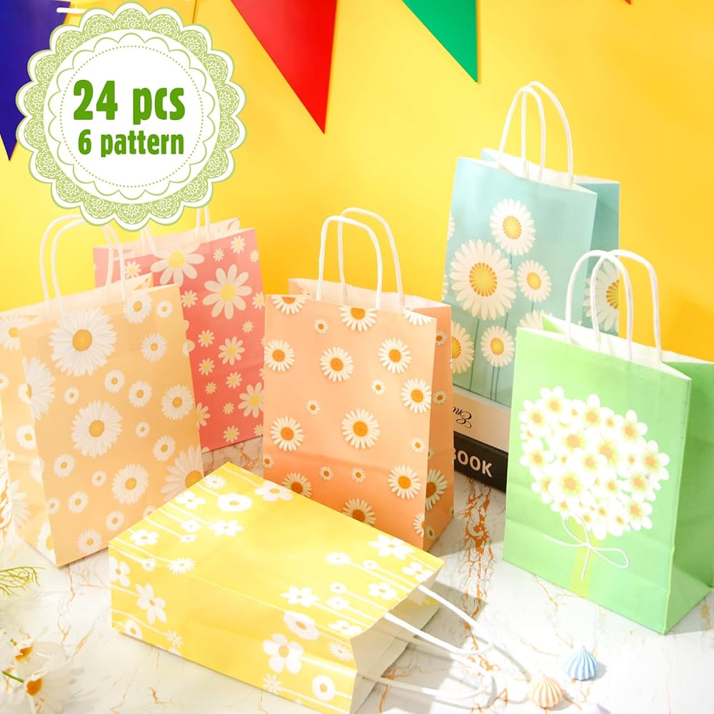 حقائب هدايا على شكل زهرة الأقحوان من Motipuns مع مقابض من الورق المزين بالورود وحقائب هدايا رائعة للحفلات بوهو هيبي جودي لعلاج أكياس الحلوى لأعياد الميلاد وحفلات الزفاف وحفلات الربيع (24 قطعة)