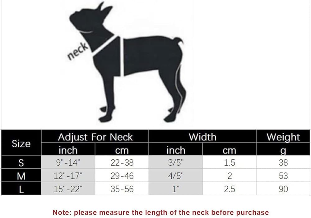 【حجم قابل للتعديل】 S- مناسب للرقبة 9 بوصة - 14 بوصة (22 سم - 38 سم)، عرض 3/5 بوصة (1.5 سم). M - مناسب للرقبة 12 بوصة - 17 بوصة (29 سم - 46 سم)، 3/4 بوصة (2 سم) العرض. L- مناسب للرقبة مقاس 15 بوصة - 22 بوصة (35 سم - 56 سم)، عرض 1 بوصة (2.5 سم). ملحوظة: يرجى قياس محيط رقبة كلبك والرجوع إلى جدول المقاسات الخاص بنا قبل الطلب