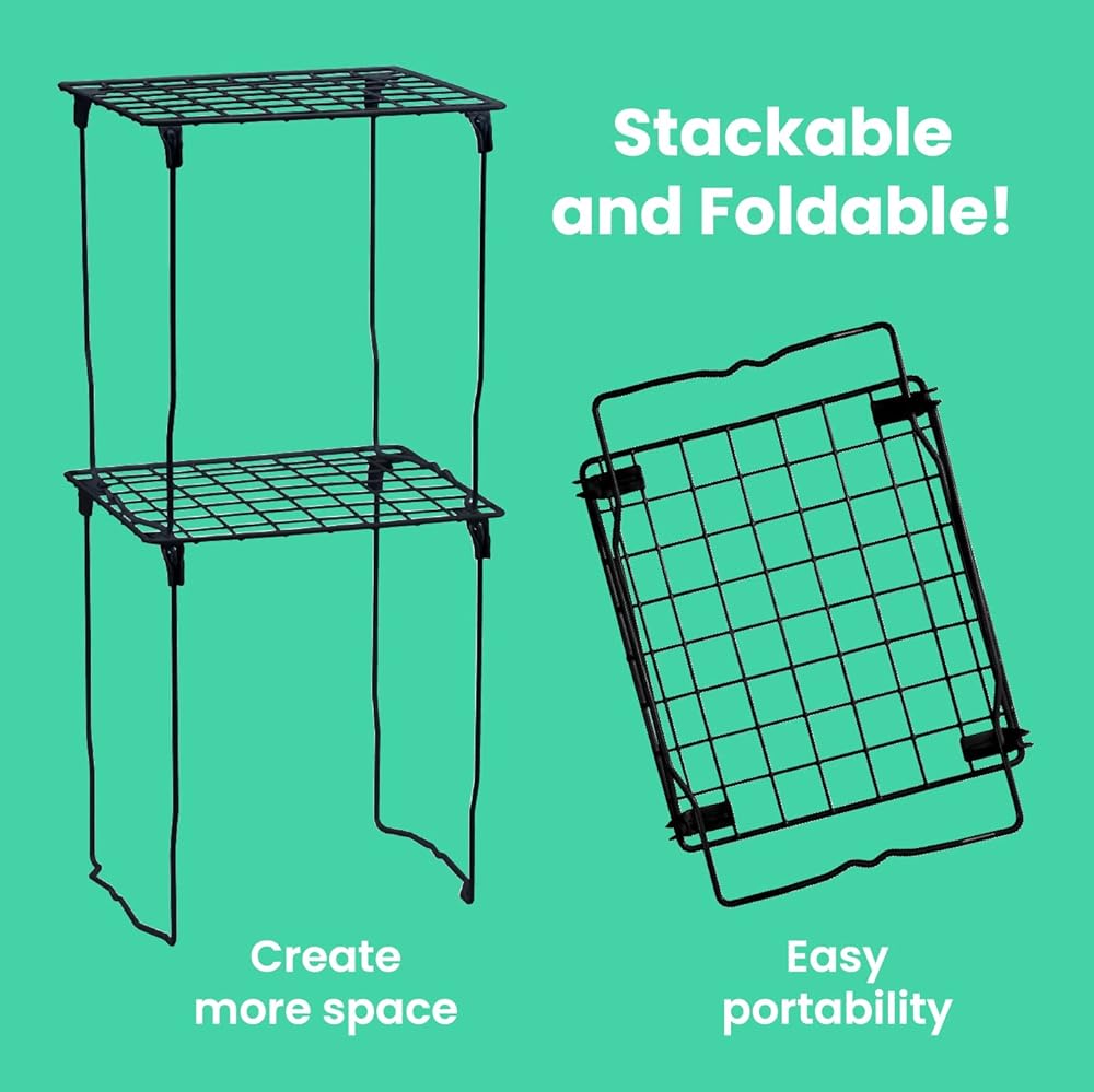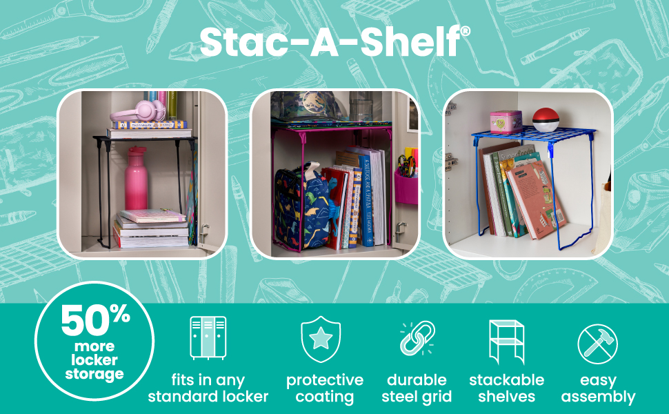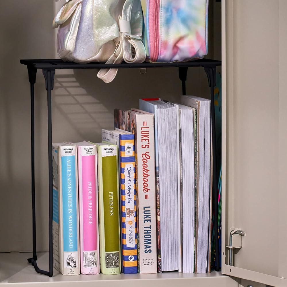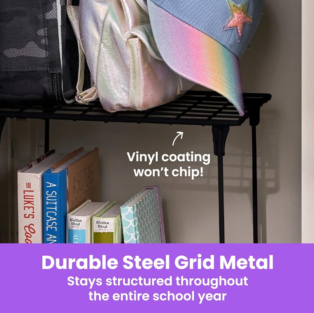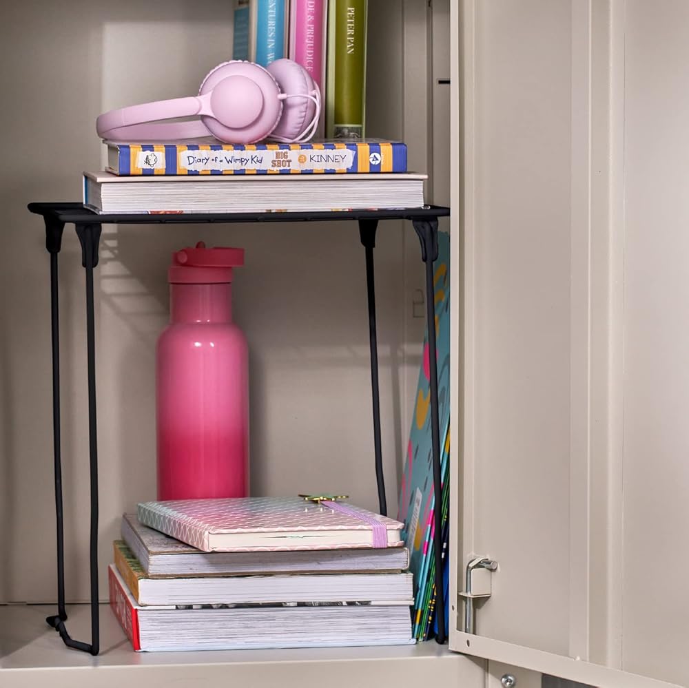 The LockerMate Stac-A-Shelf Stackable Locker Shelf, Black is both adjustable and stackable to help you turn any space into a tidy, organized area! This tool-free wire locker shelf can be easily placed into any standard school, gym or work locker with no assembly required. It can even extend extra tall to a sturdy 12" to give you the most room possible in your locker. It can be used to neatly store your books, binders and other school supplies, and you can even fit multiple shelves within your locker making more shelf space! Add a shelf for your coats and backpack to be easily placed inside your locker and make it easier to find what you're looking for before class. Double your locker space with these double shelves!