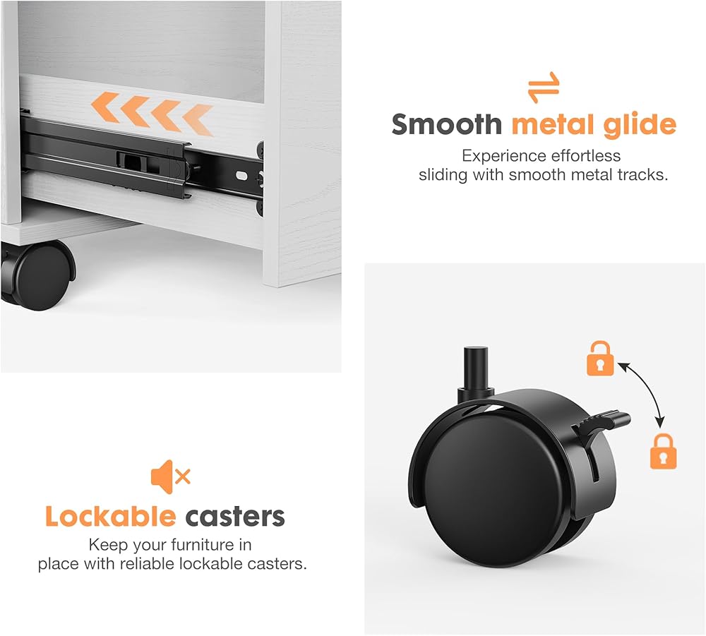 【تصميم مدروس】توجد الأدراج على محمل كروي (امتداد كامل) ينزلق وينزلق ليظل بلا ضوضاء. يمكن فتح الأدراج بالكامل، مما يتيح لك الوصول بسهولة إلى جميع المحتويات، حتى في الخلف. تصميم المقبض المجوف لخزانة الملفات يجعل فتح الدرج أكثر ملاءمة.