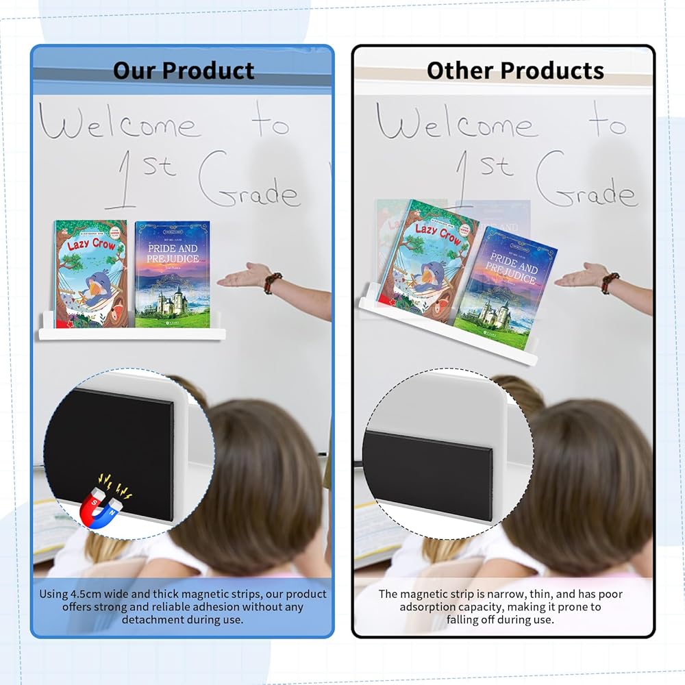 قطعتان من رف الكتب المغناطيسي للسبورة البيضاء، رف كتب مغناطيسي قابل لإعادة الاستخدام، حامل رف كتب مغناطيسي من الأكريليك مع قطعتين من حاوية القلم، رف عرض الكتب لمدرس الأطفال في الفصل الدراسي