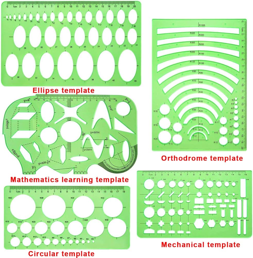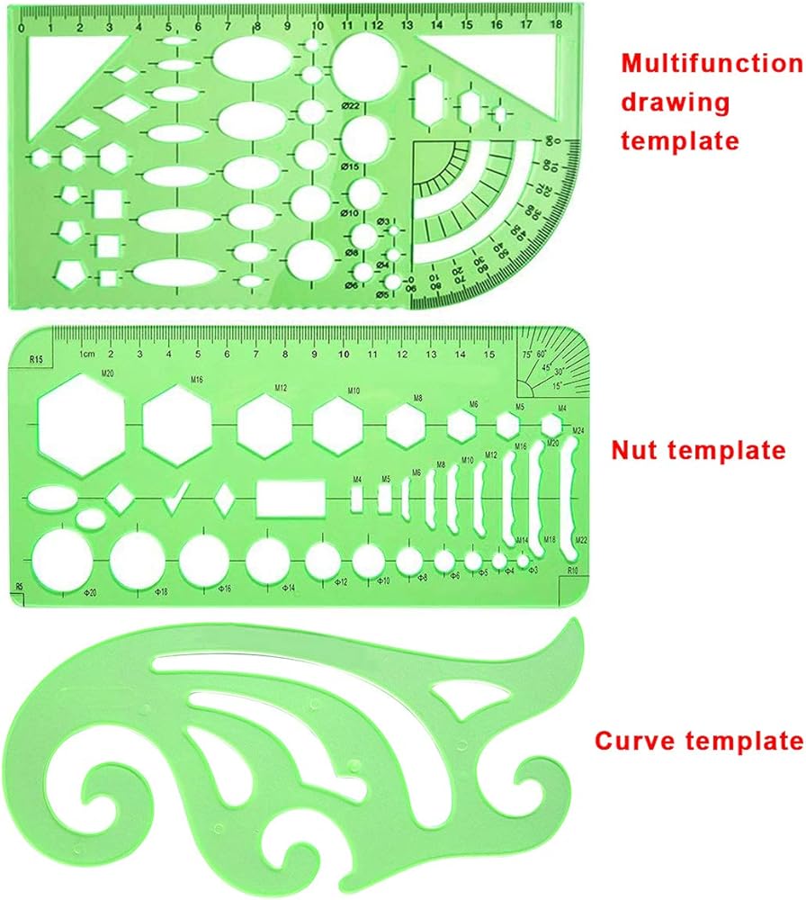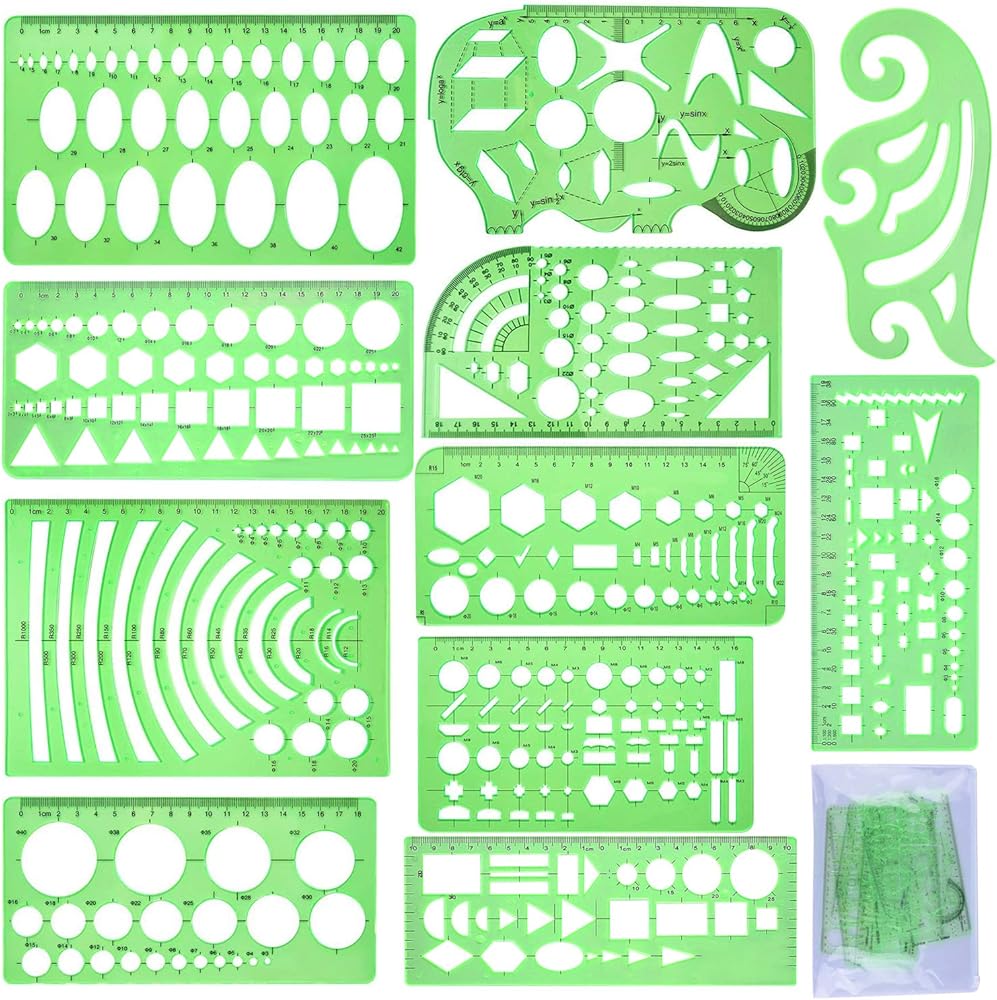 11 قطعة من قوالب الرسم - 1 * قالب منحني، 1 * قالب تقنية الشبكة، 1 * قالب رسم هندسي، 1 * قالب ميكانيكي، 1 * قالب صامولة، 1 * قالب بناء، 1 * قالب تعلم الرياضيات، 1 * قالب دائري، 1 * متعدد الوظائف قالب رسم، 1 * قالب بيضاوي، 1 * قالب تقويم العظام، إجمالي 11 قطعة