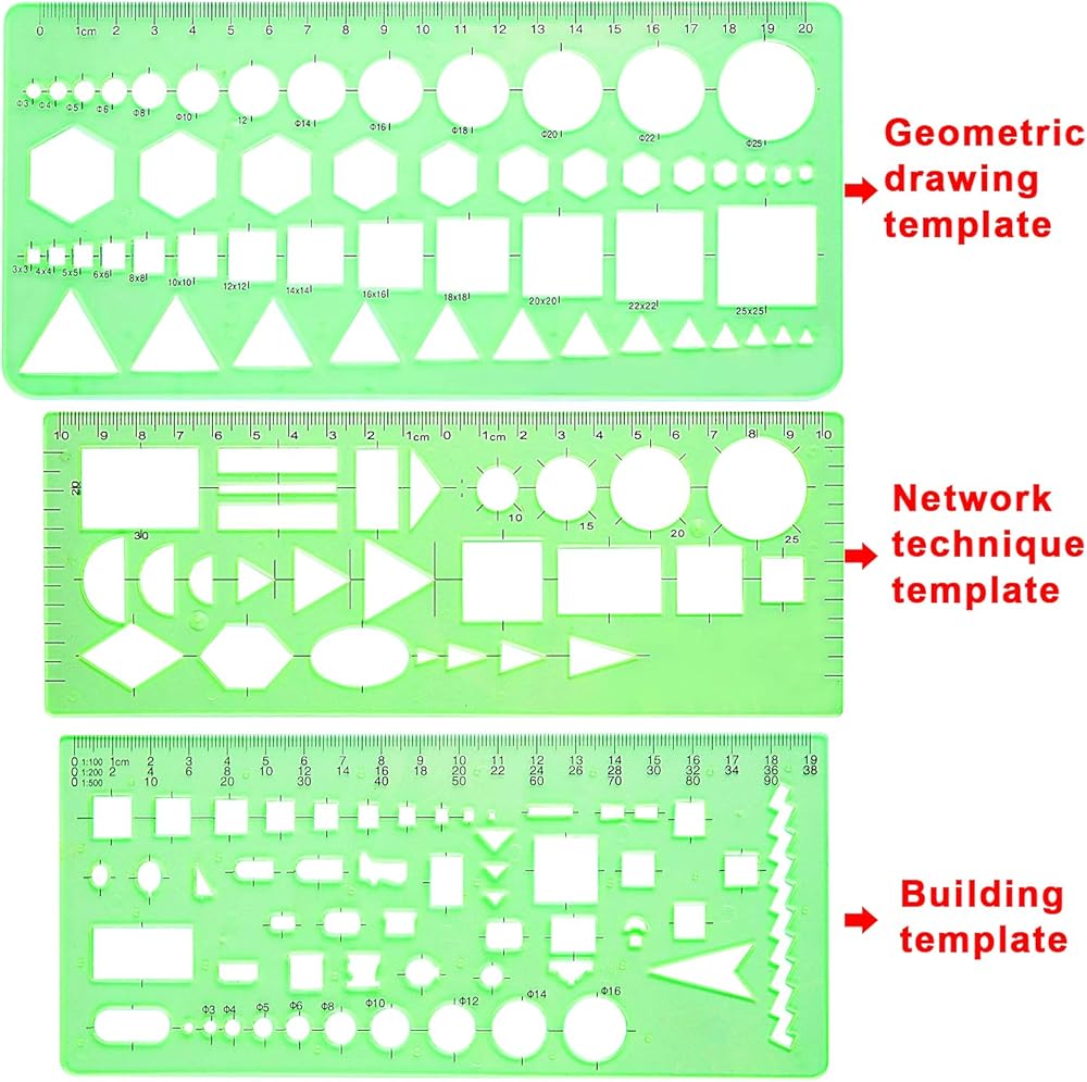 قياس المساطر - اعتماد النظام المتري، واستخدام السنتيمتر كوحدة مقياس؛ 11 قطعة من قوالب الرسم تختلف في المقاسات، ويختلف الطول من 17.8 إلى 25 سم/ 7 إلى 9.84 بوصة، ويختلف العرض من 9.4 إلى 14.7 سم/ 3.7 و5.8 بوصة
