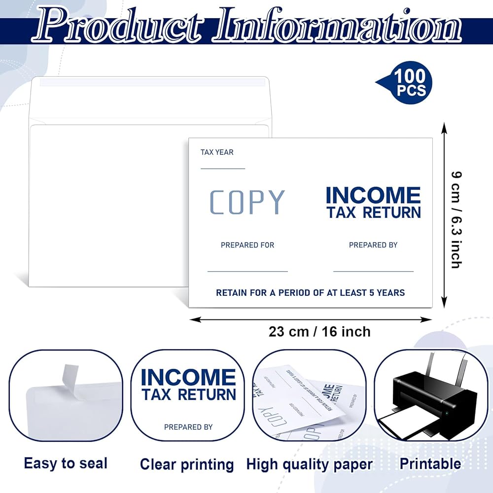 • Large Quantity and Reliable Quality: say goodbye to flimsy, dull envelopes and brighten up your tax return process with our pack of 100 tax return envelopes; We've designed these envelopes with quality in mind, using a robust 23 lb. text weight paper stock to maintain integrity through transit; The vibrant white envelopes will maintain the condition of your important documents, providing the that is needed