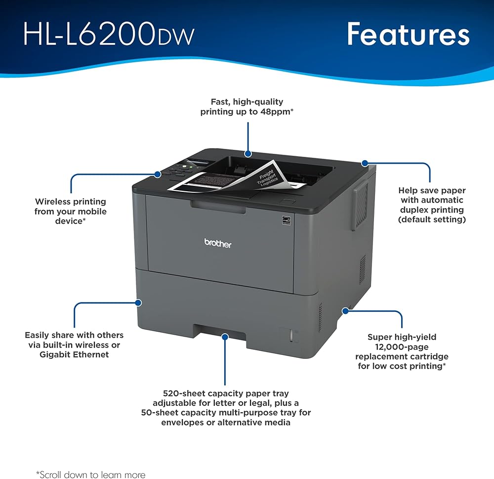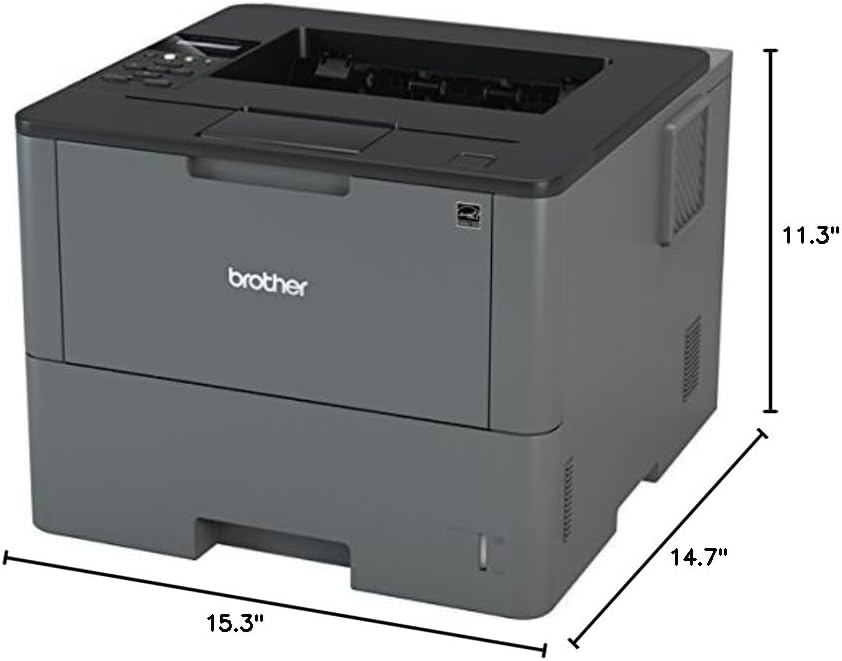 The Brother HL-L6210DW business monochrome laser printer is a great choice for busy offices and workgroups with higher print volumes that need fast, high-quality output, low-cost printing, large paper capacity, and advanced security features. This high-performance printer helps to increase productivity with a fast print speed of up to 50ppm(1). Delivers low-cost printing by using the Brother Genuine TN920UXXL ultra high-yield replacement toner cartridge for 18,000 pages. Includes a Brother Genuine 3,000-page toner cartridge(2). Spend less time refilling paper trays with the 520-sheet capacity paper tray and 100-sheet capacity multipurpose tray for printing on custom media or envelopes(3). Total capacity is expandable up to 1,660 sheets with optional trays(4). Features built-in Gigabit Ethernet and dual band wireless networking to seamlessly set up and share on your wired or wireless network. Easily print from a wide variety of mobile devices(5). Triple Layer Security features help to limit document and device access and protect against network intrusions. ENERGY STAR® certified and EPEAT® Silver rated. Help save paper with default duplex printing. Eco Mode helps to reduce power consumption, while Toner Save Mode helps to reduce toner use. One-year limited warranty with free online, live chat, or phone support for the life of your product. 1 Based on one-sided printing. Change from default setting required. 2 Approximate toner cartridge yield in accordance with ISO/IEC 19752 (letter/A4). 3 Maximum capacity based on using 20 lb. paper. 4 Requires additional purchase. 5 Additional download required. Compatibility may vary by device or operating system. Wireless connection may be required.